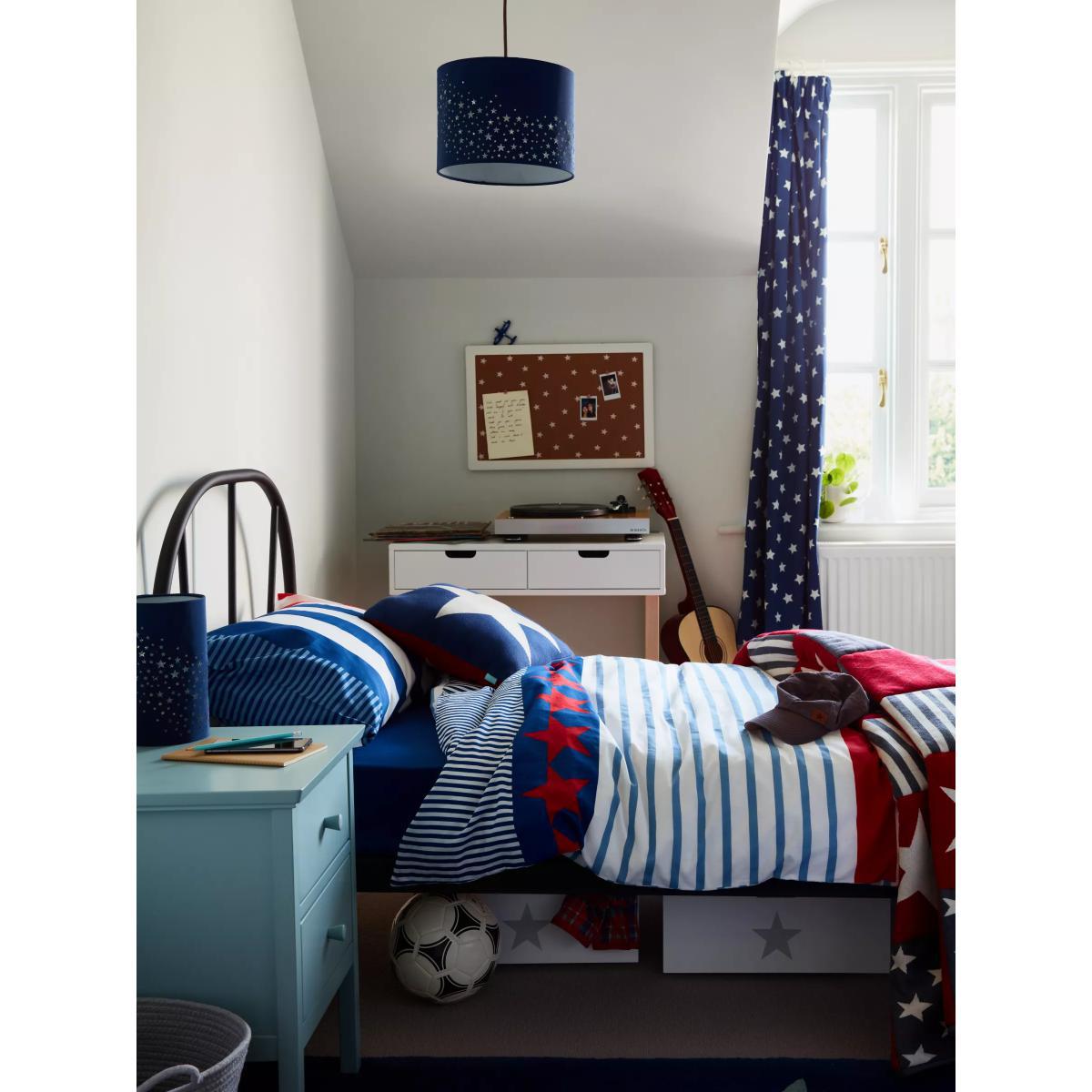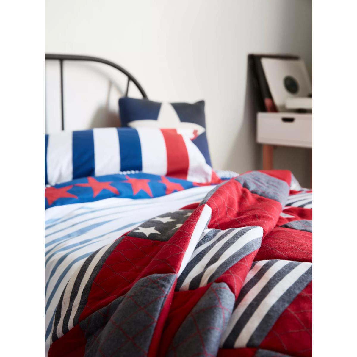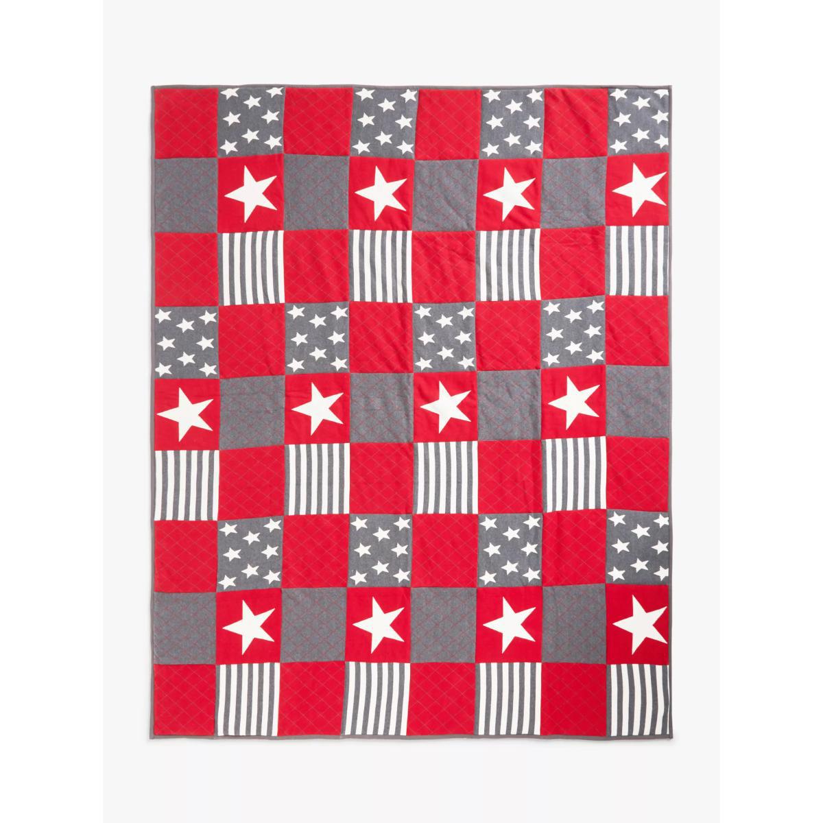 Stars, stripes and a cool patchwork pattern make this cosy bedspread an essential layer for their bed. It's made from soft cotton and filled with polyester, so it will help to keep them warm and comfortable when it's chilly at night. More Sustainably Sourced The cotton in this quilt has been produced in line with the Better Cotton Initiative (BCI). This is a not-for-profit organisation which exists to ‘make global cotton production better for the people who produce it, better for the environment it grows in, and better for the sector’s future. BCI works with partners around the world such as WWF, Solidaridad and Cotton Connect to train farmers to produce cotton more sustainably. By buying cotton products from John Lewis & Partners, you’re supporting the training of these farmers to use water efficiently, care for the health of the soil and natural habitats, reduce the use of the most harmful chemicals and apply principles of fair and decent work.