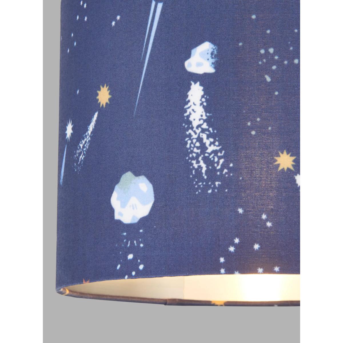 Let your Space adventure begin! Land among the stars and see the asteroids pass by with this Space-themed faux linen shade - the addition of a metallic silver liner reflecting the light adding extra starry glow. This multi-purpose lampshade is designed with a reversible gimbal, so it can be hung from the ceiling, or installed on a table or floor lamp base. Ideal for the rooms of the young explorers of the universe.