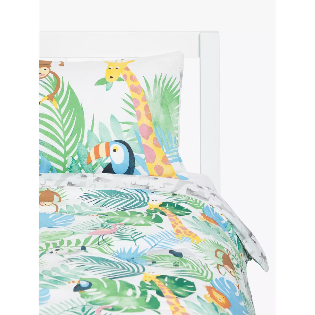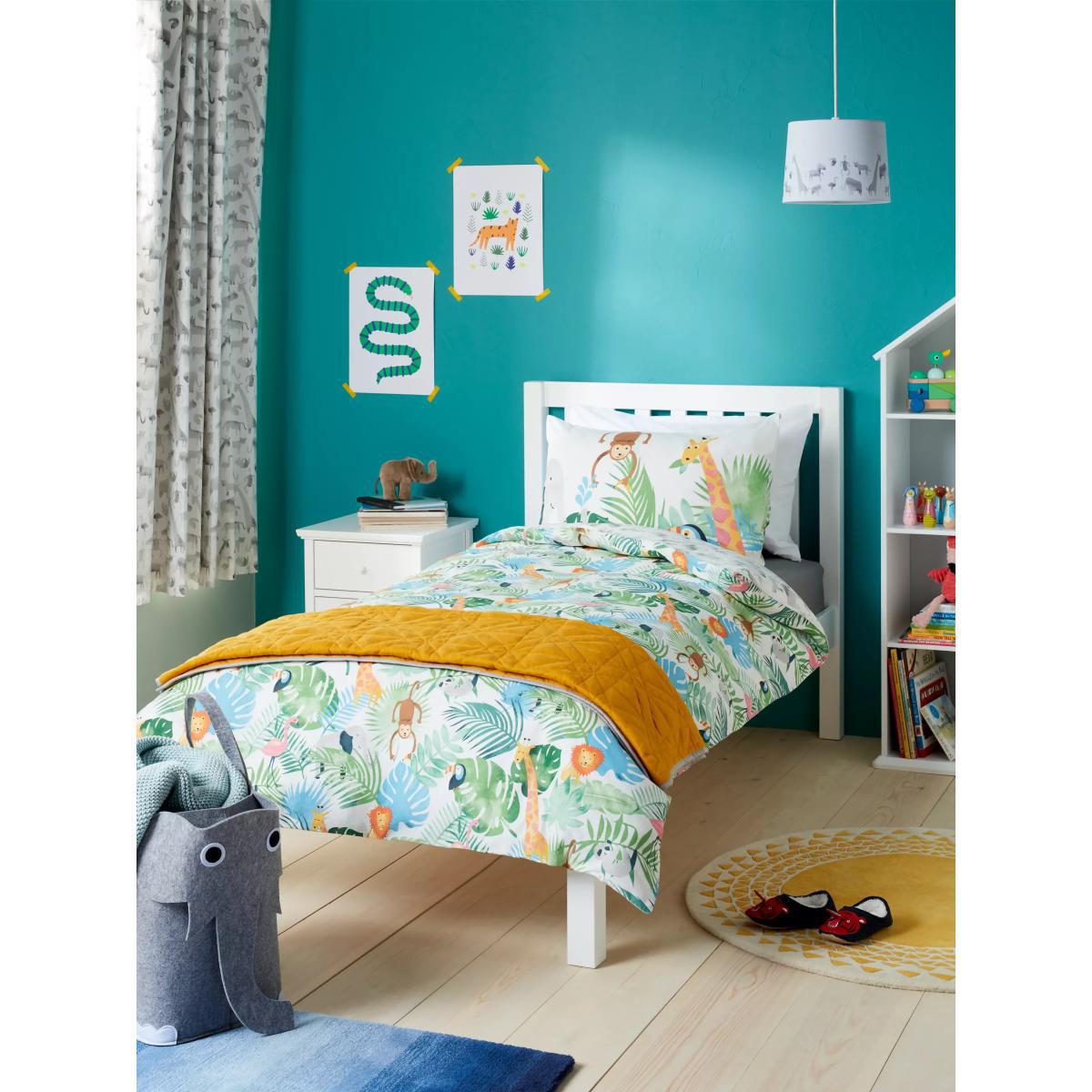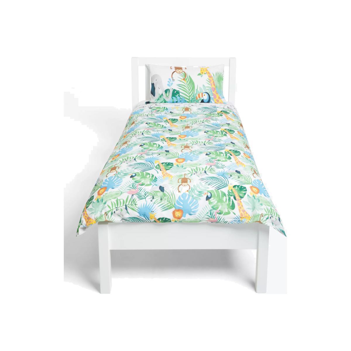 Friendly faces amongst forest settings, our Safari & Friends range boasts vibrant patterns and vivid colours. Let them dream of sunny temperatures and adventurous days, as each safari character emerges from their lush green setting. A perfect choice for brightening up their bedrooms. This colourful duvet cover and pillowcase set is made from pure cotton that has a soft handle and breathable feel. It features a secondary safari print on the reverse in a contrasting monochrome, allowing you to change their sleep setting after every wash! Have you thought about sheeting? Shop here