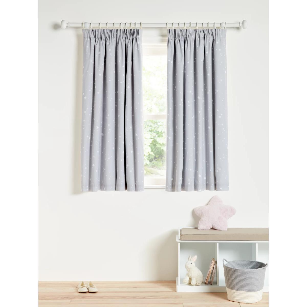 Made from high-quality cotton and polyester with an effective blackout coating, this pair of children's curtains are designed with a dazzling star print. The pencil pleat design gives them a smart appearance and the pattern is easy to style in bedrooms for both young children and early teens. The blackout coating helps to block out distracting sun beams or street lights. The width dimension refers to the width of each individual curtain in the pair. More sustainably sourced The cotton in these curtains has been produced in line with the Better Cotton Initiative (BCI). This is a not-for-profit organisation which exists to ‘make global cotton production better for the people who produce it, better for the environment it grows in, and better for the sector’s future. BCI works with partners around the world such as WWF, Solidaridad and Cotton Connect to train farmers to produce cotton more sustainably. By buying cotton products from John Lewis & Partners, you’re supporting the training of these farmers to use water efficiently, care for the health of the soil and natural habitats, reduce the use of the most harmful chemicals and apply principles of fair and decent work. Do you need a curtain pole and accessories? Shop.