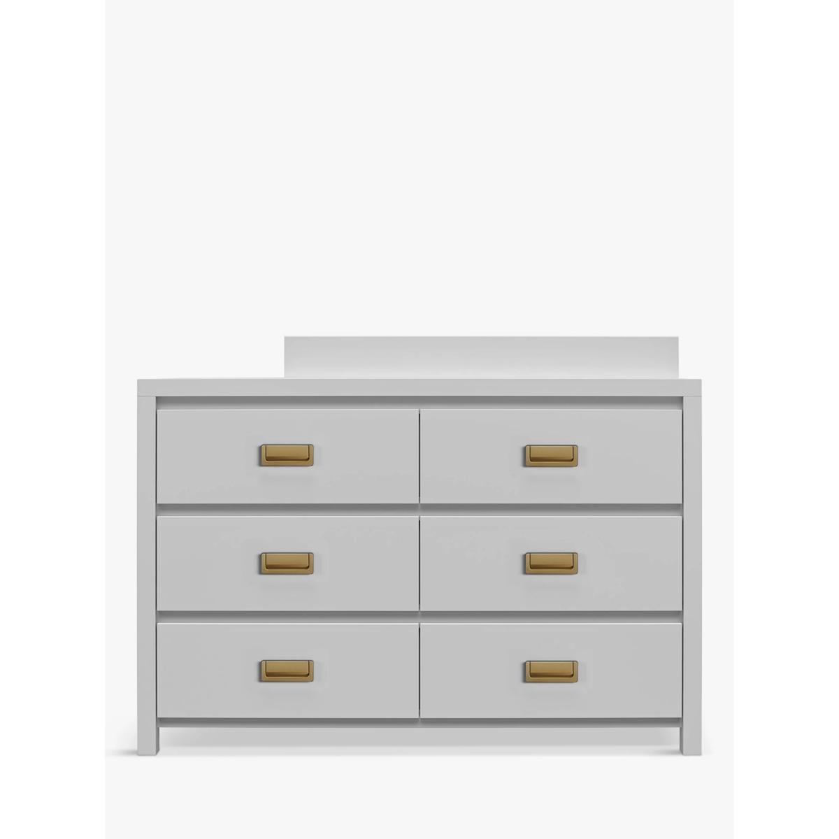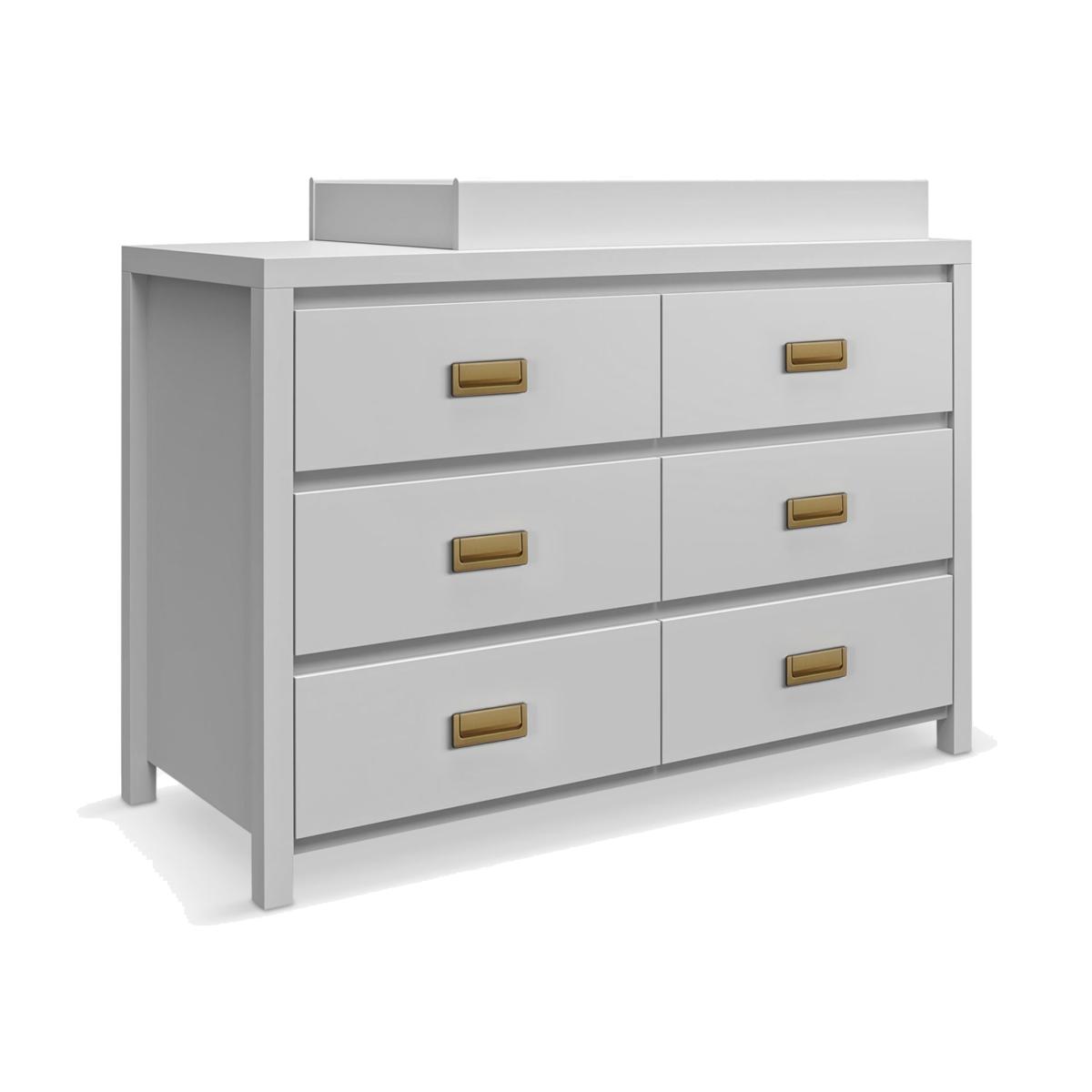 With its clean white finish and fashionable gold drawer pulls, this campaign-style dresser with change table topper will be the perfect storage solution for your baby's nappy-changing necessities. It features durable metal drawer slides with built-in stops for safety and the change table topper fits a standard size changing pad (not included). Once your little one outgrows the changing table, simply remove the topper to convert to a kids' dresser.