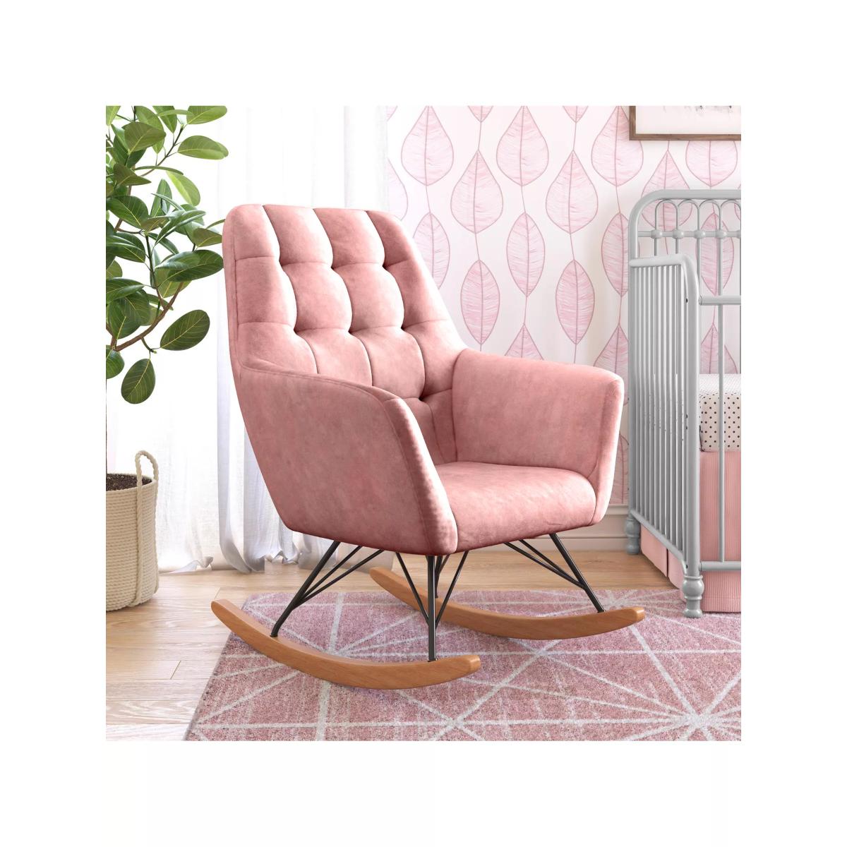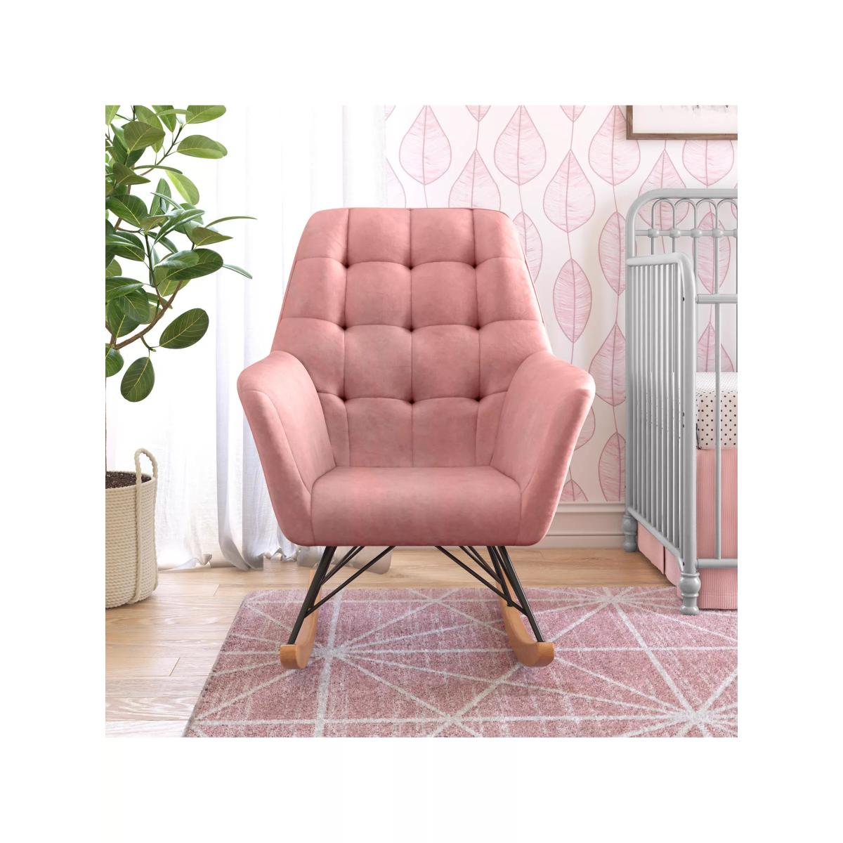 A nursery rocking chair is an integral part of any nursery. The to-and-fro motion of rocking while feeding comforts and relaxes both you and your little one. Let the Little Seeds Raven Upholstered Nursery Rocking Chair soothe in trendsetting style. Beautifully upholstered in easy-to-clean, durable faux velvet with square tufted detailing on the back seat, this sturdy rocker also features a large, contouring back with metal legs and a wooden base rocker.
