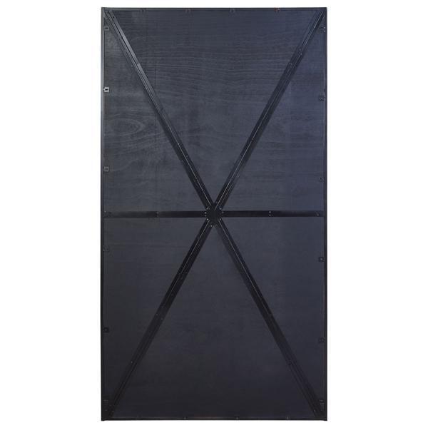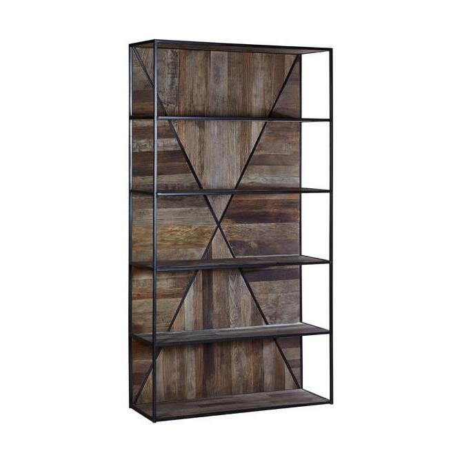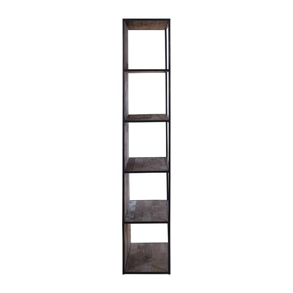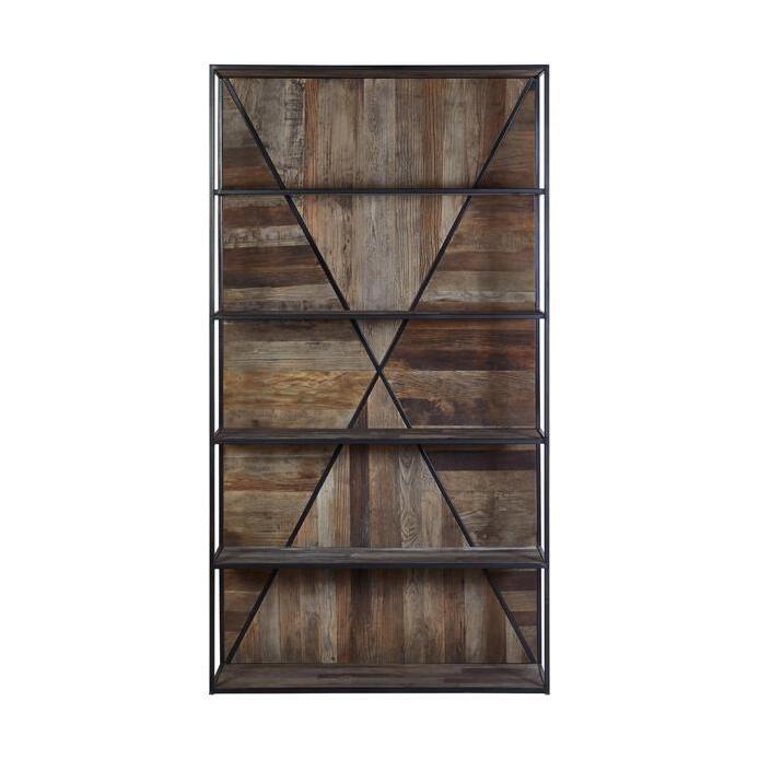 This boho-inspired shelf unit features five wide display shelves. It's made from differently-toned strips of elm wood, their alternating shades and grain patterns lending depth to this substantial unit. The supporting frame is formed from minimal strips of tough black iron, some of which is integrated into the wood at the back in a cross formation.