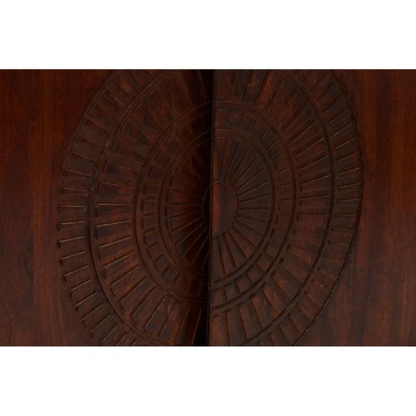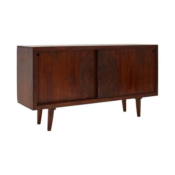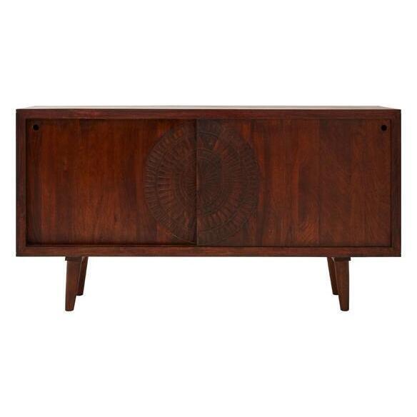 Sitting atop four cylindrical legs, the Venice sideboard features two large sliding doors. Crafted from sustainable mango wood, the sideboard is rich in colour and boasts prominent graining that results in attractive and distinctive patterns. An exotic, traveller-style pattern is carved into a circle on the central section of the sideboard's facade.
