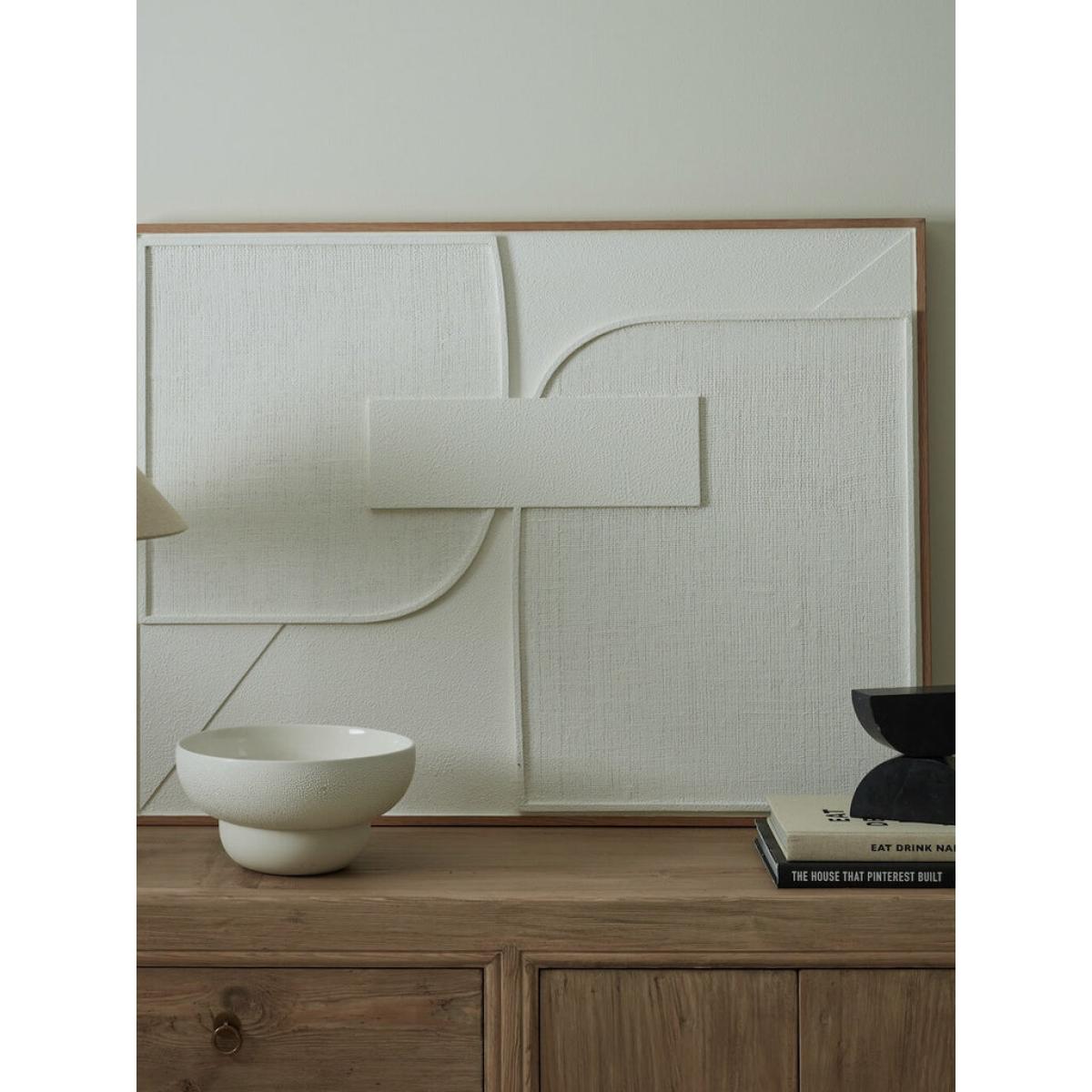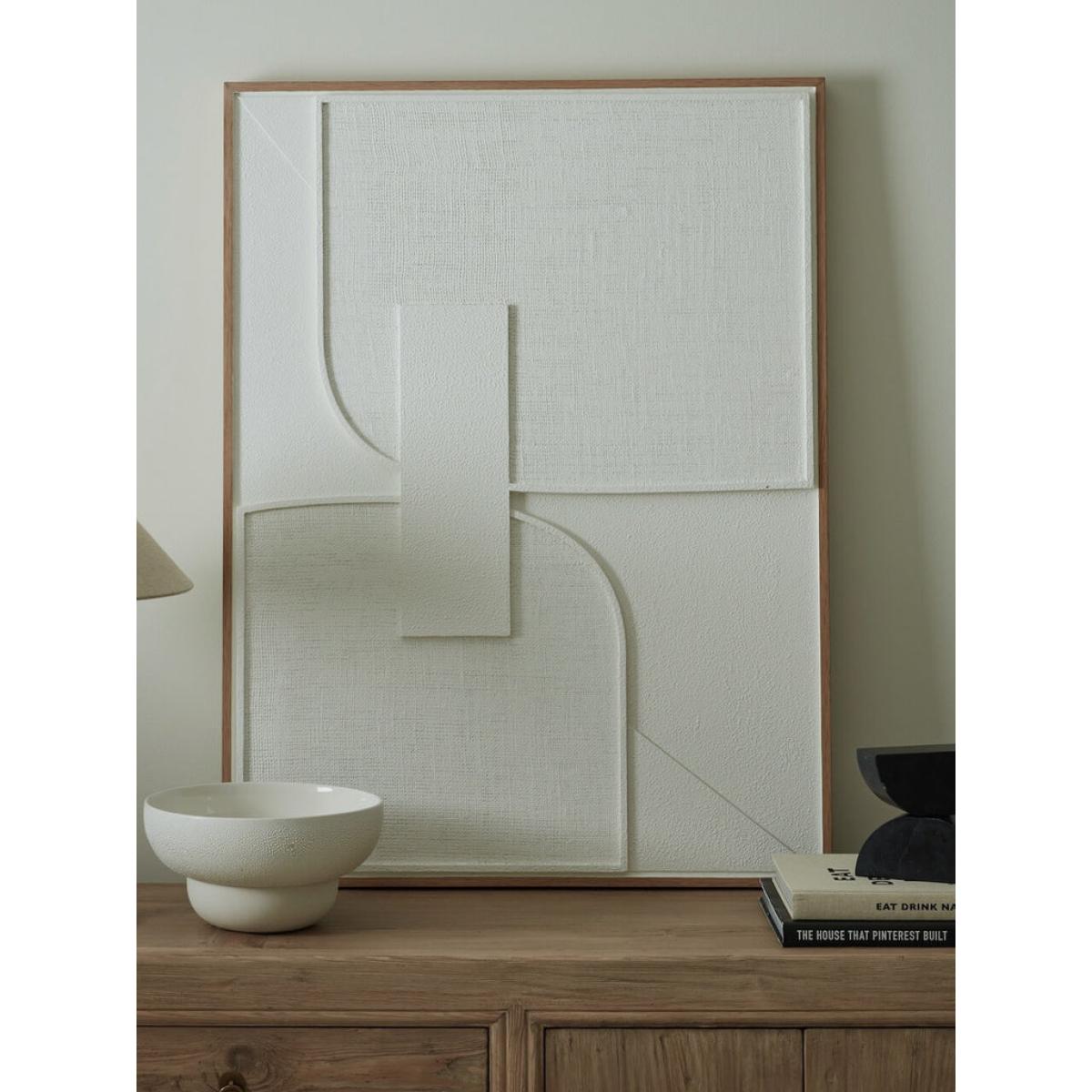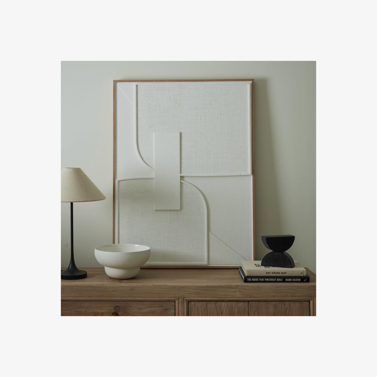 I really like this piece because of its minimalist and modern appeal. The white wall art works particularly well in contemporary or Scandinavian interior styles, where clean lines and understated elegance are key. It’s versatile enough to be a focal point above a console table or sideboard, especially when paired with neutral or muted colour schemes. Practical styling tips include framing it with simple, solid-colour furnishings and adding subtle textures-like soft throws or natural wood accents-to create a balanced, calming space. Its understated palette makes it an ideal background piece that won’t compete with other decorative elements, allowing it to complement a variety of interior settings effortlessly.