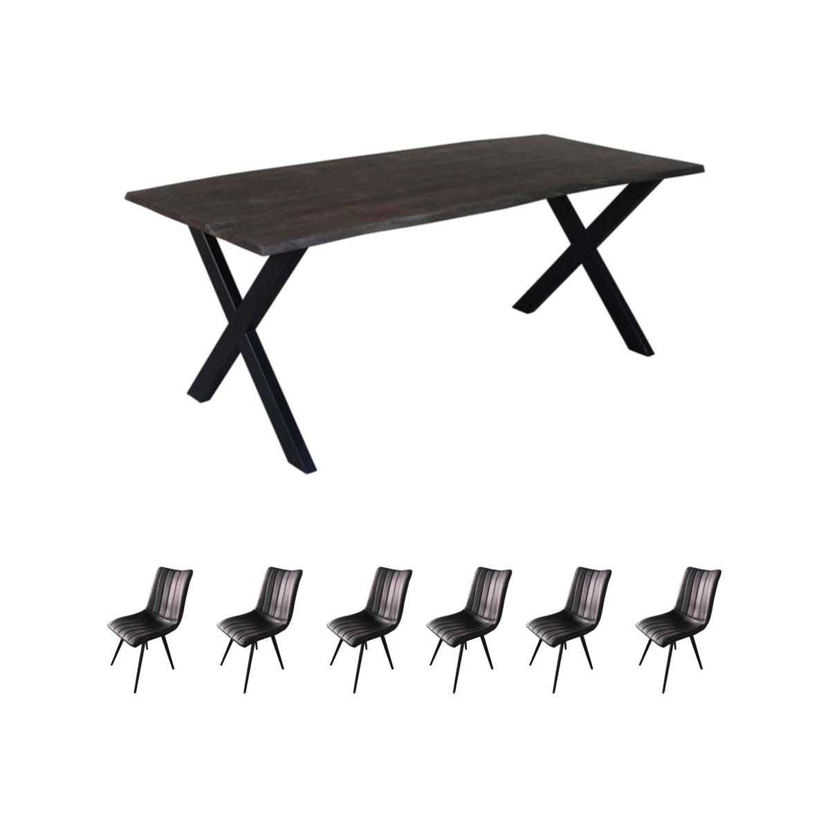 Upgrade your dining room with this handmade acacia wood live edge table that features striking cross metal legs. Its unique shape and rustic feel add an organic touch to your space, while the modern legs give it a sleek, contemorary look. With dimensions of 200x100x78 CM (LxDx. H), this large table provides plenty of room for family and friends to gather 'round. The matt grey finish enhances the wood's natural beauty, making it a one-of-a-kind piece. Simple assembly means it's easy to set up. Enjoy dining with friends with the included vegan leather chairs featuring vertical accent stitching for a chic aesthetic.