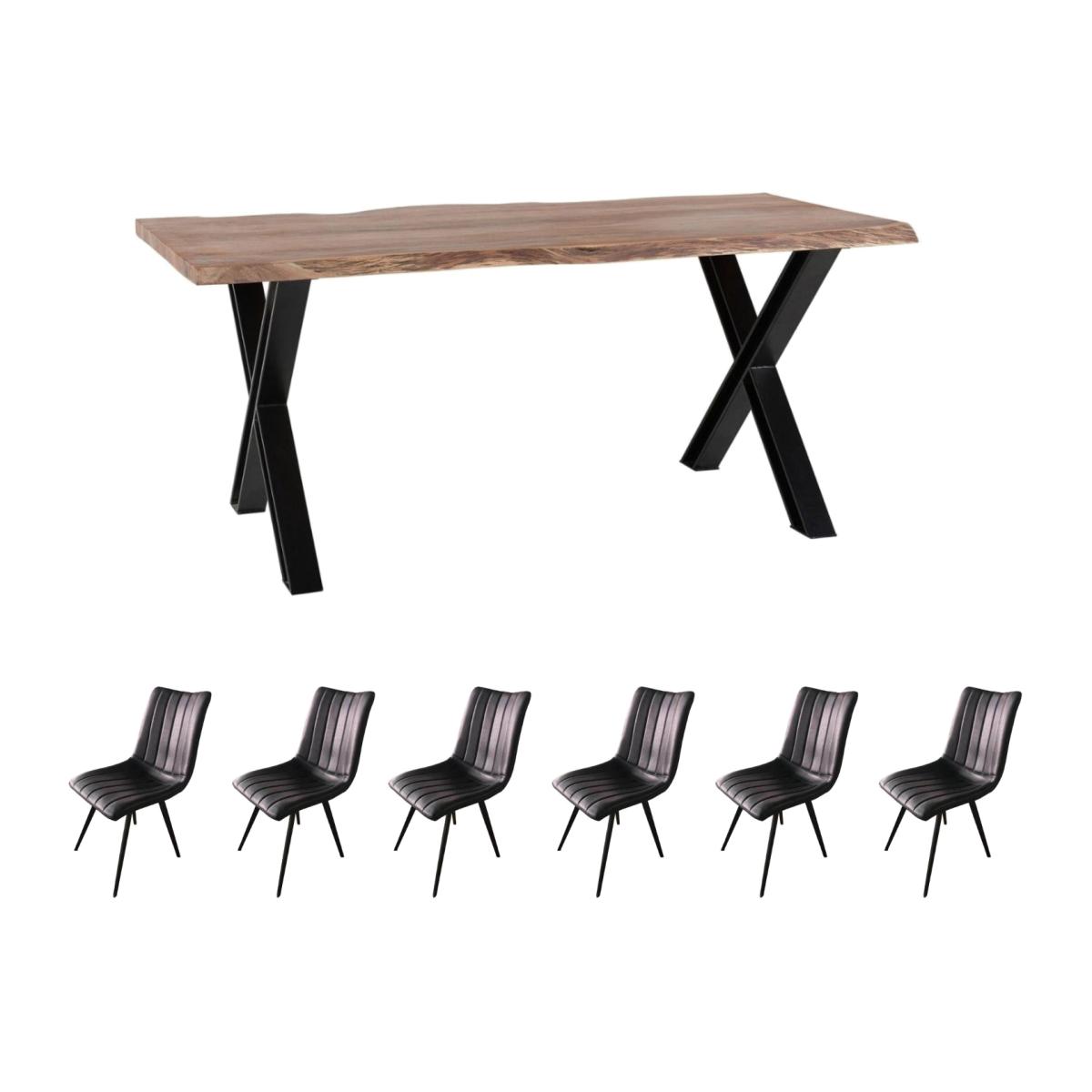 Upgrade your dining room with the Handmade Live Edge Large Acacia Wood Dining Table w Cross Metal Legs. This stylish piece is crafted by hand made from high-quality acacia wood, providing long-lasting use. Its Live Edge design preserves the wood's natural shape beauty, while the contemporary Cross Metal Legs give it a sleek look. Dimensions 200x100x78 CM (LxDx. H). Finished in a beautiful matt grey color that accentuates the natural wood, it's easy to assemble a unique addition to any space. Also included are 6 modern-style chairs with vertical accent stitching. Soft vegan leather seats provide perfect comfort, while easy-cleaning ensures effortless upkeep. Transform your dining room with this stunning set today!