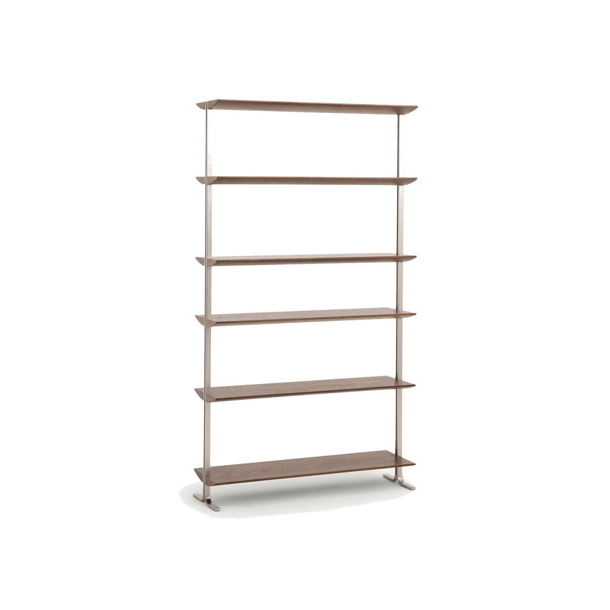 A constructivist, metallic and ethereal silhouette. With finesse, the Livel bookcase reflects architectural and industrial influences. Its minimalist base, in satin nickel flat iron, forms two parallel steel ribbons playing with reflections and light.. Inlaid in the thickness of the shelves, it brings a play of balance to the whole and highlights the thick chamfered shelves, evoking the wings of an airplane. Each module can be installed alone or associated with another element of the range to create a larger set. A discreet linking system allows you to attach several modules together. An AMPM exclusive. Product Details • Satin nickel finish steel structure • 6 fixed shelves in FSC® walnut veneered MDF with nitrocellulose finish. Chamfered edges. • Wall brackets (screws and dowels not supplied). • Ring supplied (see instructions) to fix together several elements of the range together. Dimensions • Width: 100cm • Height: 182cm • Depth: 31cmDelivery:. Assembly required. Available for home delivery. Note! Please check that all access points are large enough to accommodate your delivery (doors, stairs, lifts). • WOOD FROM SUSTAINABLY MANAGED FORESTS. FSC® certified wood comes from forests that are environmentally, socially and economically well managed. Dimensions and weight of parcel2 parcels • L193 x H12.5 x D37cm. 17kg. • L108 x H32 x D39cm. 41kg.