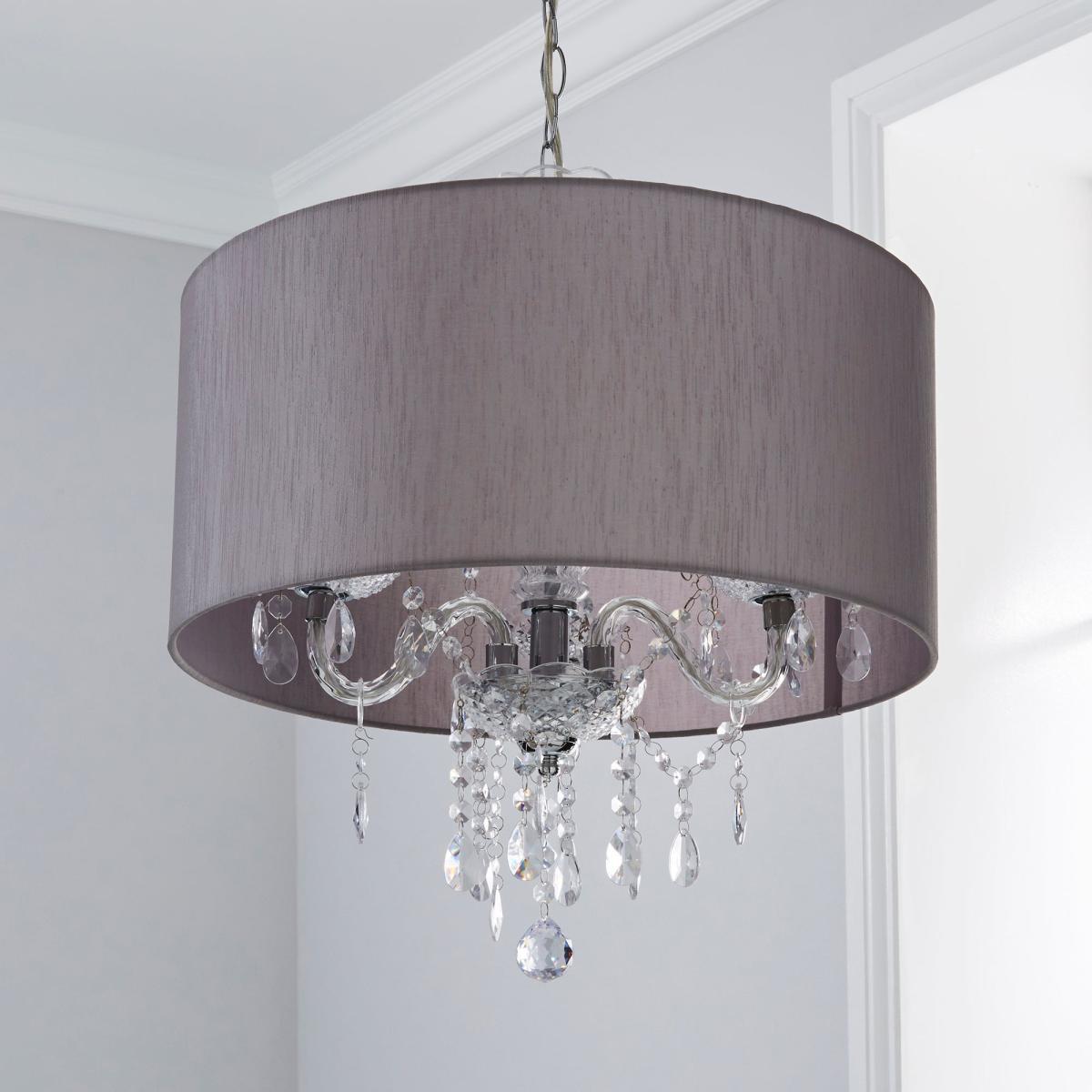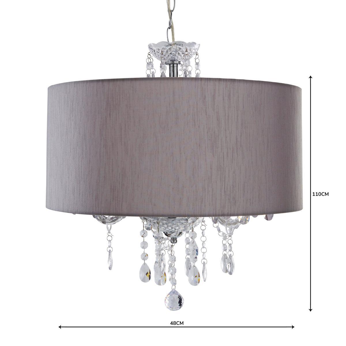 Presenting a luxurious design, the Livia 3 light ceiling fitting, or "Chandelier", features a stunning Marie Therese style, crafted with stunning cascading clear acrylic drops. Complete with a faux silk, silver-coloured shade and a chrome fitting, this light is sure to bring an opulent feel to any space. This piece is dimmable compatible, making it both an attractive and practical product. Click. Here. To purchase the recommended bulb.