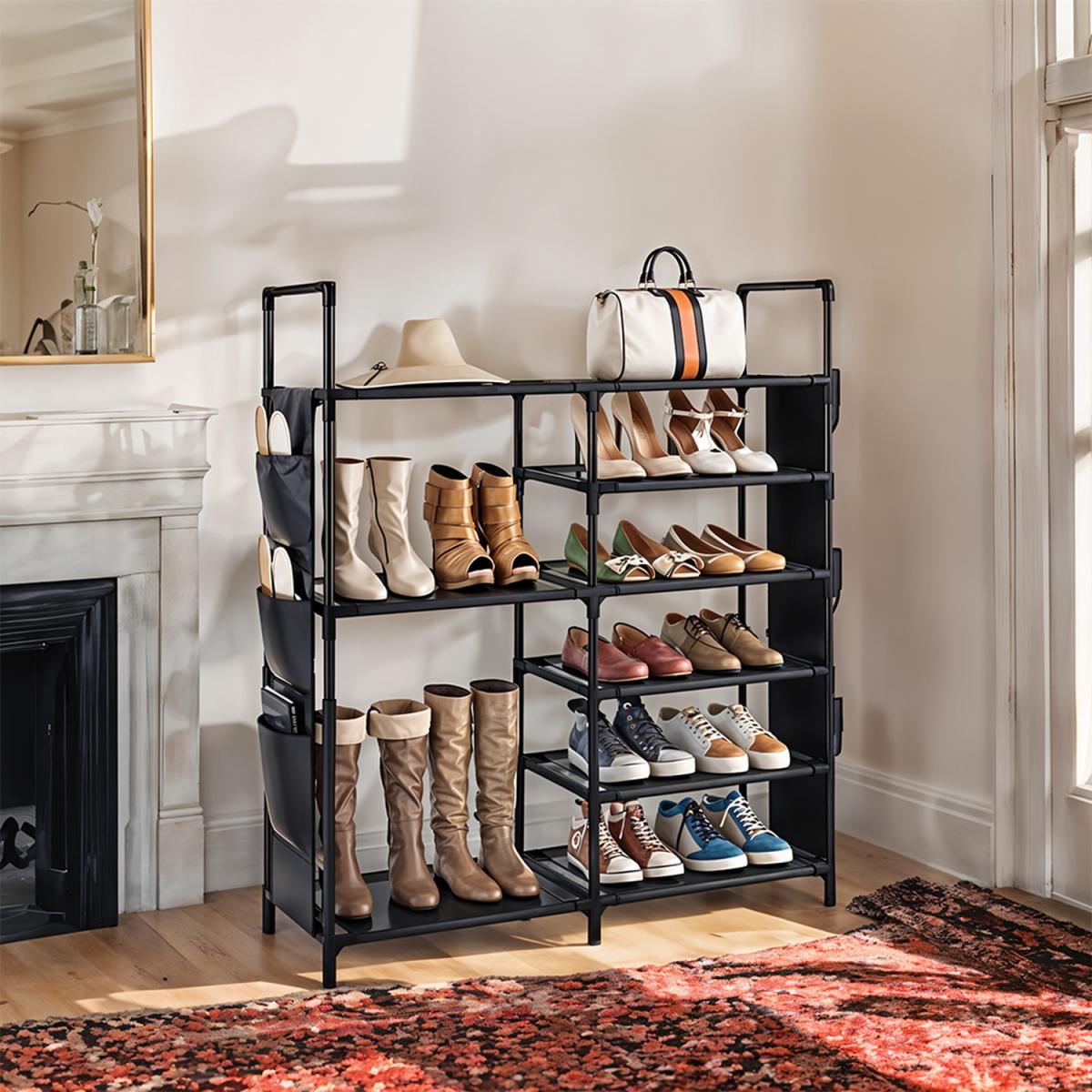 Organise your footwear efficiently with this 7-tier shoe rack, designed to accommodate various shoe types, from trainers to boots. The double-row layout maximises storage capacity, making it ideal for families. Breathable non-woven fabric shelves promote airflow, keeping shoes fresh. A sturdy steel-pipe frame ensures durability, while the lightweight design allows for easy repositioning. Additional side pockets provide convenient storage for accessories like keys and shoe care items.