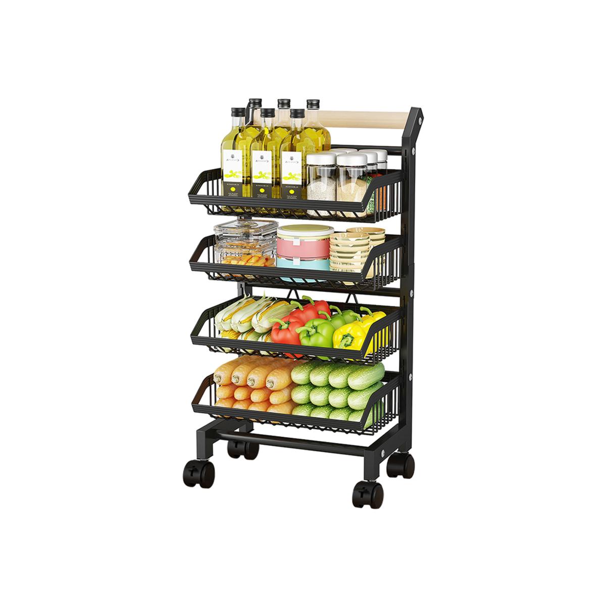 Enhance your kitchen organisation with this multi-tier kitchen trolley. Constructed from durable carbon steel, it offers robust support for various kitchen essentials. Each basket features a drainage design, ensuring items remain dry and hygienic. The adjustable tier spacing accommodates items of varying sizes, providing flexibility in storage. Equipped with universal wheels and a wooden handle, it ensures easy mobility and adds an elegant touch to your kitchen decor.