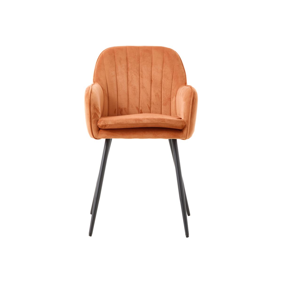 I love this set of two dining chairs for their bold colour and contemporary design. The vibrant orange upholstery instantly adds warmth and personality to a dining space, making them great as statement pieces in modern or eclectic interiors. Their black iron legs provide a sleek, industrial touch that can balance more traditional or minimalist decor. Practical styling tips include pairing them with neutral-toned tables to let the chairs stand out or mixing their boldness with patterned cushions or accessories for a lively, inviting atmosphere. These chairs work well in casual dining areas or even as accent pieces in a lounge or bedroom corner, offering both style and comfort with their well-crafted silhouette.