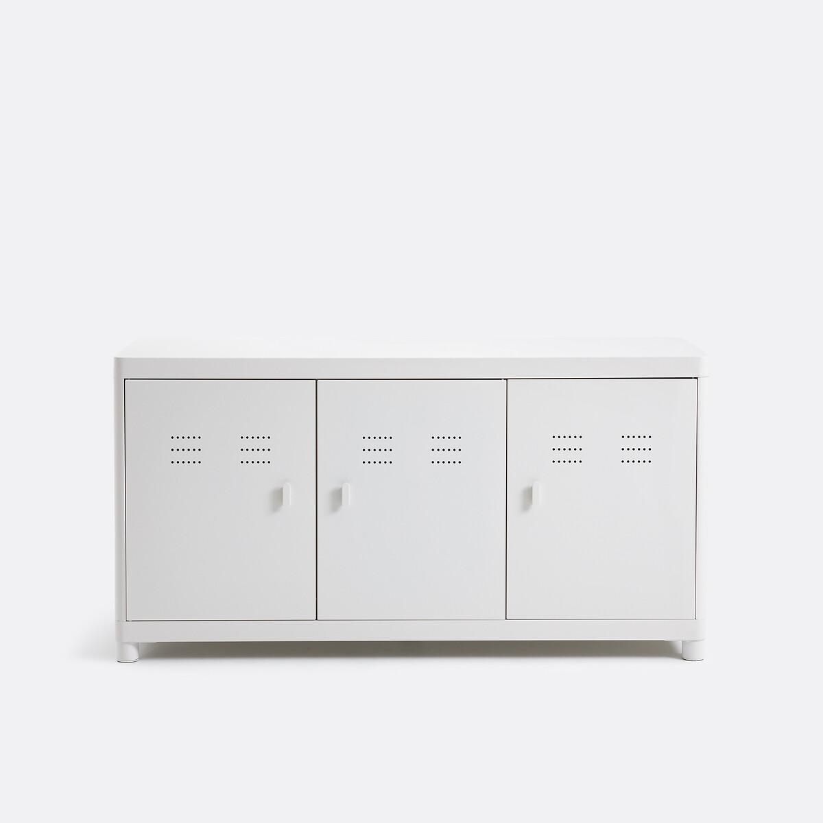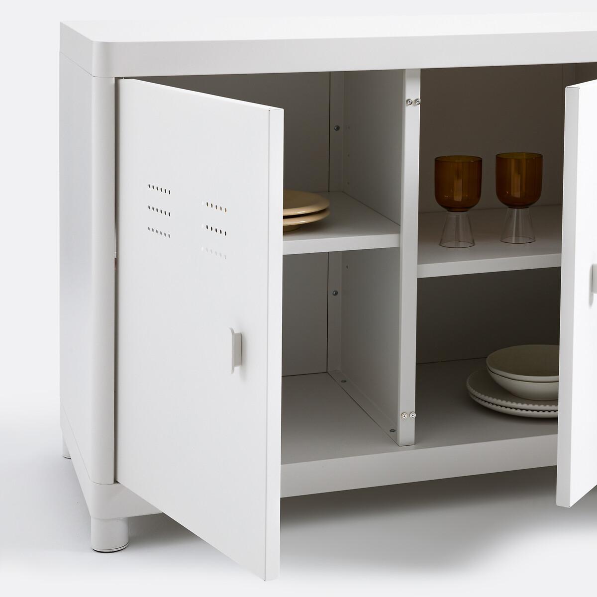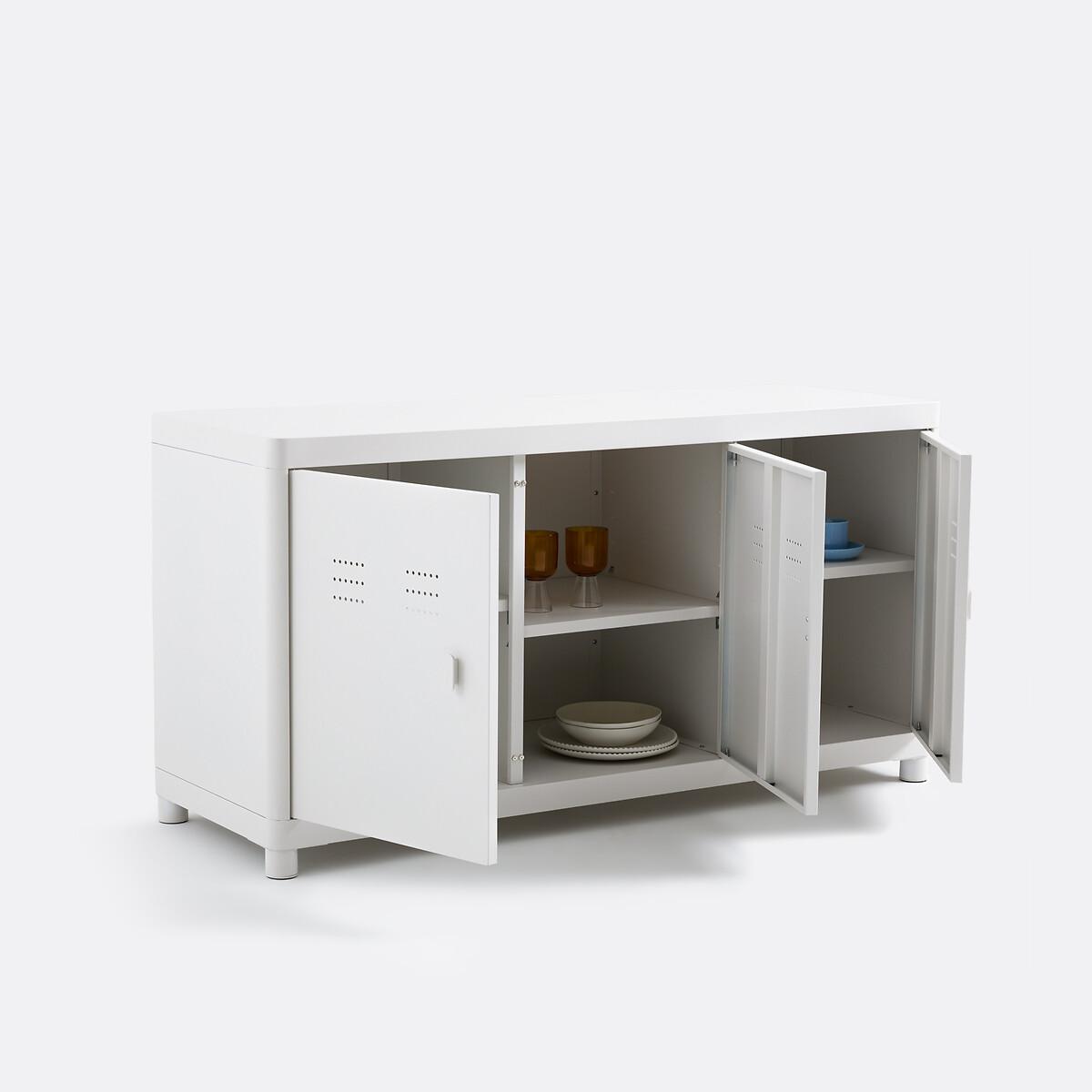 The all-metal Livona sideboard will add a contemporary touch to your home. When it comes to storage, there are 3 large compartments behind 3 doors for optimum organisation. Created by La Redoute Interiors Product Details • Structure, base and knob handles in grained print epoxy finish stained steel • 3 large compartments behind 3 doors • 3 removable, height-adjustable shelves • Height-adjustable legs • People required for assembly: 2. Dimensions Width : 144cm Height: 74cm Depth: 50cm Weight: 36kg Interior compartment: L46 x H59 x D43cm • This product requires assembly. Dimensions and weight of parcel • 2 parcels • L155 x H16 x D59cm, 24kg • L156 x H16 x D58cm, 20kg