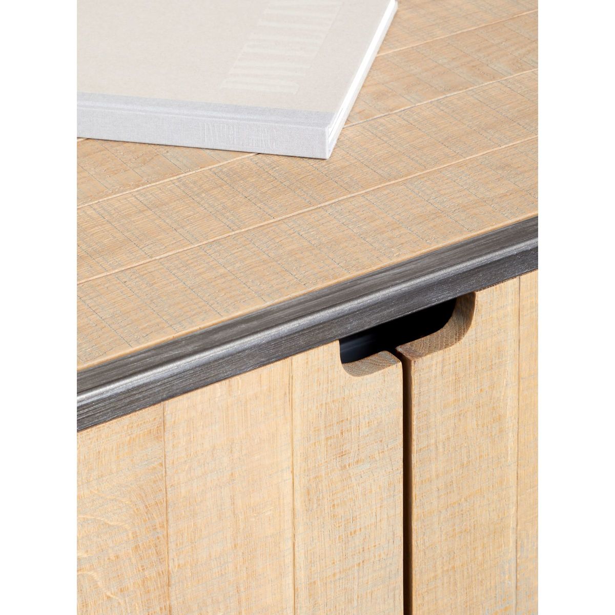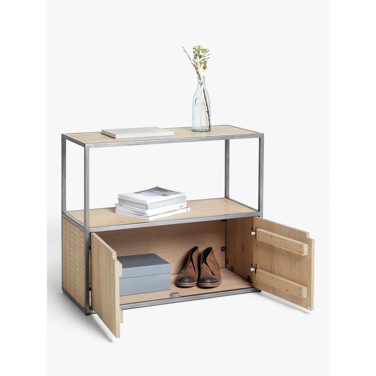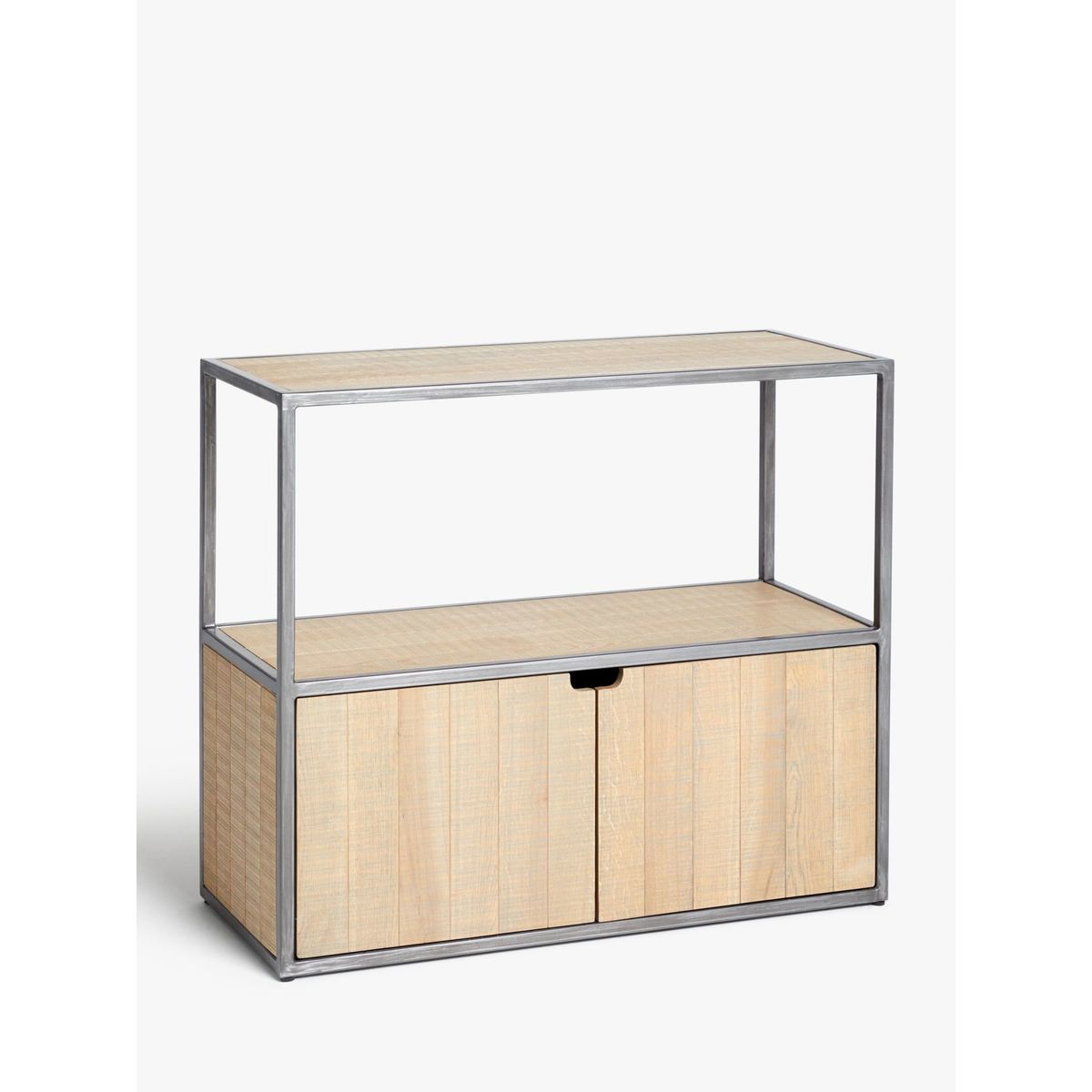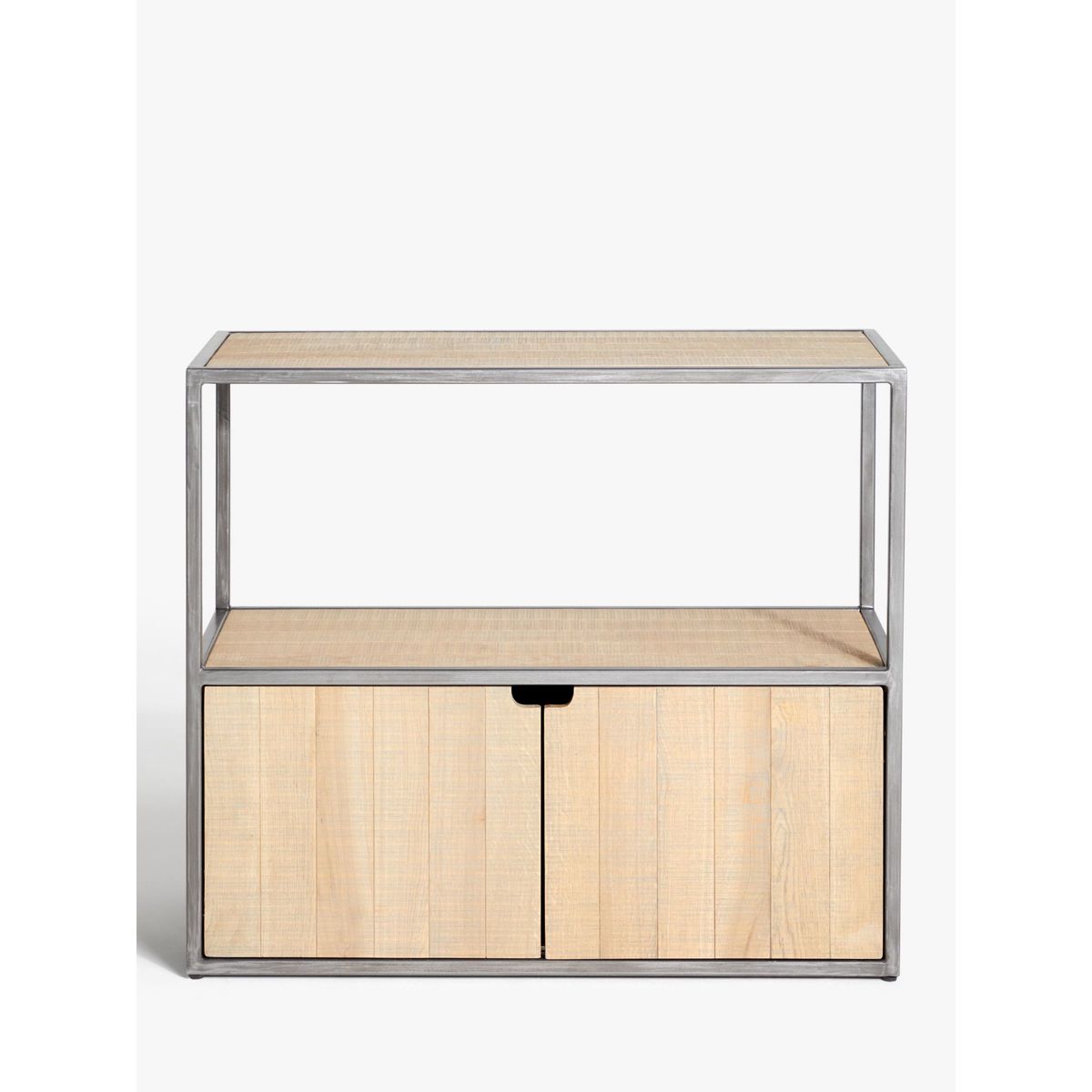 Designed by Loaf's in-house design team exclusively for John Lewis & Partners, the Acorn low shelving unit is a practical storage option for your country-inspired home. Made from solid oak in a grey wash, it has a tactile band sawn finish that highlights the natural, unique grain of the wood. Designed with two shelving sections and small cupboard, it provides ample storage space within its compact profile. The hand-welded, brushed metal frame enhances an airy, vintage aesthetic.