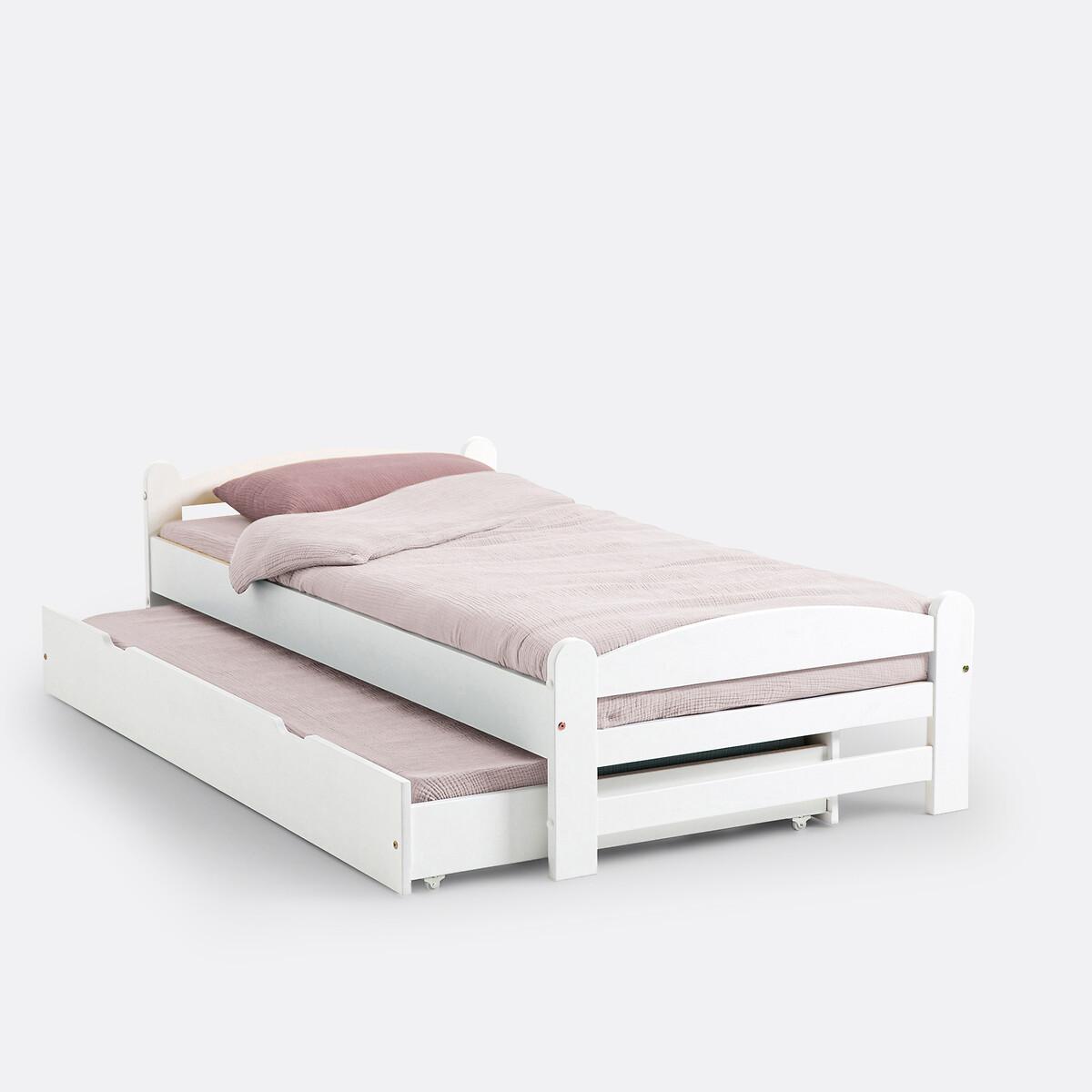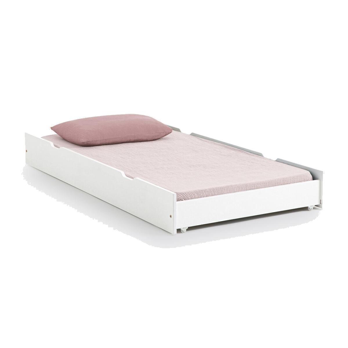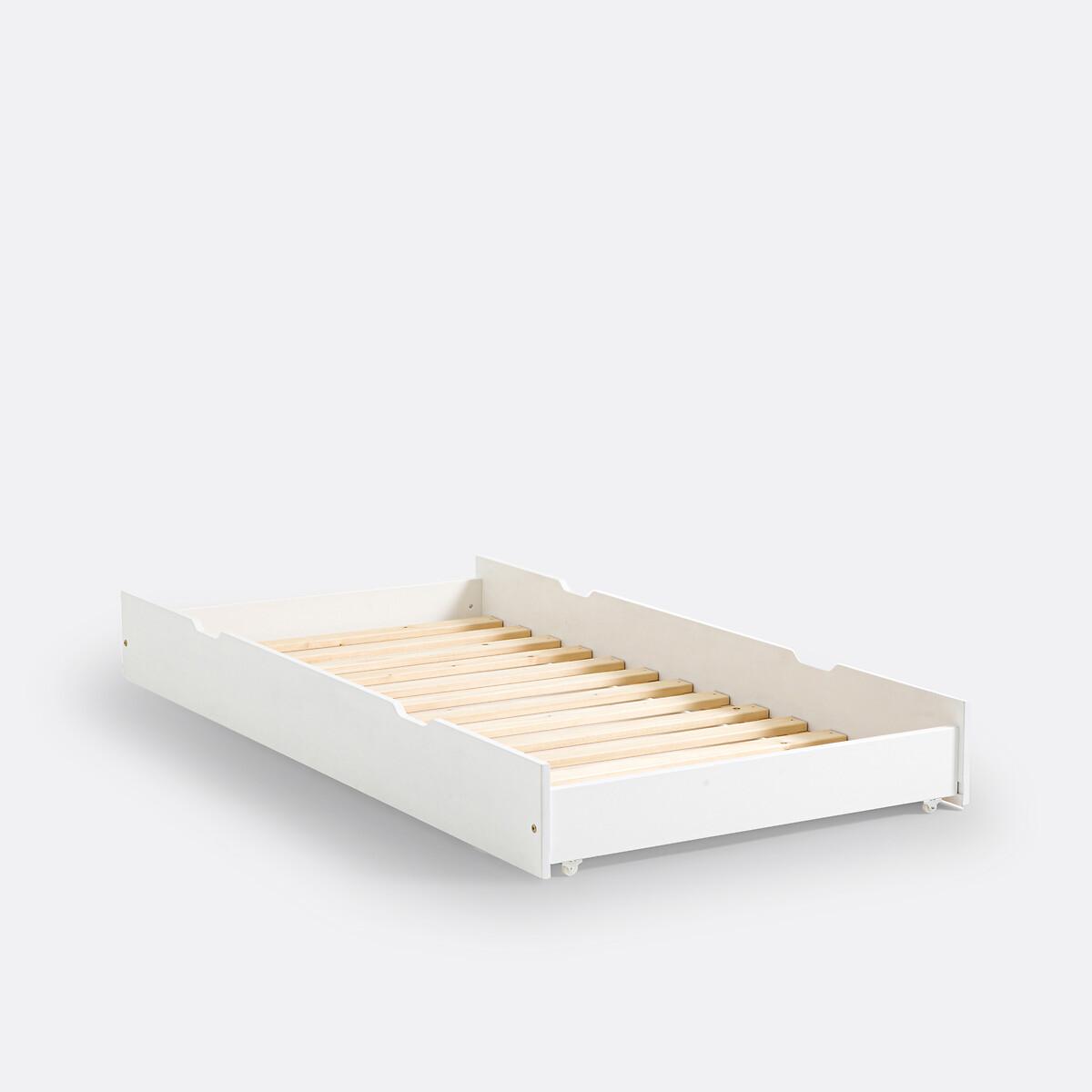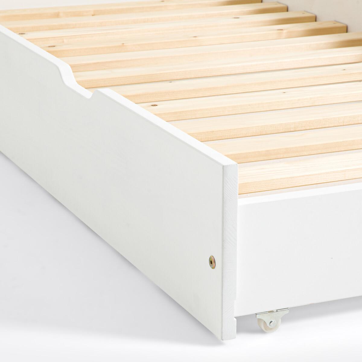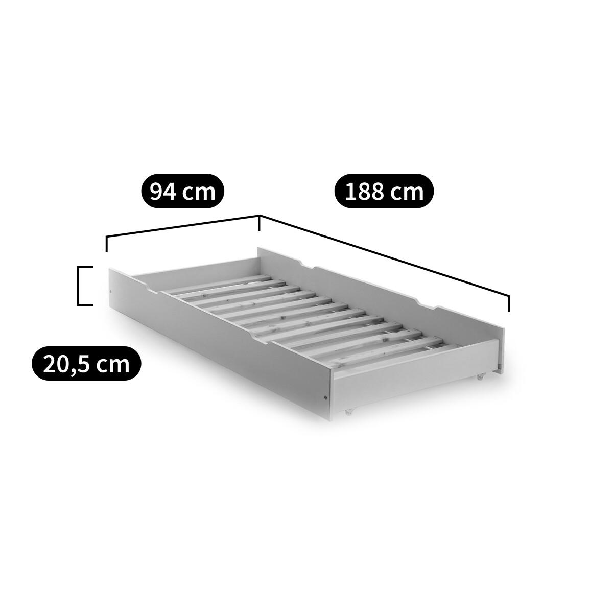 This solid pine trundle bed can be used as a guest bed or for underbed storage : Simply slide underneath the matching bed available on the website. In raw solid pine to paint or lacquered AC finish. Product Details • Mounted on castors. • Supplied with slatted base (13 raw solid pine slats). • Sleeping area 90 x 180cm. • Made in Europe. • In solid raw pine to paint or with lacquered acrylic finish. Quality Info • Please note that you need a mattress of dimensions 90 x 180 cm for this bed drawer. Dimensions. Total: • Width 94 cm • Height 20.5cm • Length 188 cm. • Interior: L90 x H14 x D181.2 cm. Parcel Dimensions:1 parcel • L200 x H22 x D13.5 cm • 19.5kg. Home Delivery:Requires self-assembly. It will be delivered to your door!Note! Please check that all access points are large enough to accommodate your delivery (doors, stairs, lifts).