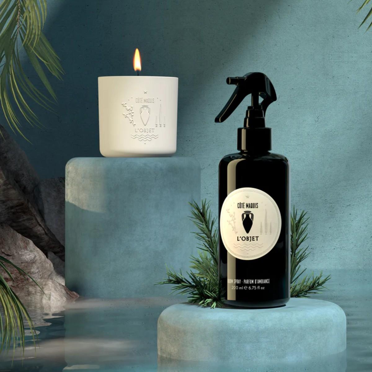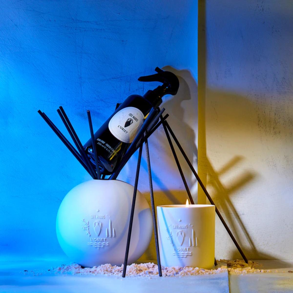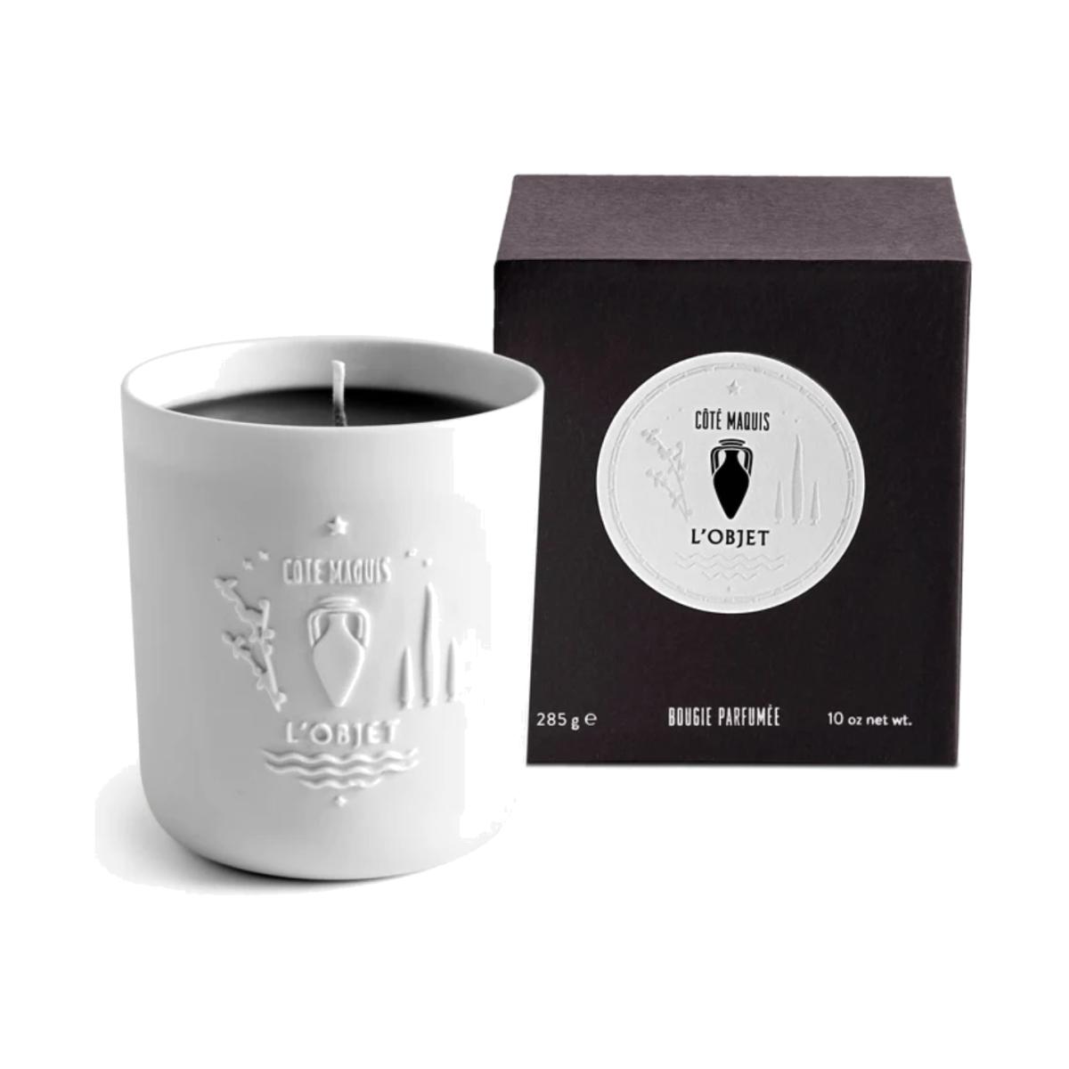 Top Note: Salt. Heart: Incense. Base: Labdanum, Cashmere Wood. Create ambience with scented candles in a refined, luminous porcelain vessel. Notes of salty air, infused with the earthiness of incense, cashmere wood, and lifted by warm, golden labdanum.