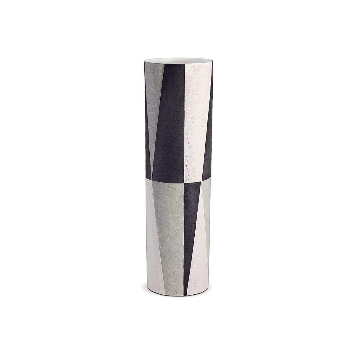 The Cubisme Vase forms part of The Cubisme Collection. In Cubisme, abstracted forms are remodeled with concrete simplicity into decorative pieces for the home. Finely-textured vases, table lamps, floor lamps and a decorative box are hand-painted in geometric patterns. Each piece is meticulously crafted from fine earthenware and finished in contrasting black, white and grey matte glazes.