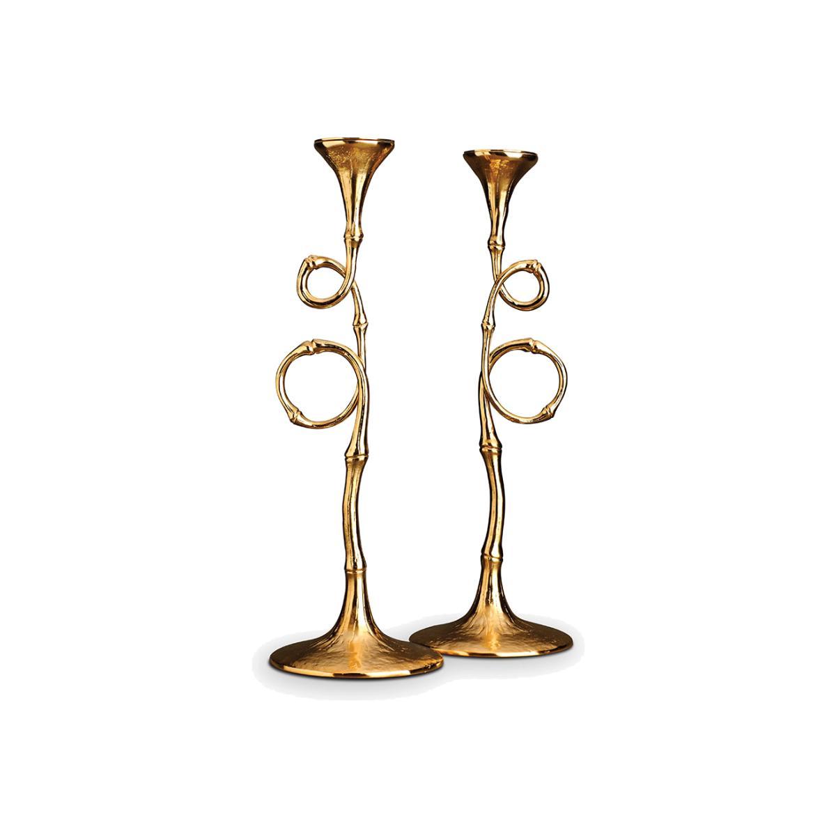 The Evoca Candlesticks forms part of the The Evoca Collection. The Evoca Collection juxtaposes the metallic with the organic to create a dazzling contemporary ensemble. Set against the seemingly liquid surfaces of stainless steel and nickel-plated brass, the delicate 24. K gold-plated bamboo accents are applied by hand to create a collection with a unique sculptural beauty.