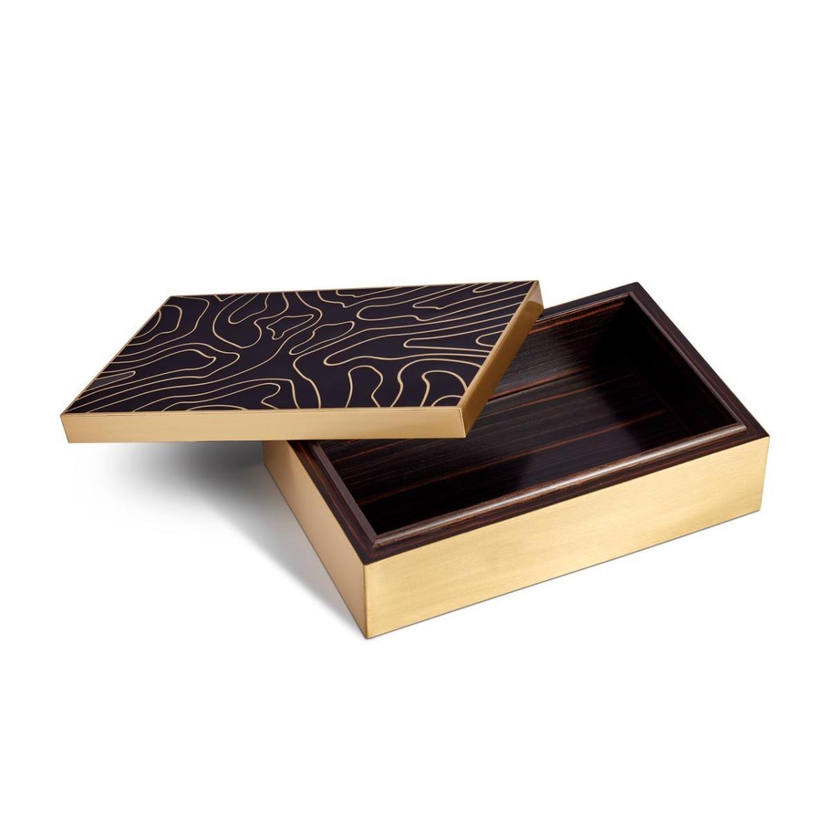 The Isles Rectangluar Box is inspired by the layers and interweaving lines on a topographic map, the Isles collection includes modern and functional pieces to elevate the home. Each piece is crafted using the finest Macassar ebony wood covered in resin with brass accents. The linear and organic surface design makes a clean and bold statement.