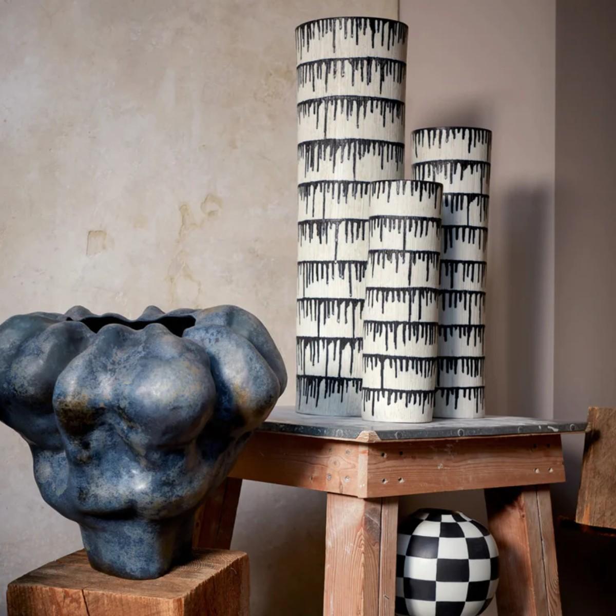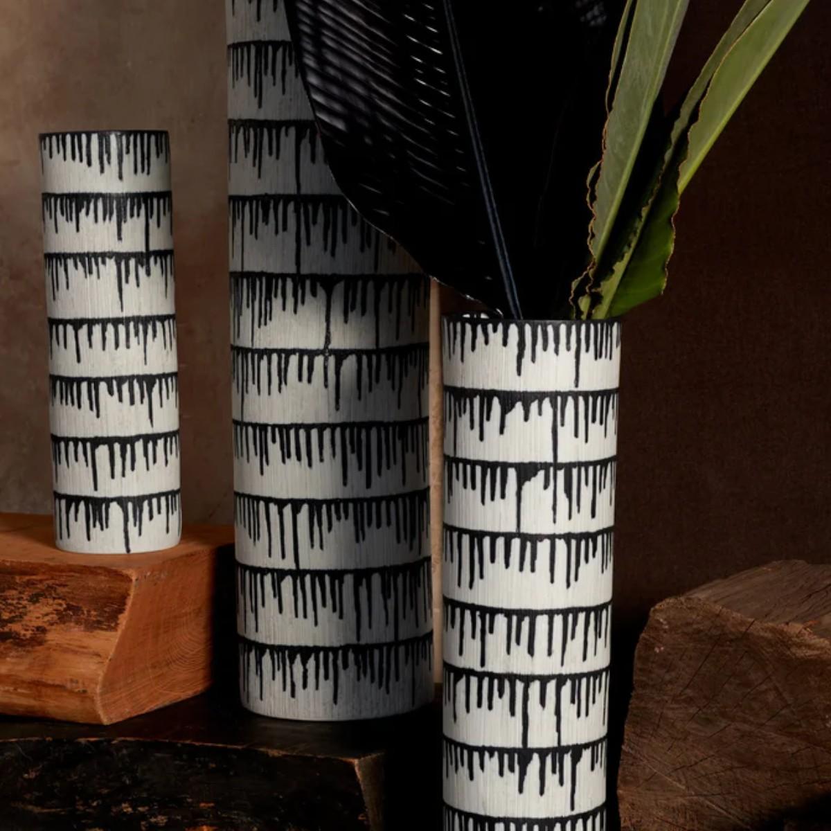 I love this tall vase for its bold, contemporary look - it makes a striking statement on its own or as part of a curated display. Its monochrome drip pattern adds a touch of graphic interest, making it versatile for modern, minimal, or eclectic interiors. It works particularly well in spaces with monochrome or neutral palettes, but can also serve as a statement piece against coloured walls or textured backgrounds. Practical styling tips include pairing it with simple, architectural bouquets for visual impact or using it as a standalone sculptural element on mantlepieces or console tables. Its vertical form makes it ideal for filling a corner or balancing larger displays, and its size offers excellent impact without overwhelming the space.