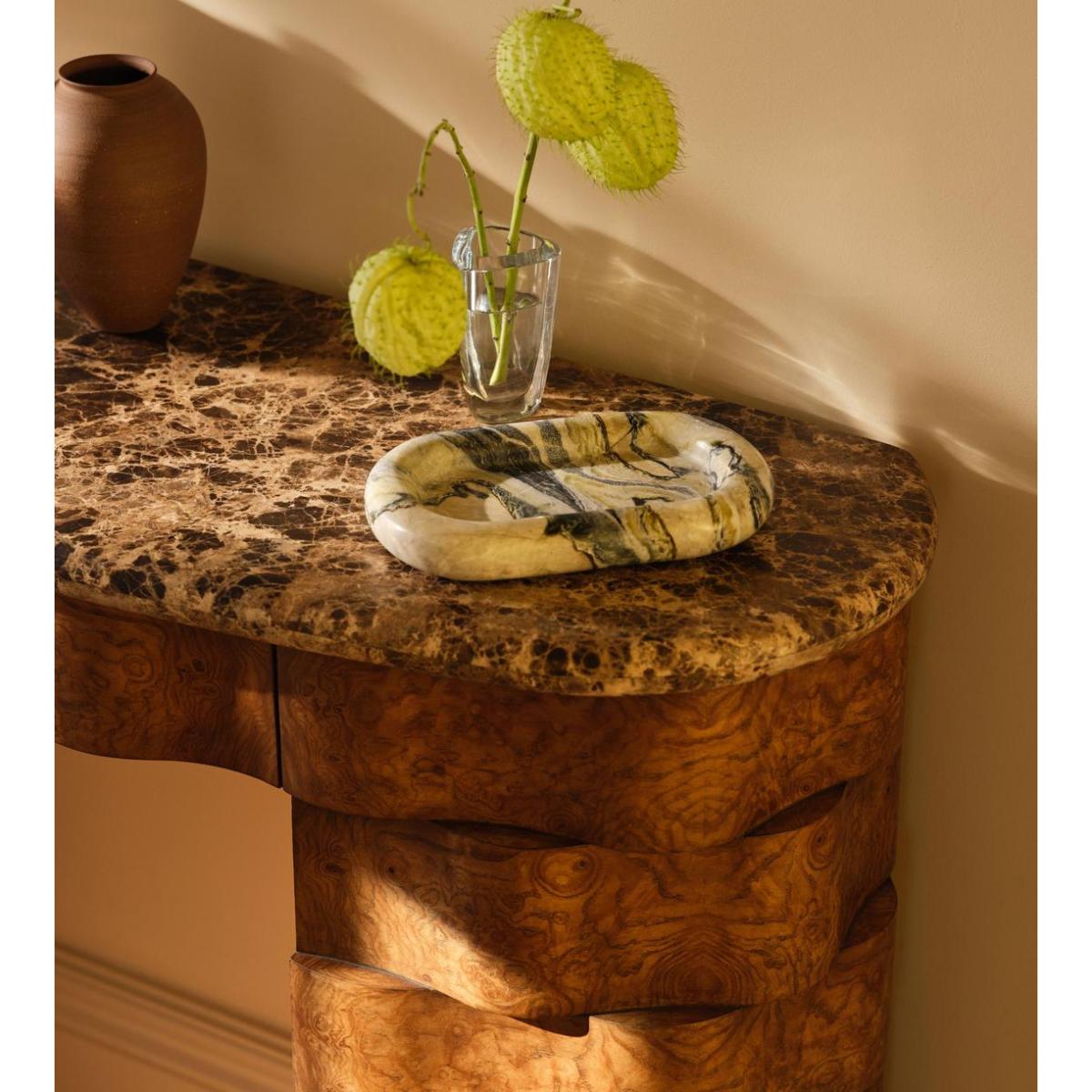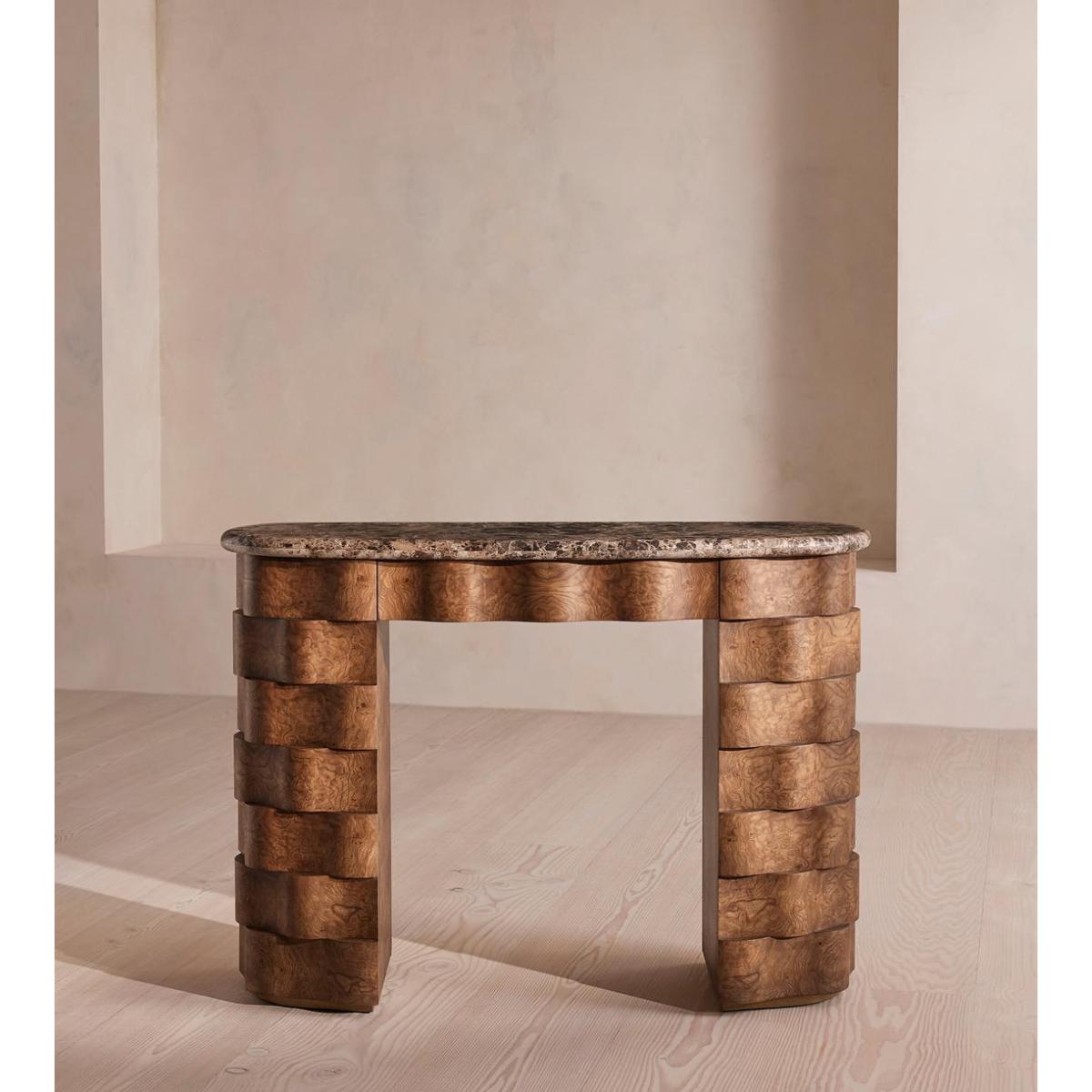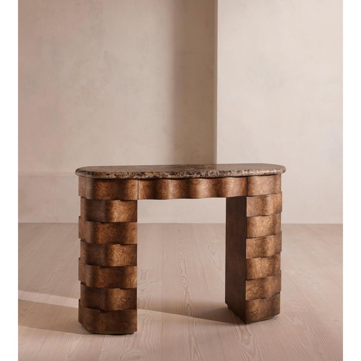 Intricately scalloped panels of olive ash burl curve around rounded sides, supporting a top made from earthy Dark Emperador marble. The Locanda console table is designed to perfectly complement our first freestanding bar. Inspired by Soho House Rome, it showcases a mix of materials, combining artfully carved panels of olive ash burl with an earthy brown Dark Emperador marble top sourced from Spain.