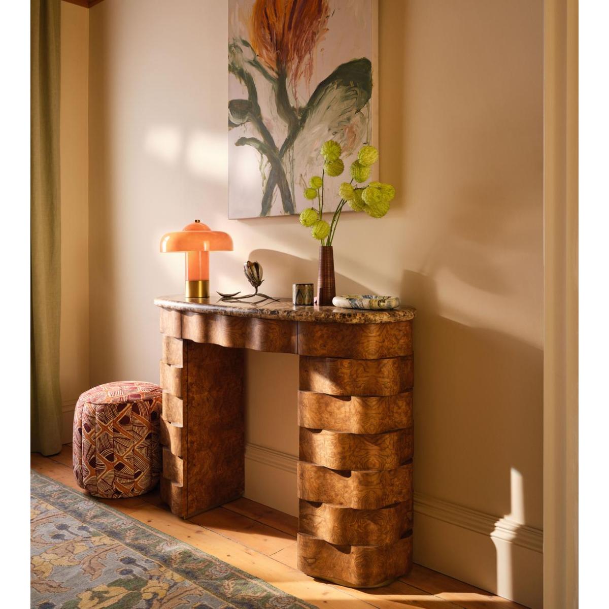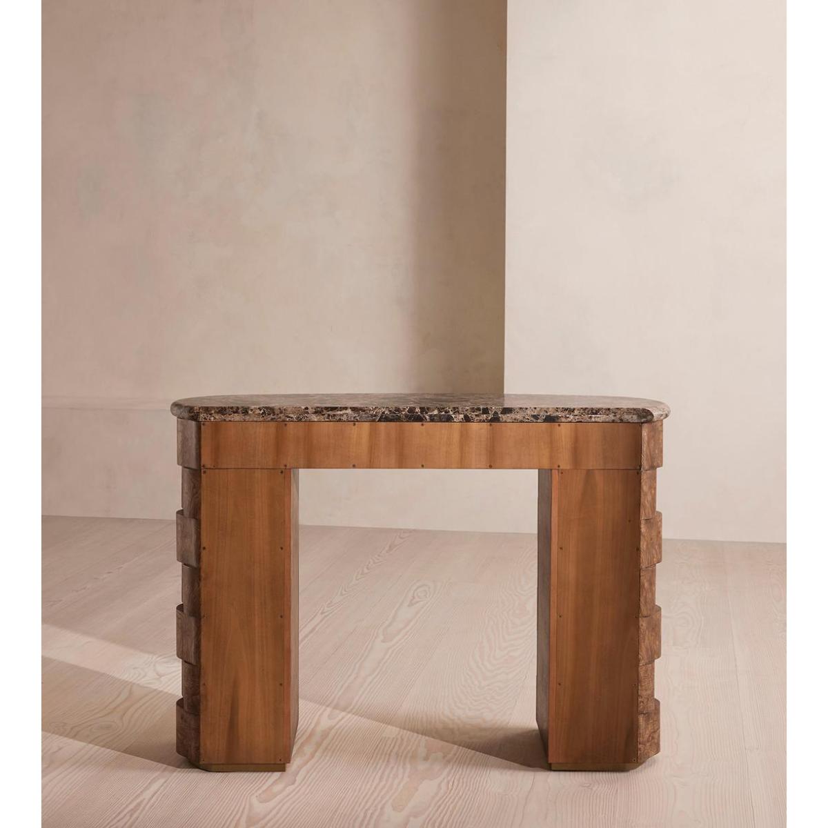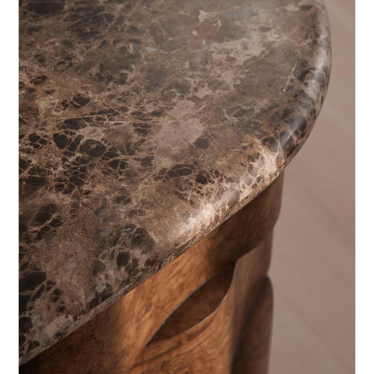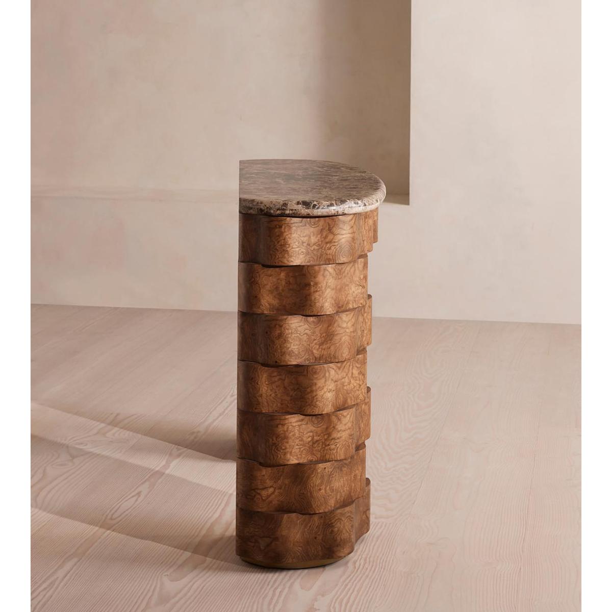 Intricately scalloped panels of olive ash burl curve around rounded sides, supporting a top made from earthy Dark Emperador marble. The Locanda console table is designed to perfectly complement our first freestanding bar. Inspired by Soho House Rome, it showcases a mix of materials, combining artfully carved panels of olive ash burl with an earthy brown Dark Emperador marble top sourced from Spain.