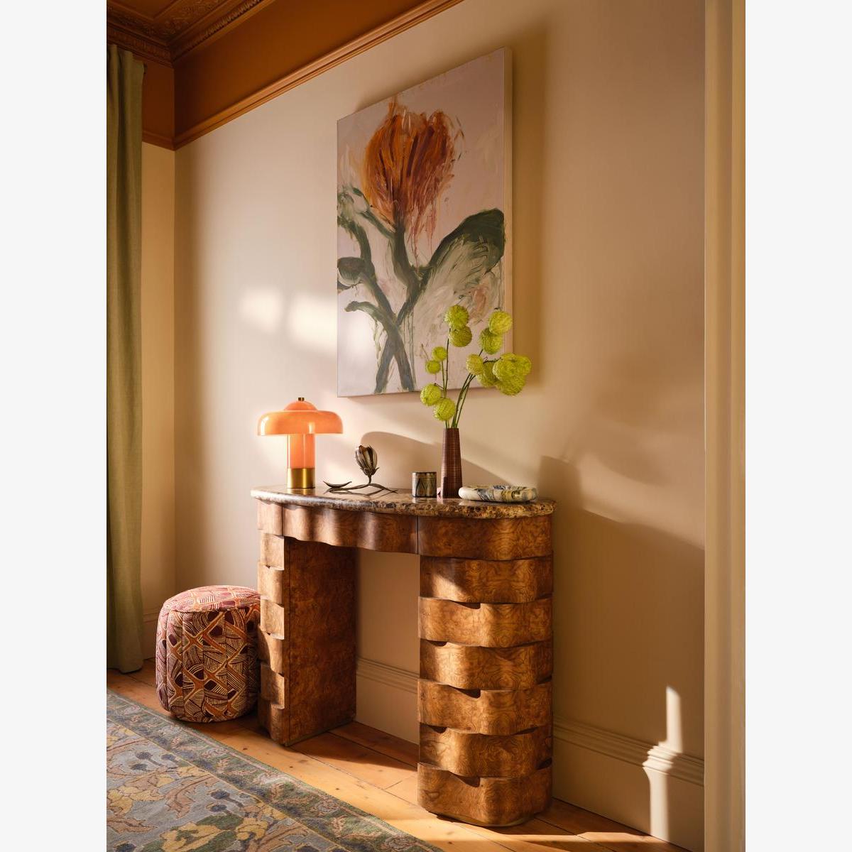 The Locanda Console in dark Emperador marble offers a sleek, sophisticated piece that can elevate various interiors. I love its bold marble top combined with the chunky, textured base, making it a statement without overpowering the space. It works particularly well in hallways, living rooms, or even as a sideboard in dining areas, adding richness and a touch of luxury. For practical styling, consider pairing it with minimalist table lamps, oversized decorative vases, or framed artwork above to keep the look balanced. Its durable marble finish makes it versatile enough to mix with both modern and classic interiors, adding a refined yet functional touch.
