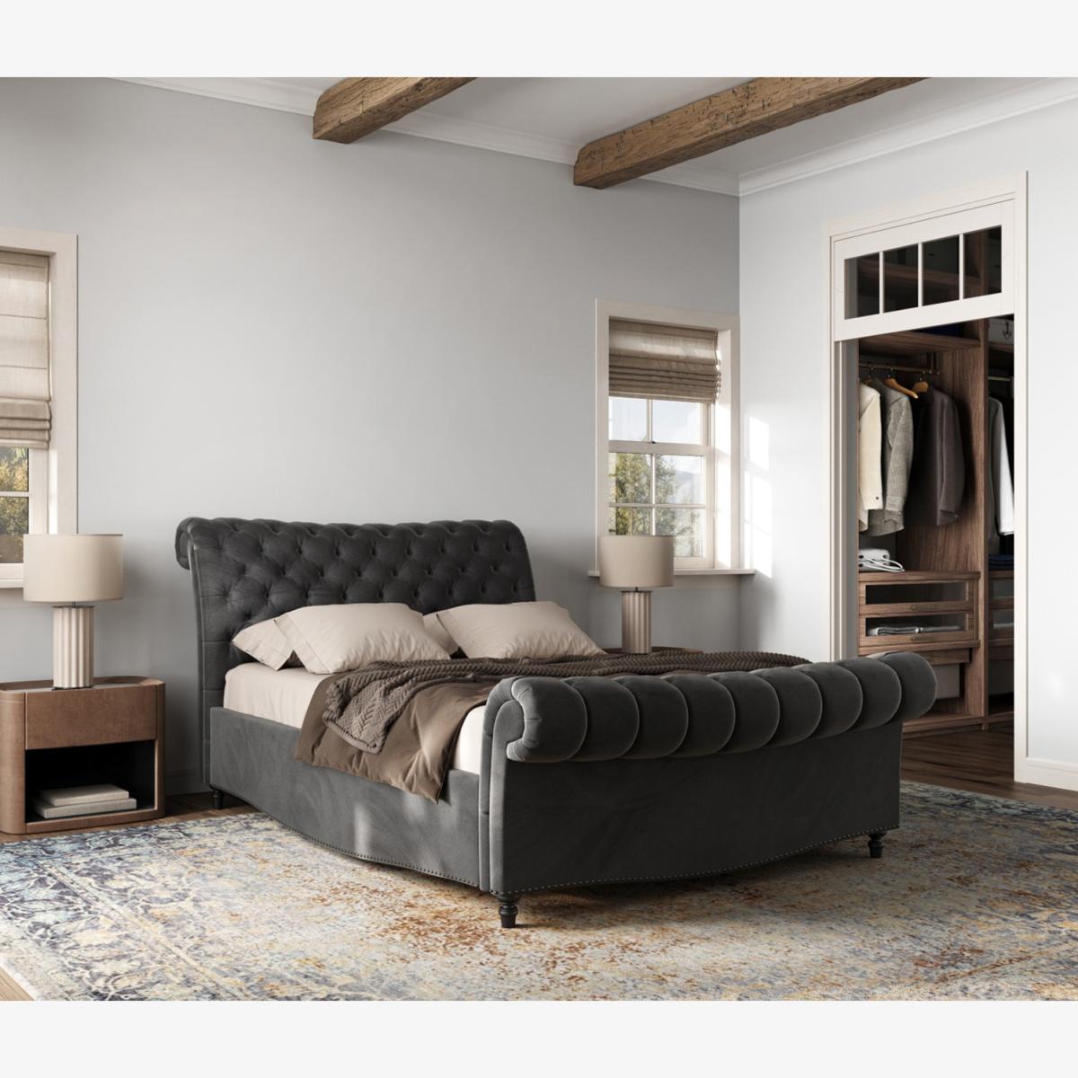 The luxurious Lochley sleigh-styled ottoman bed frame features elegant scrolls and sweeping curves. Sumptuously upholstered in a grey velvet or linen fabric with generous cushioning and deep button detailing, this bed frame will add a touch of splendour to any bedroom. A large storage area can be easily accessed at the base with the help of a gas lift system, offering plenty of space for all those bedroom accessories. There is an option to build the bed for a right or left-hand side opening to suit your space.