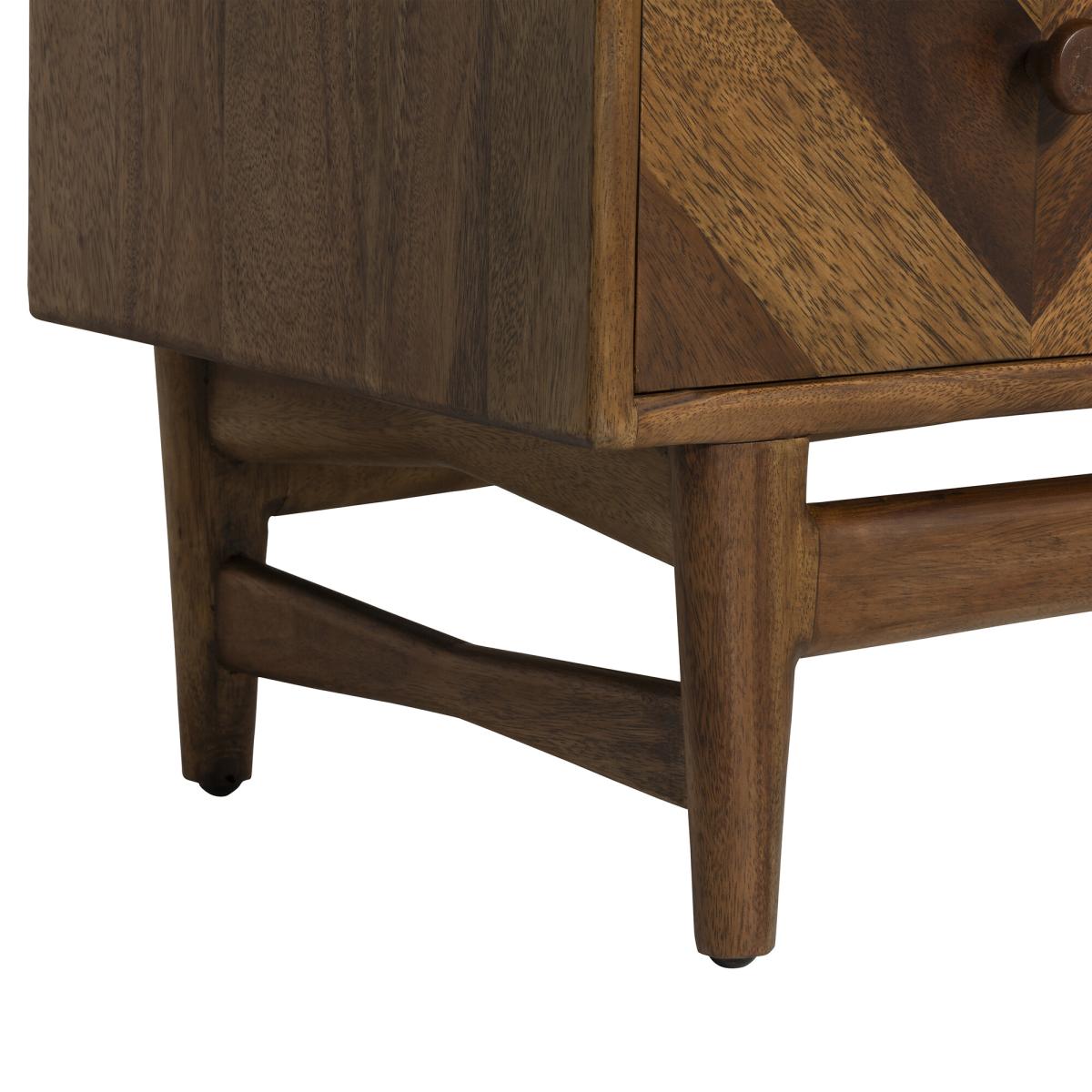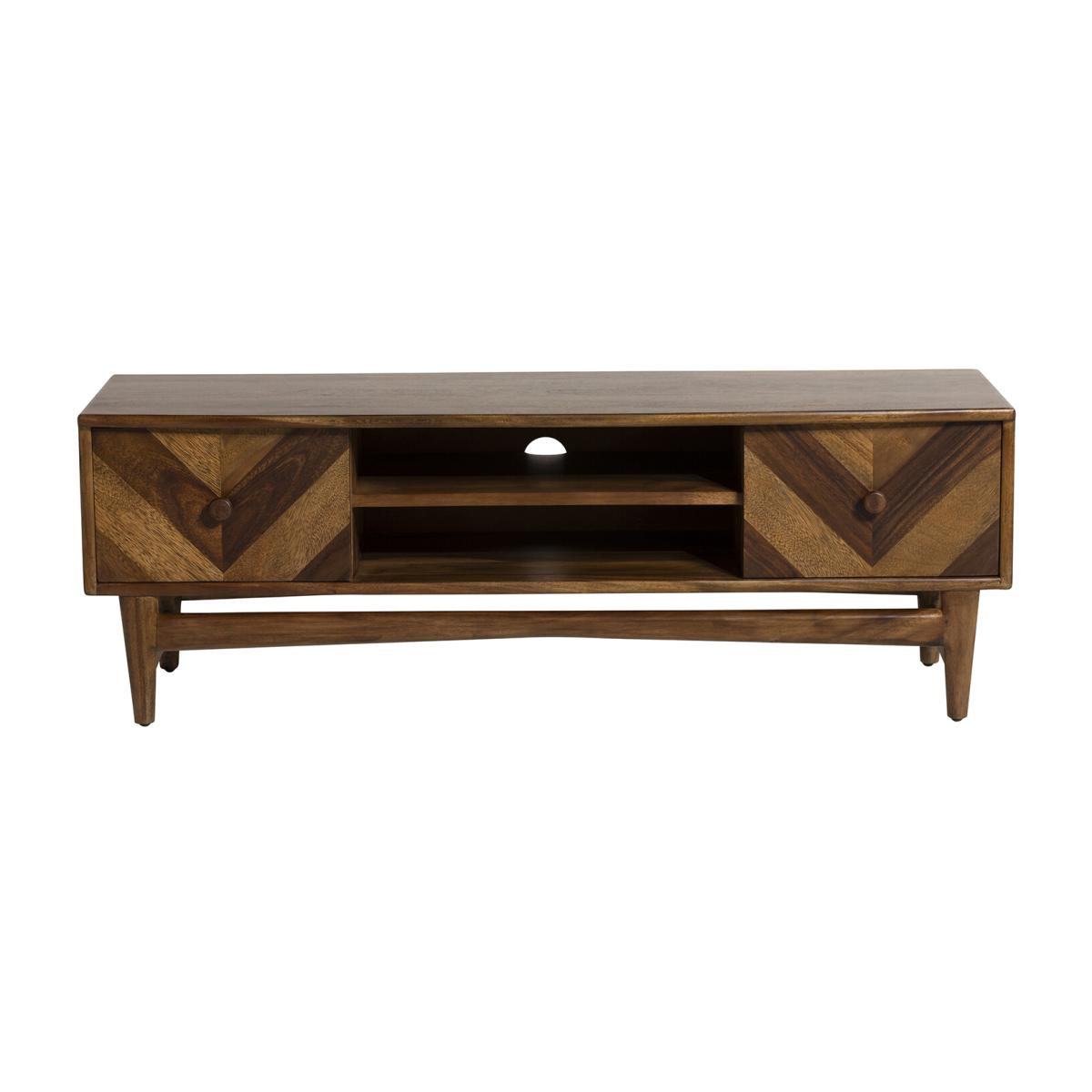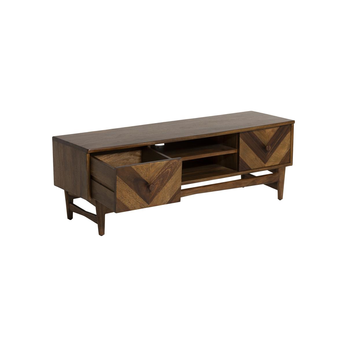 Elevate your living space with the Lockley Chevron Brown Wood 2 Drawer TV Cabinet, a perfect fusion of style and practicality. Crafted from durable saman wood with a rich cognac mellow finish, it boasts a captivating chevron pattern that adds visual depth. The two spacious drawers provide ample storage, making it both a functional and stylish addition to your room.