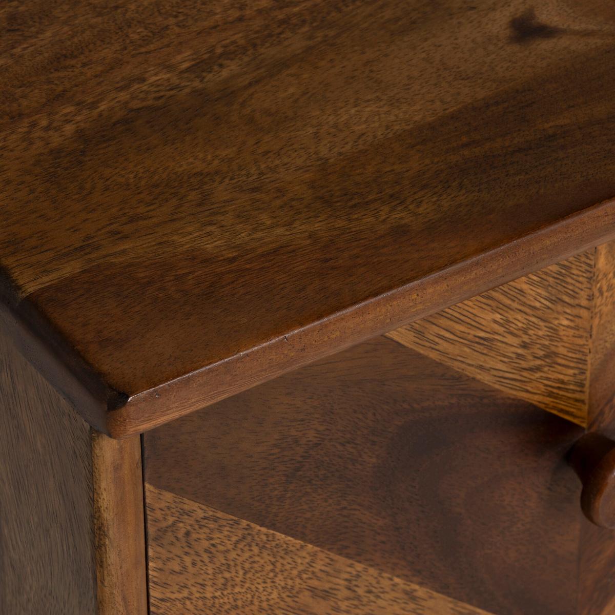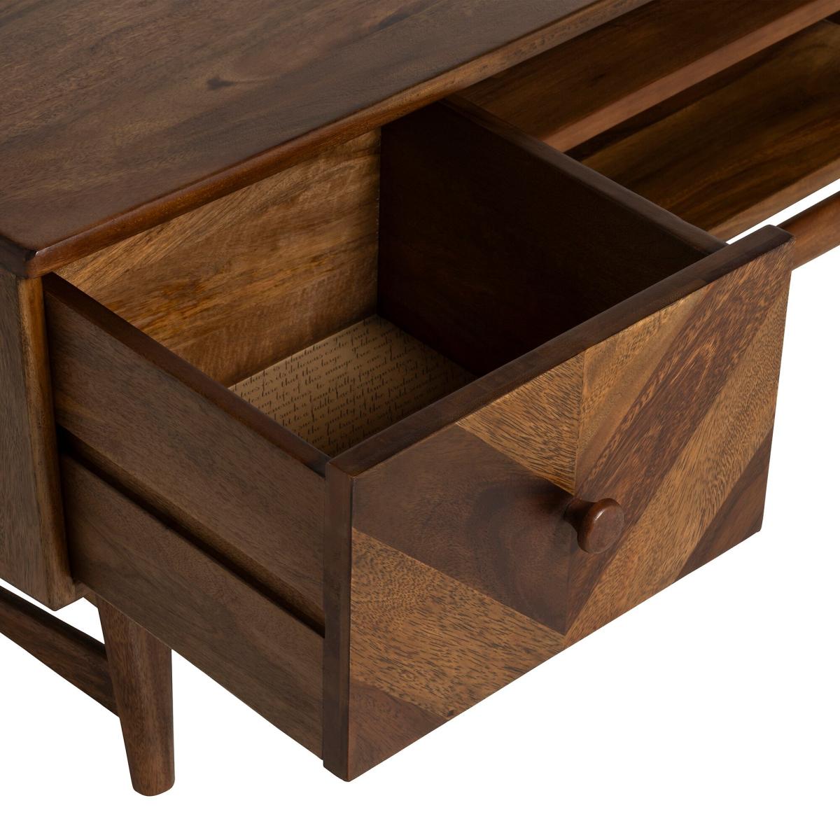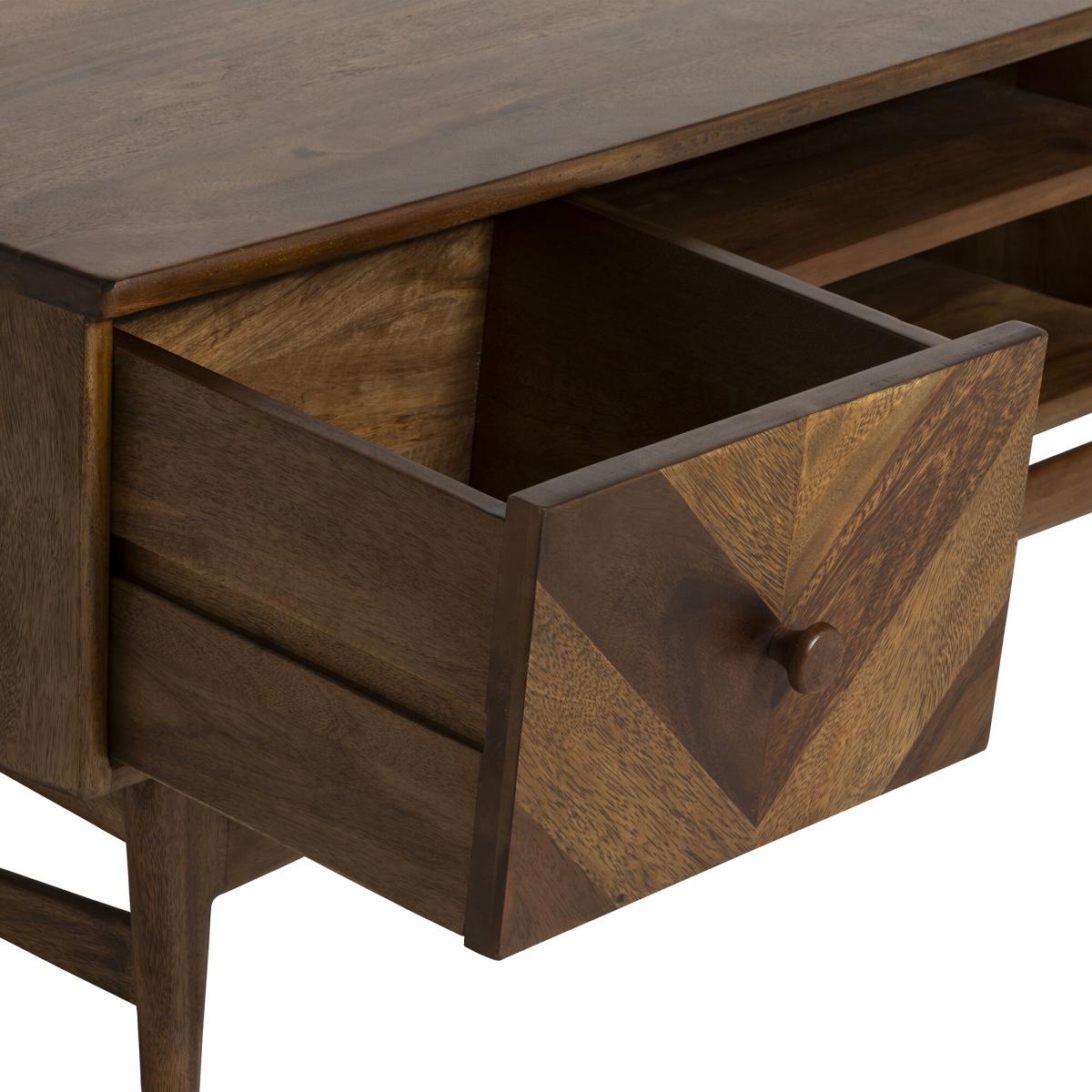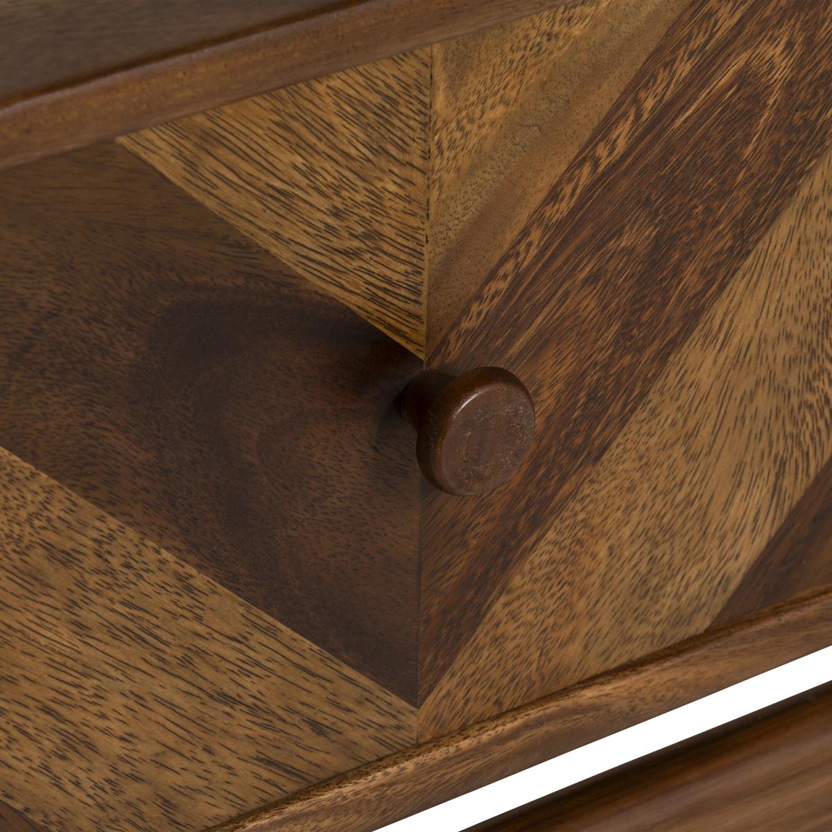 Elevate your living space with the Lockley Chevron Brown Wood 2 Drawer TV Cabinet, a perfect fusion of style and practicality. Crafted from durable saman wood with a rich cognac mellow finish, it boasts a captivating chevron pattern that adds visual depth. The two spacious drawers provide ample storage, making it both a functional and stylish addition to your room.