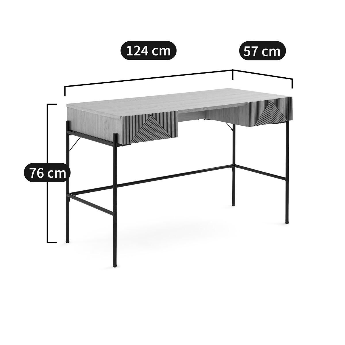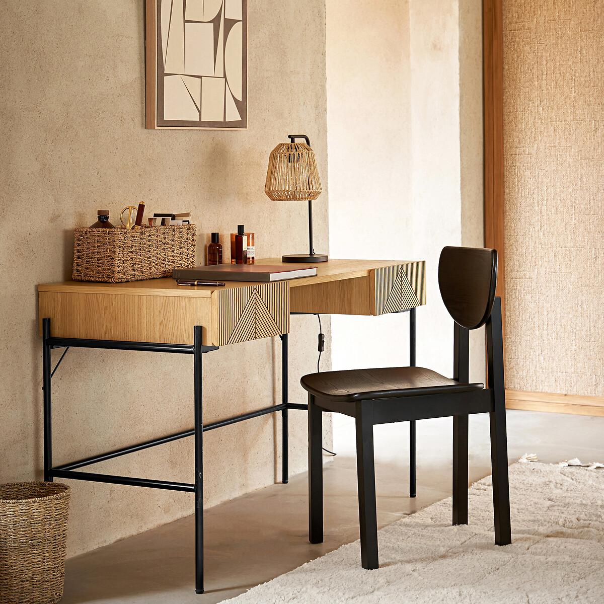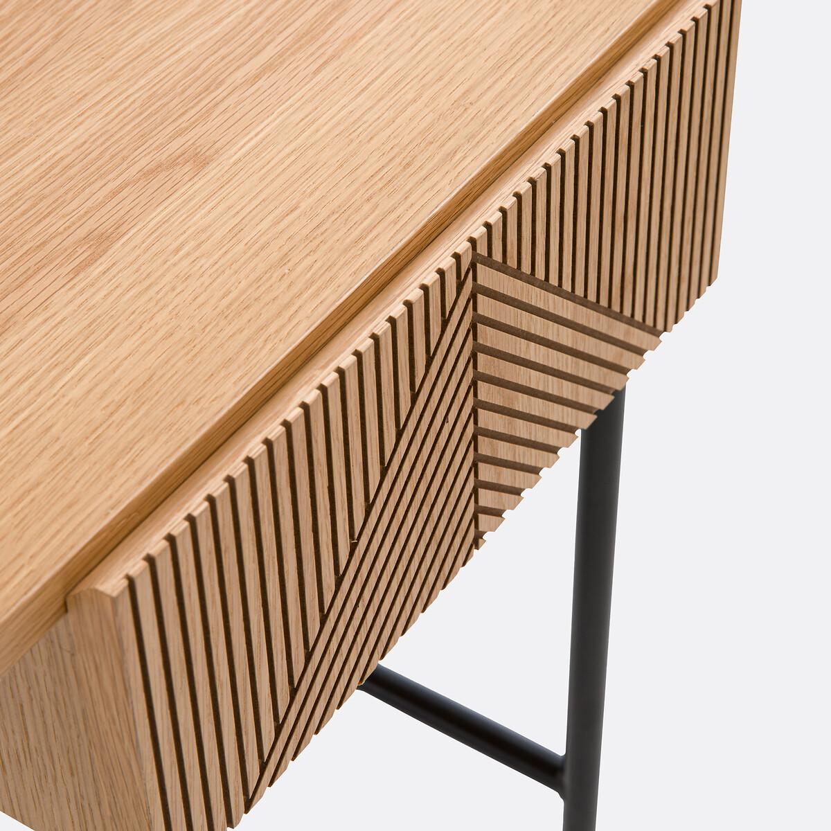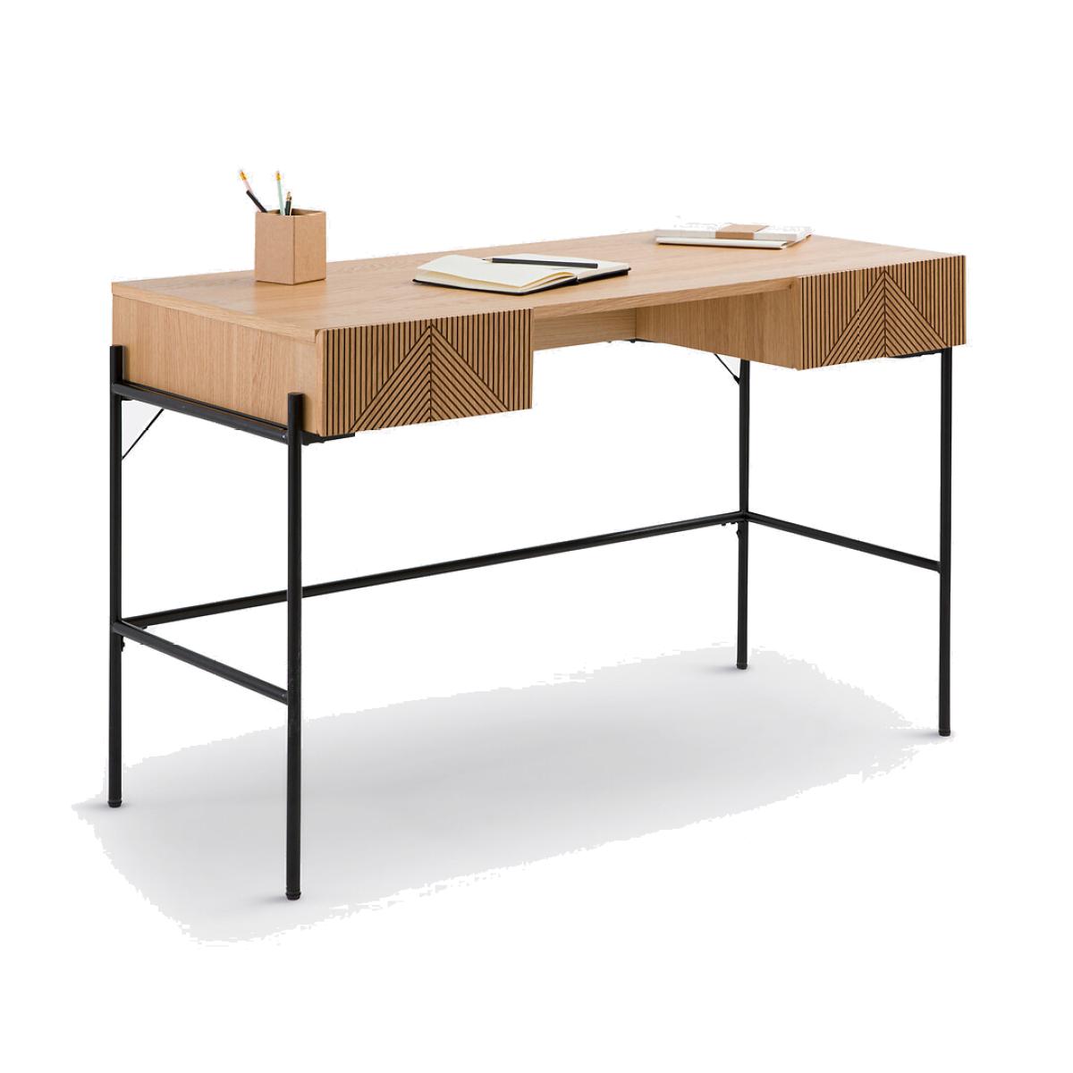 The Lodge desk is part of the La Redoute Interiors Signatures collection. A selection of exclusive creations, designed by our in-house design studio. Inspiring, easy to live with, trendy... these products have become our customers' favourites. Designed internally by Aurore Delest :"To create the Lodge desk, I wanted to combine vintage with ethnic influences, notably with carved wood. The streaky wire drawing brings rhythm for a graphic spirit and a contemporary style. "Product Details • 2 bevelled drawers on the upper part for easy opening. Streak finish on the front of the drawers • Oak veneered MDF unit, nitrocellulose varnish finish • FSC® certified wood • Steel base with epoxy finish, adjustable feetDimensions. Overall • Width: 124cm • Height: 76cm • Depth: 57cm • Weight: 29.5kg. Usable dimensions • Drawers : L26 x H6.8 x D38cmDelivery:. This product required assembly. Available for home delivery. • WOOD FROM SUSTAINABLY MANAGED FORESTS. FSC® certified wood comes from forests that are environmentally, socially and economically well managed. Parcel dimensions and weight1 parcel • L133 x H13 x D64cm. 32kg