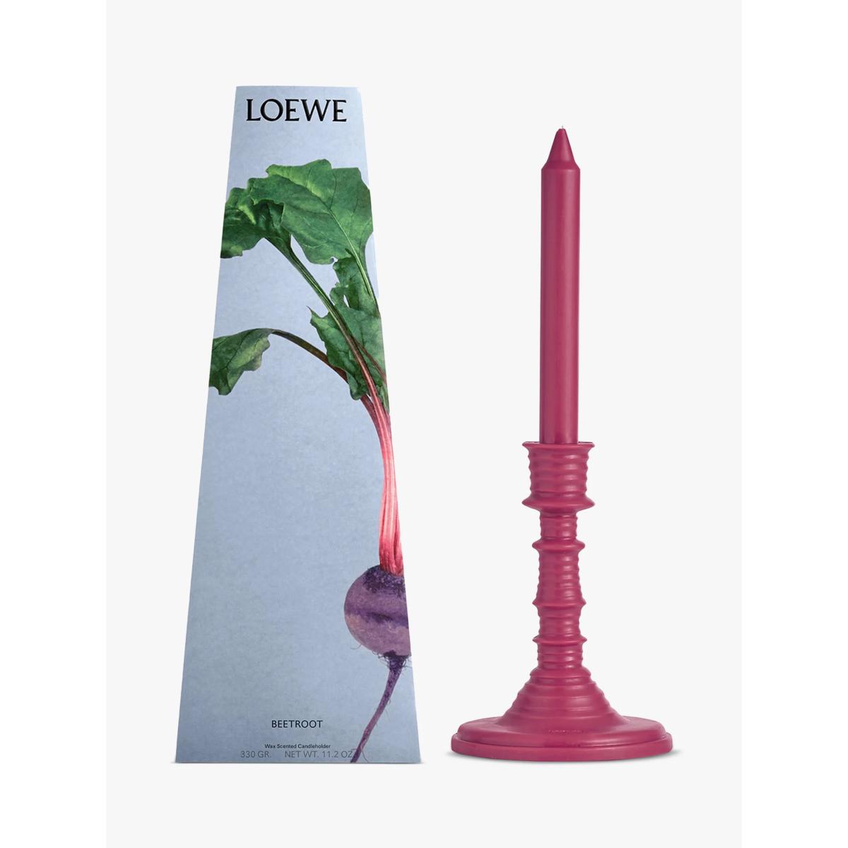 A candlestick-shaped candle, crafted in wax, with beetroot essence. The Beetroot wax candleholder evokes, with its fruity scent, the fresh aroma of this deep-purple-and-red edible root vegetable. It reveals delicate sweet notes once lit. This candlestick-shaped candle has a single cotton wick and should be placed on a heatproof surface, such as our terracotta base intended for this use, available to buy separately. All LOEWE Home Scents items are olfactory creations that highlight nature’s most natural and pure scents. Made in Spain. Due to their handcrafted nature, no two Home Scents Wax Candleholders are exactly the same.