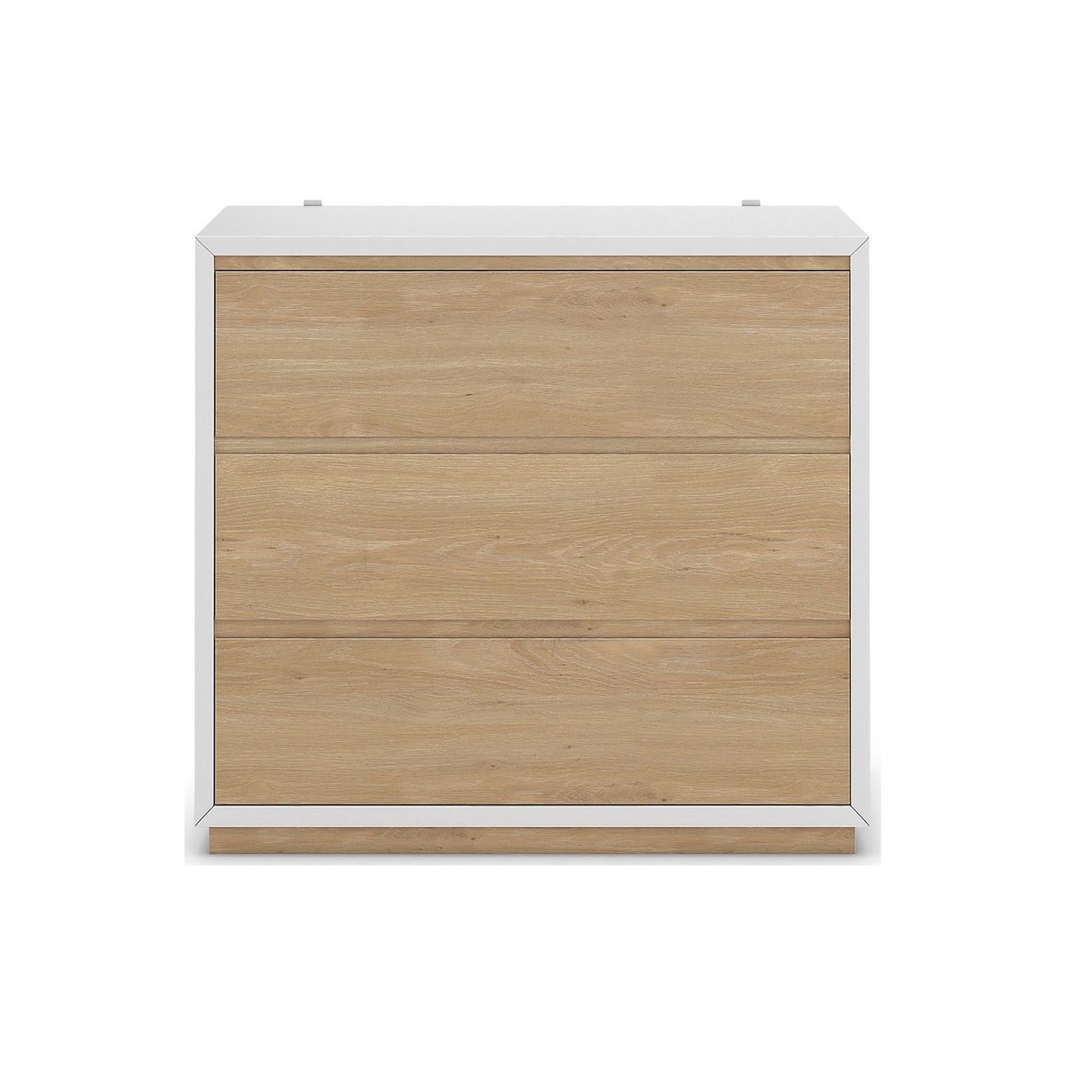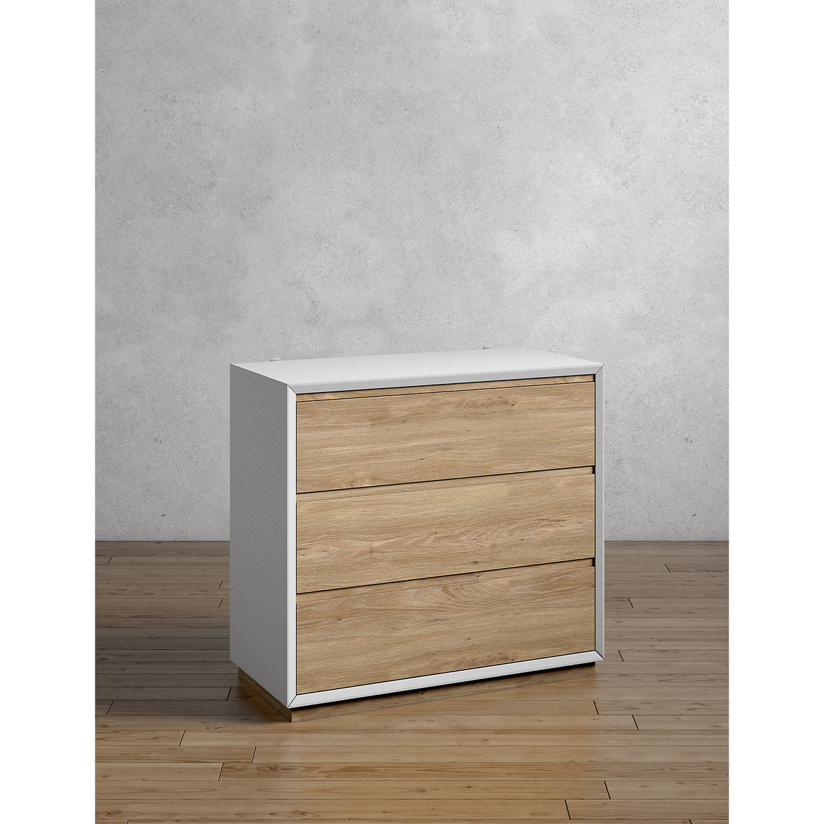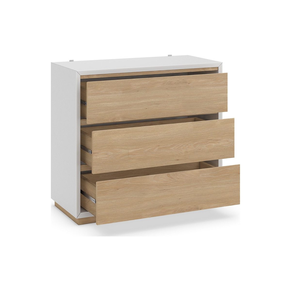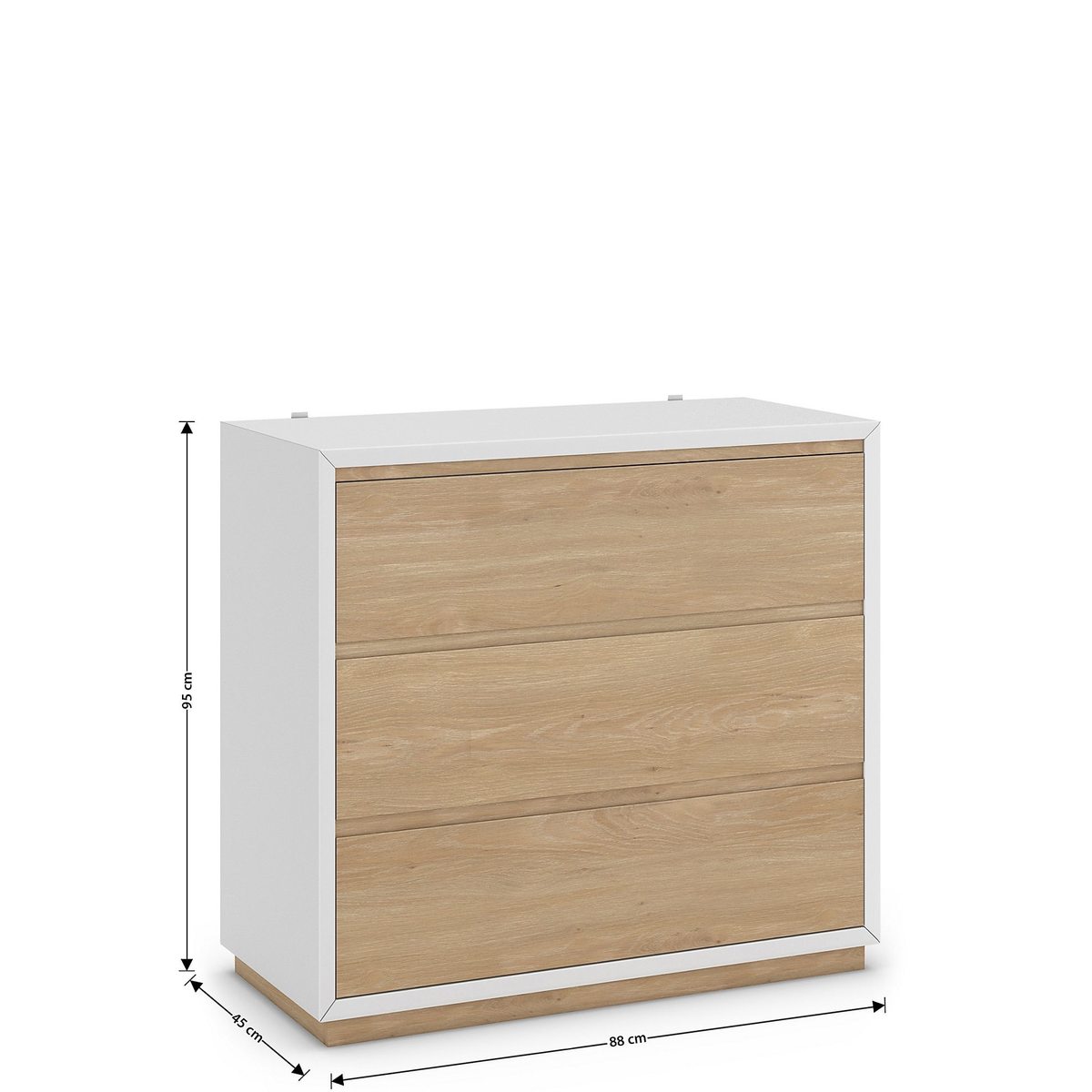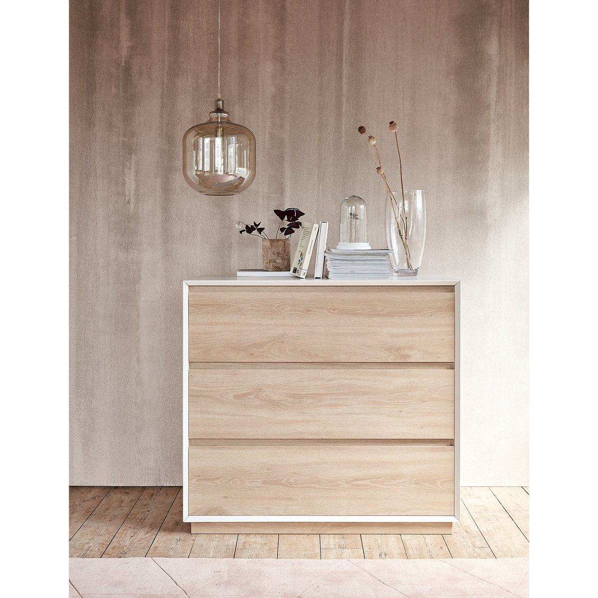 Showcasing clean lines and a modern design, this chest of drawers from our Jones range will make a smart addition to a bedroom or living space. Complete with oak fronts and a stylish painted frame for a contemporary look, our drawer chest features high-quality full extension drawer runners and has a durable finish that won\u2019t warp, bend or crack. With three spacious drawers, there's plenty of room for all your storage needs.