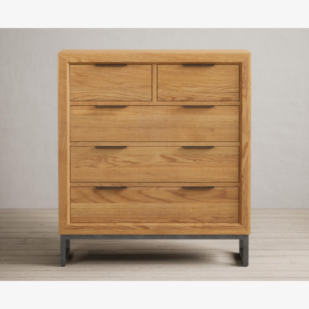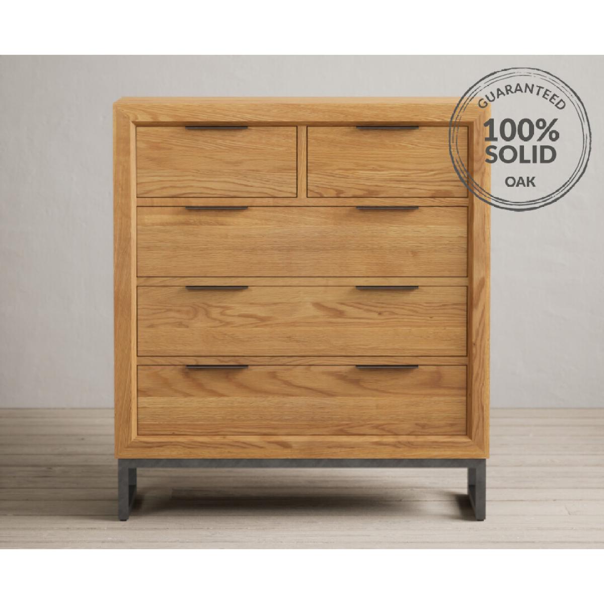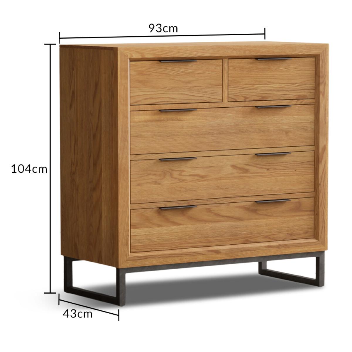 The Loft Solid Oak 2 Over 3 Chest of Drawers is crafted using 100% solid oak and features a natural finish and metal legs, with sturdy dovetail drawers.