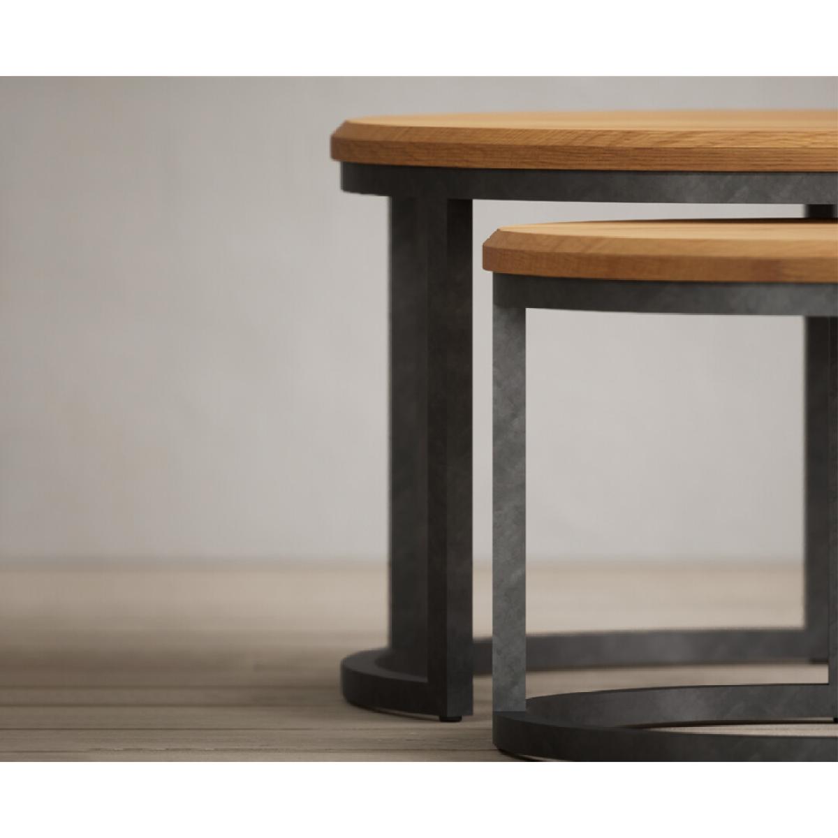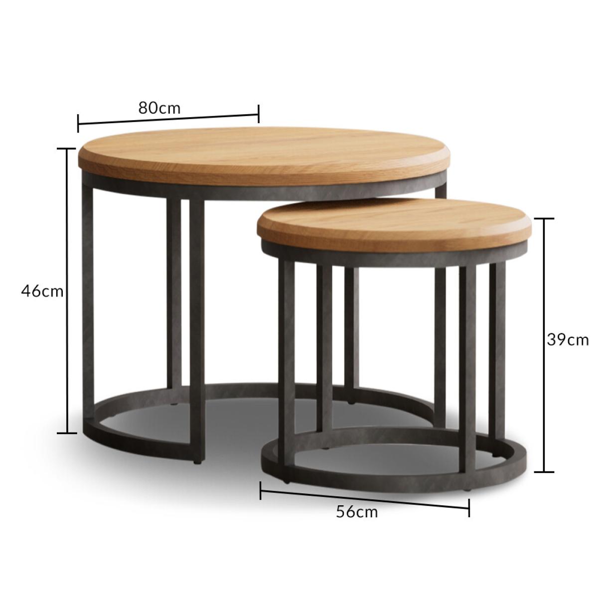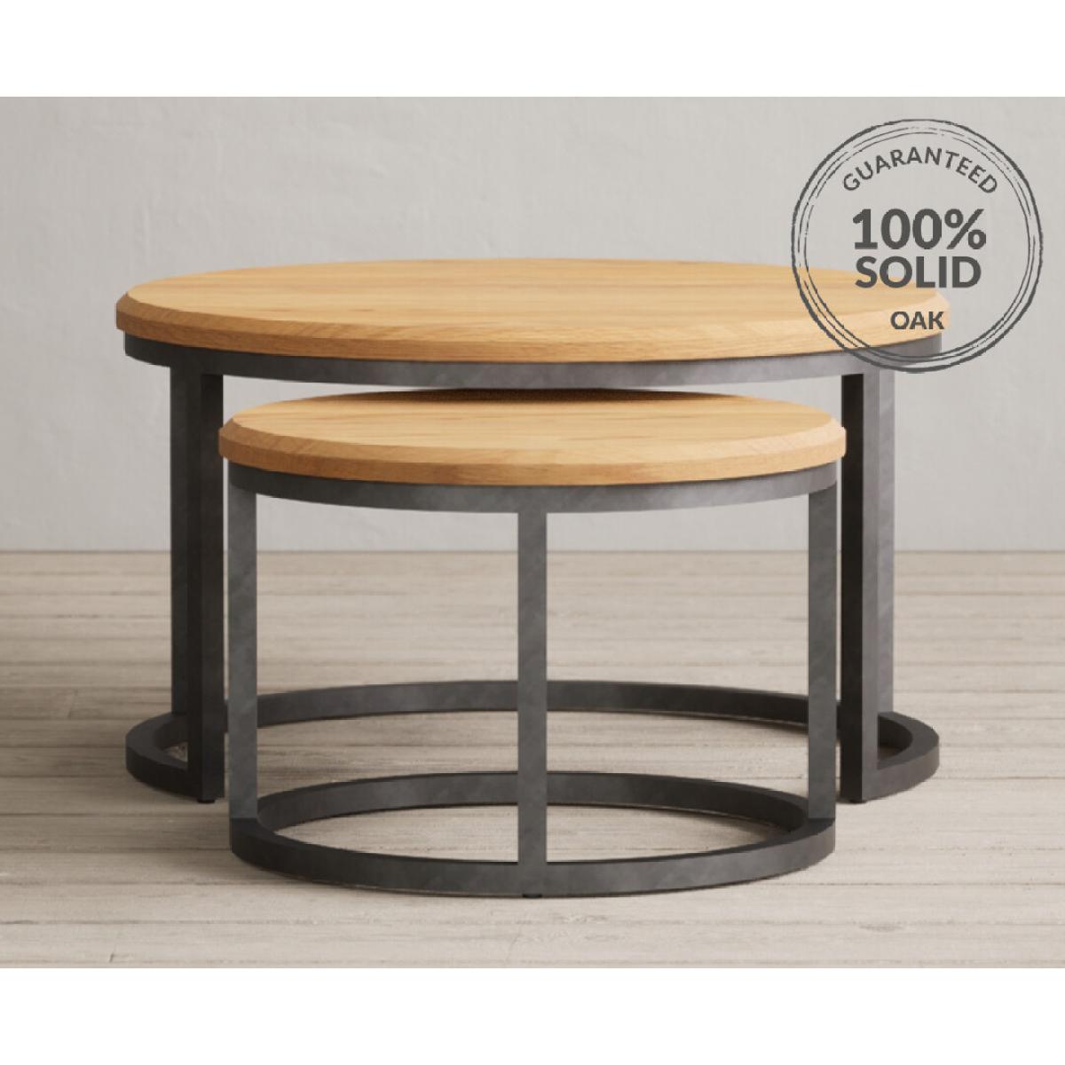 The Loft Solid Oak Round Nest of Tables is a set of two round solid oak tables with metal legs that nestle with one another when not in use.