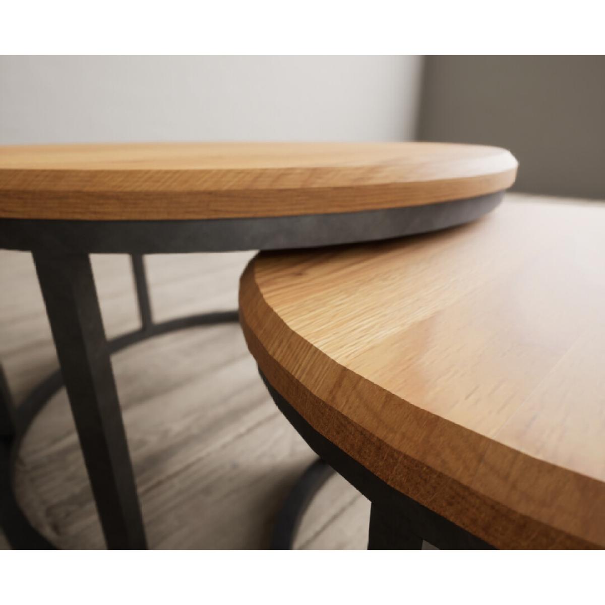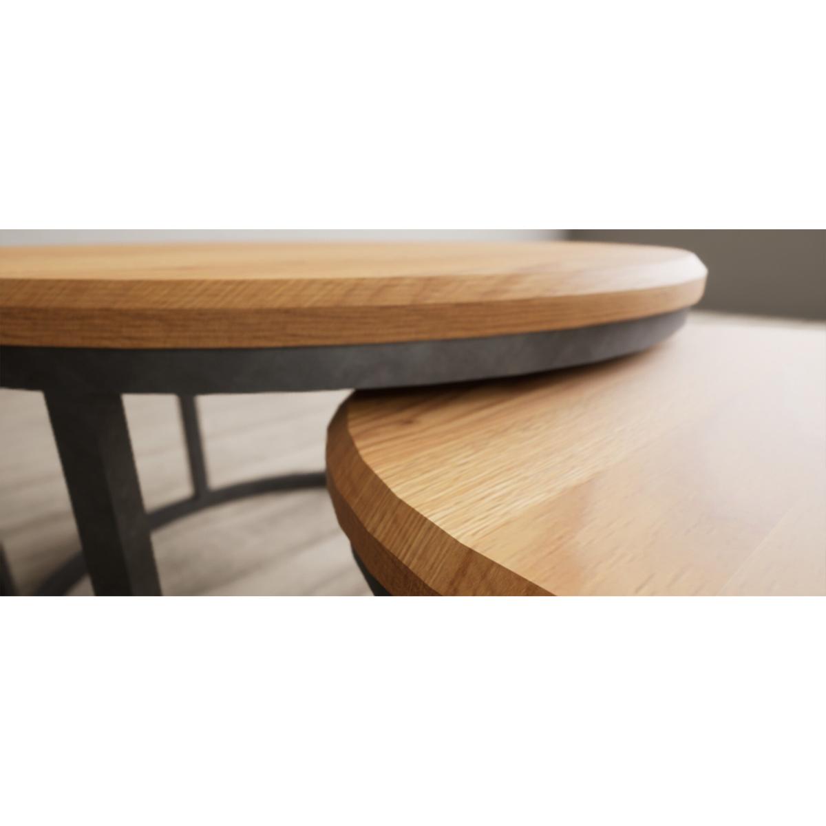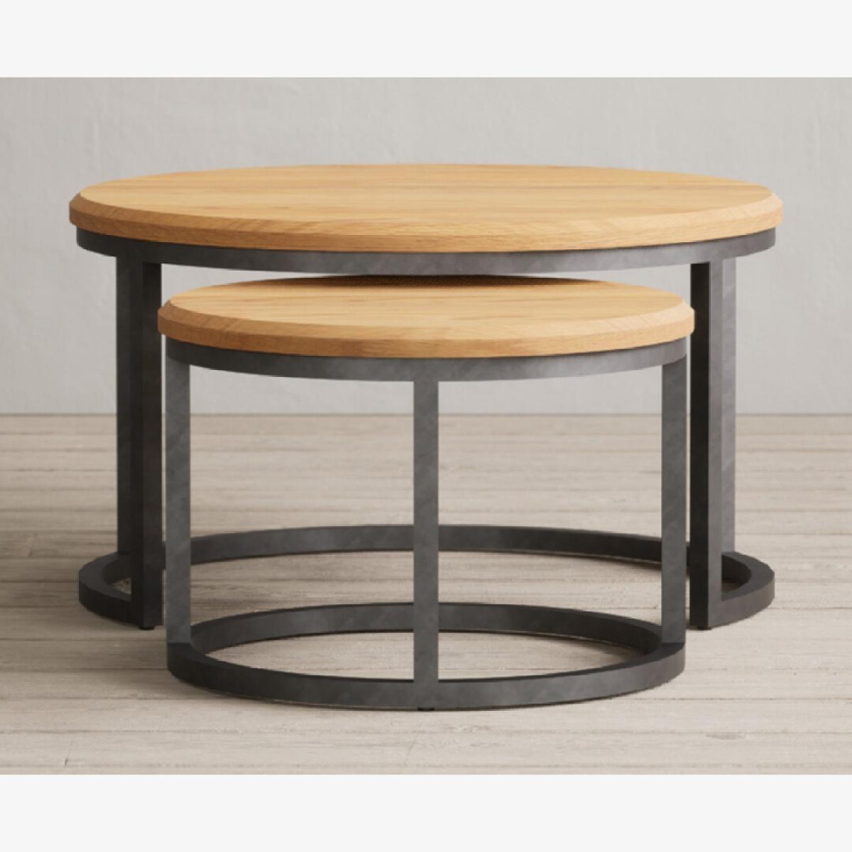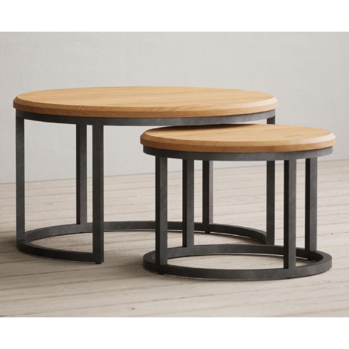 The Loft Solid Oak Round Nest of Tables is a set of two round solid oak tables with metal legs that nestle with one another when not in use.