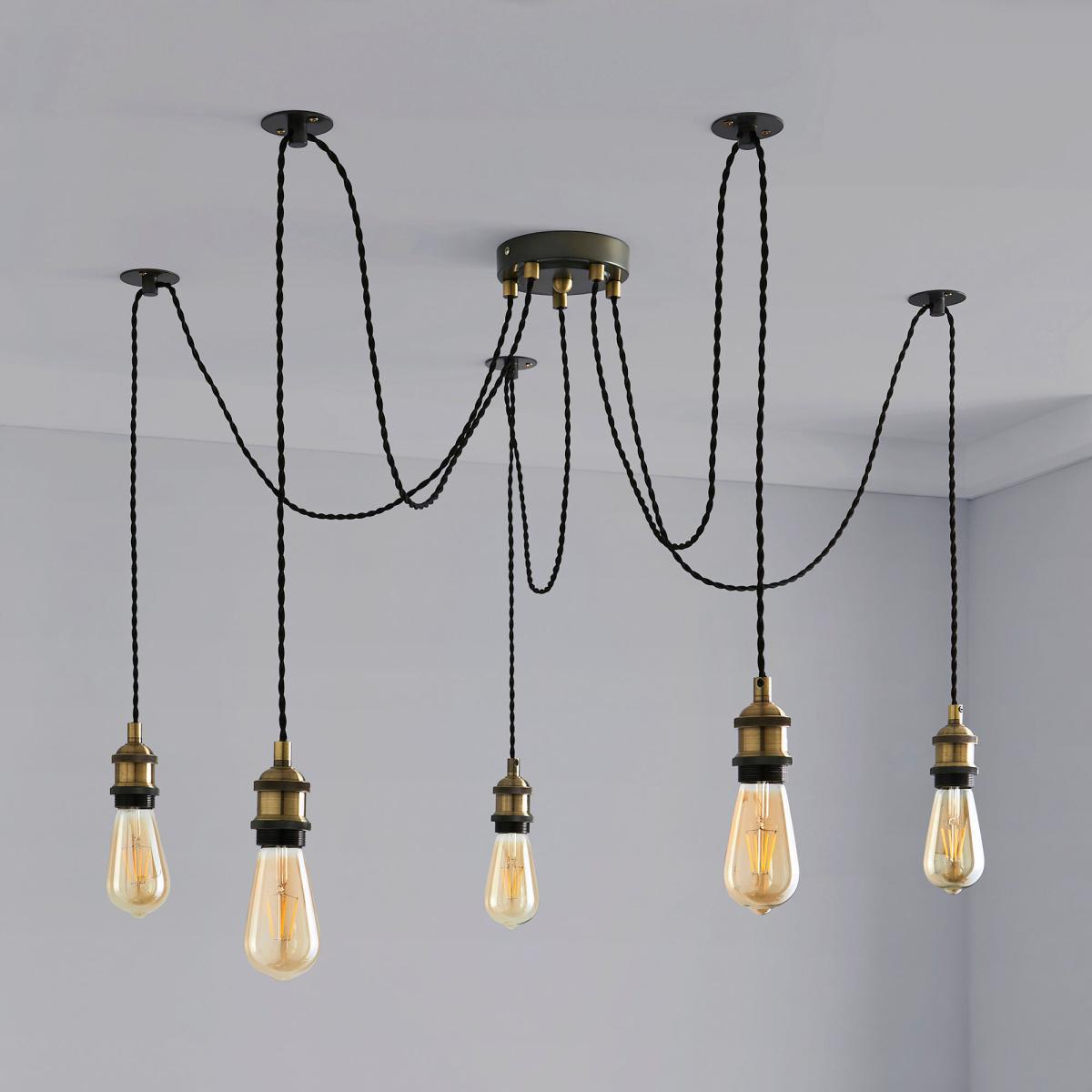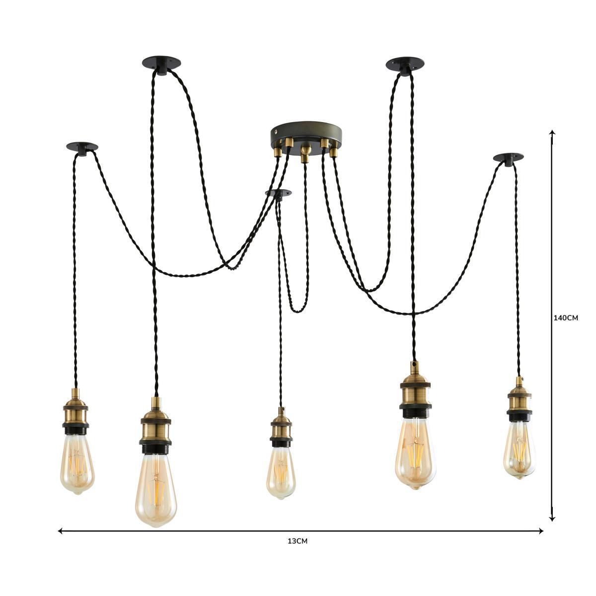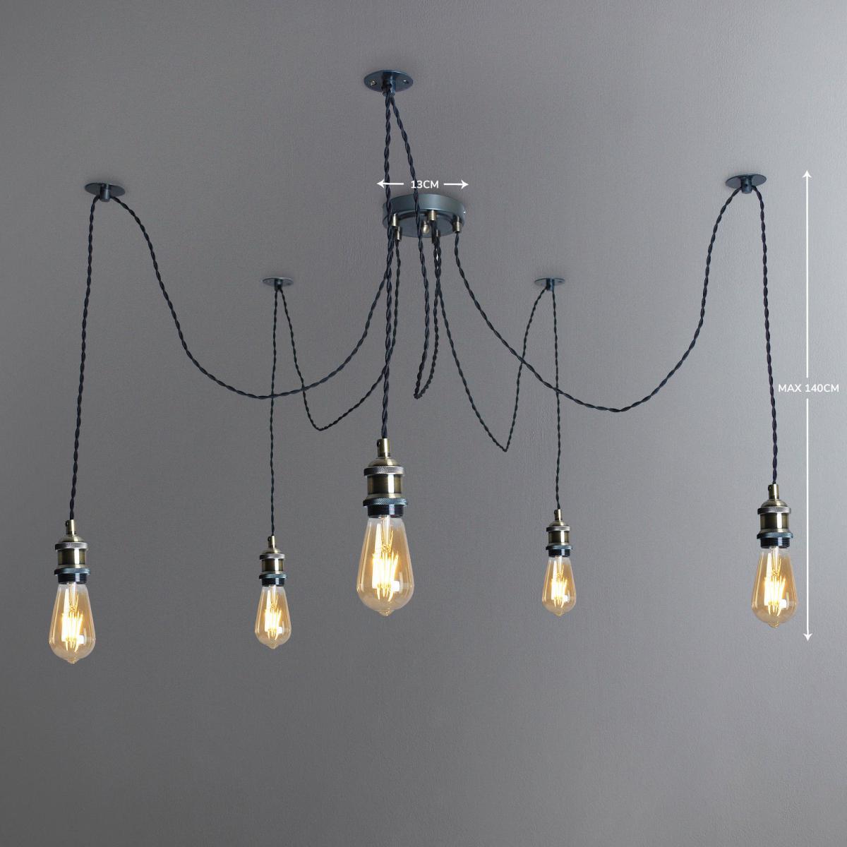 This industrial inspired logan spider fitting features a dark nickel painted finish and black fabric flex cables with an antique, brass detailing. Bulb holders and chords can be positioned easily by using the ceiling hooks provided. This light is adjustable in height and width. Please note: This fitting is supplied with 5 Edison Screw (ES) bulbs.