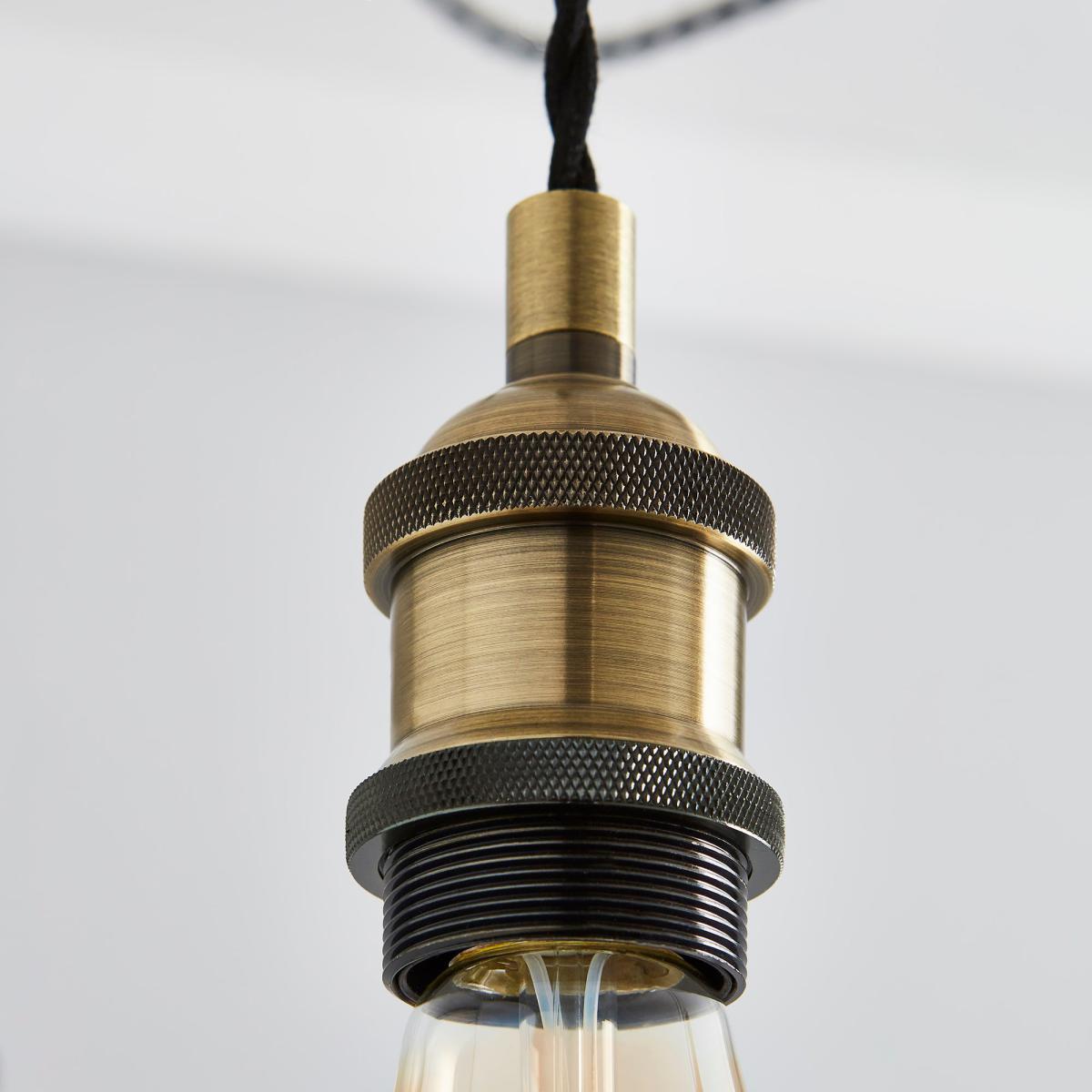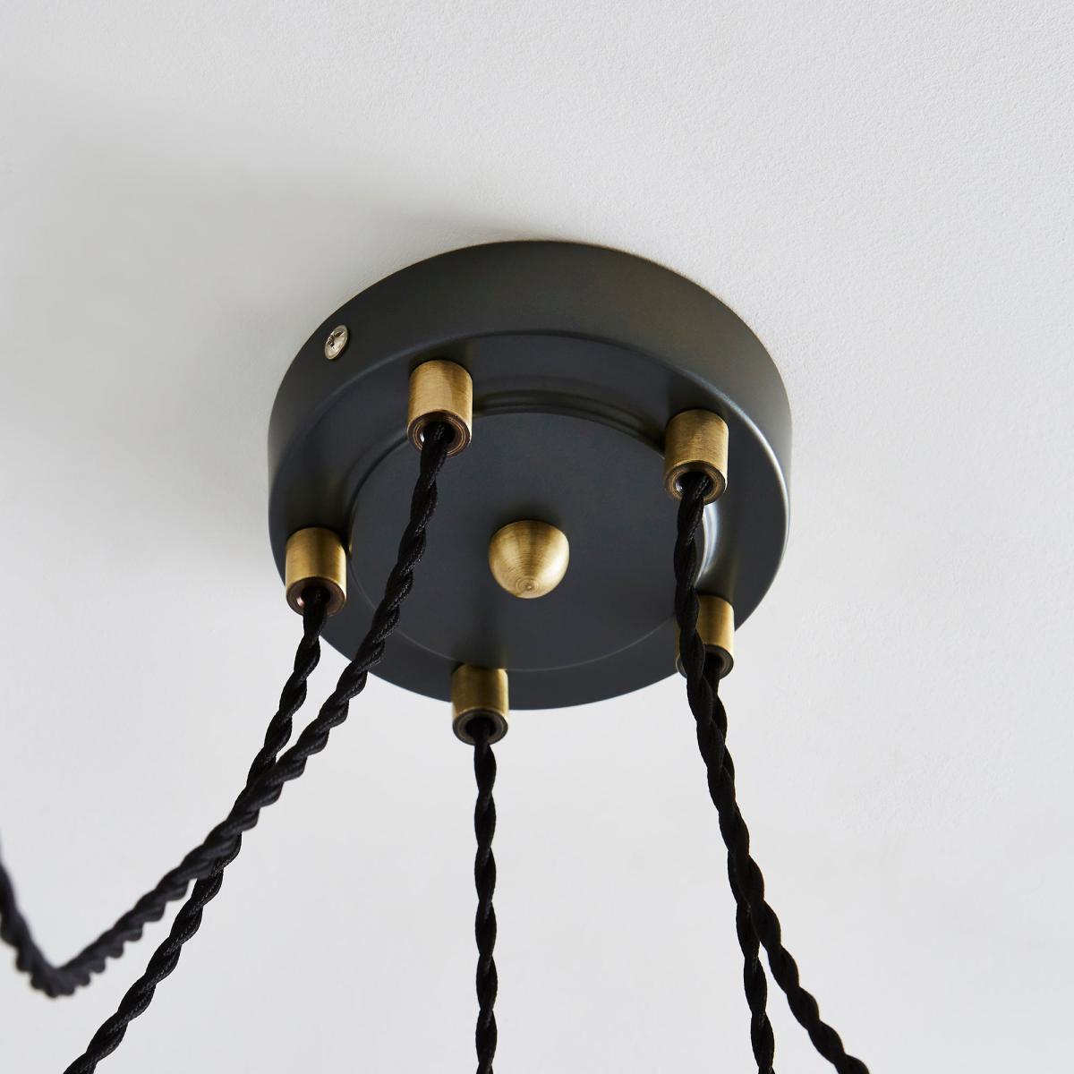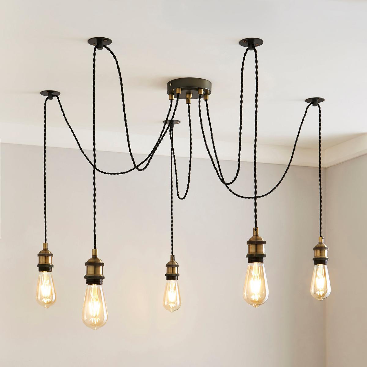 This industrial inspired logan spider fitting features a dark nickel painted finish and black fabric flex cables with an antique, brass detailing. Bulb holders and chords can be positioned easily by using the ceiling hooks provided. This light is adjustable in height and width. Please note: This fitting is supplied with 5 Edison Screw (ES) bulbs.