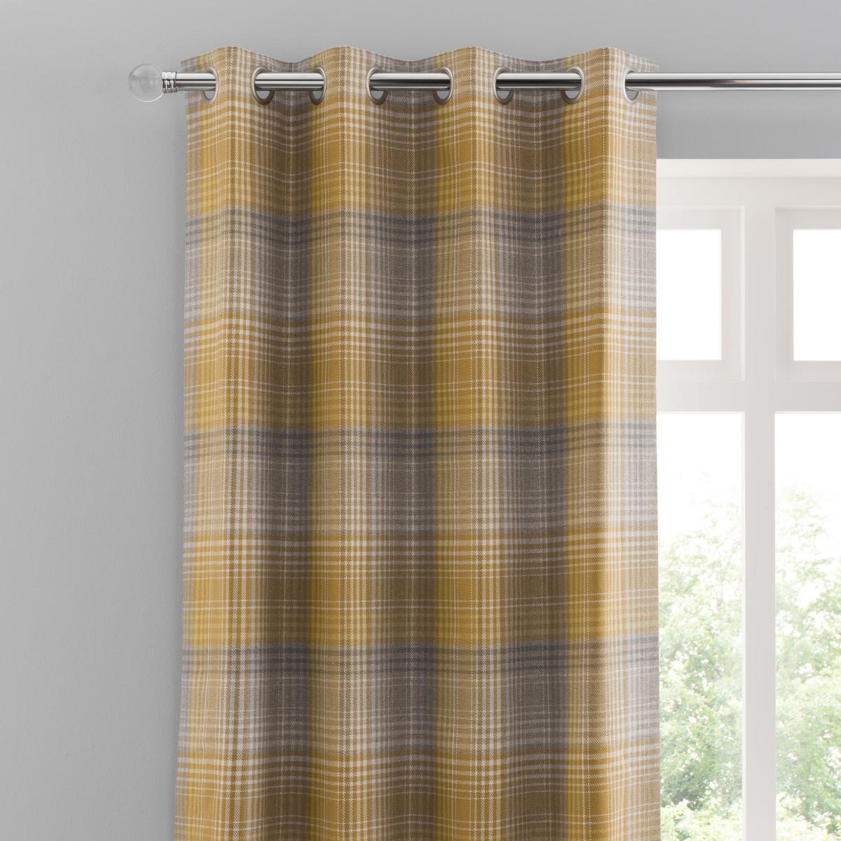 Logan Check Ochre Eyelet Curtains Yellow and Grey