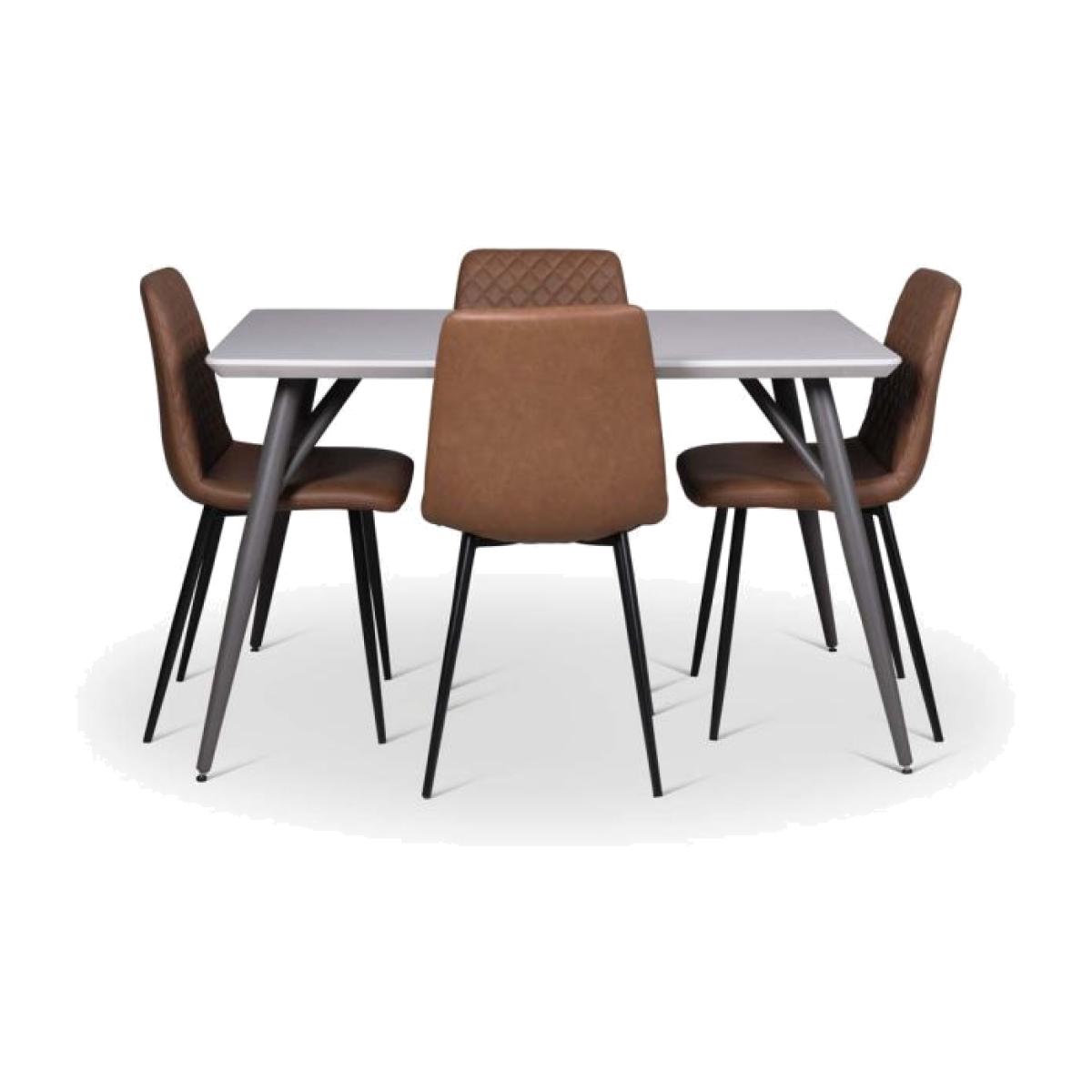 Sleek simplicity is the order of the day with our Logan Dining Table and four Ripley Dining Chairs in tan bundle. The table features glossy light grey top supported on four charcoal grey angled legs giving it an modern edge. The popular Ripley chairs are upholstered in a faux leather fabric with diamond quilted back detail and sit on top of modern black metal legs.