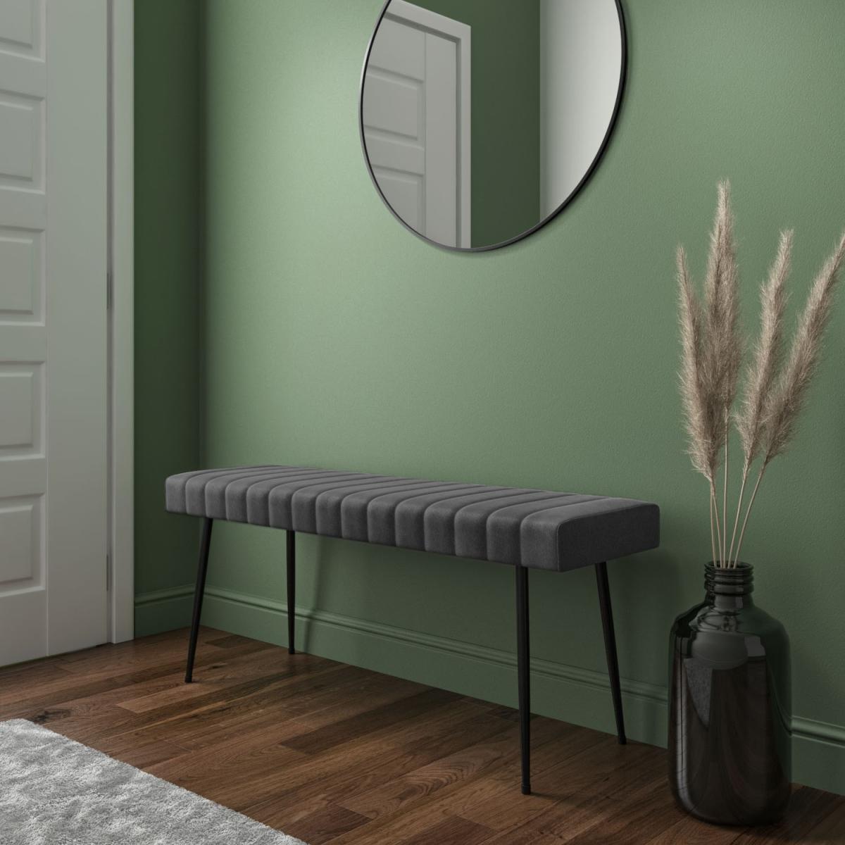 Luxuriously upholstered inslate greyfaux leather Vertical stitch detailing creates a contemporary finish Sleek and stylish piece, perfect for the modern home Could be used as a hallway bench or occasional seating Built with a sturdy construction for style that lasts Choice of matching chairs available in the Logan range Need to know Weight: 8.6kg Max supported weight: 150kg Colour: Slate grey Finish: Luxury slate grey faux leather Material: Faux leather with metal legs Assembly required: No Guarantee: 2 years
