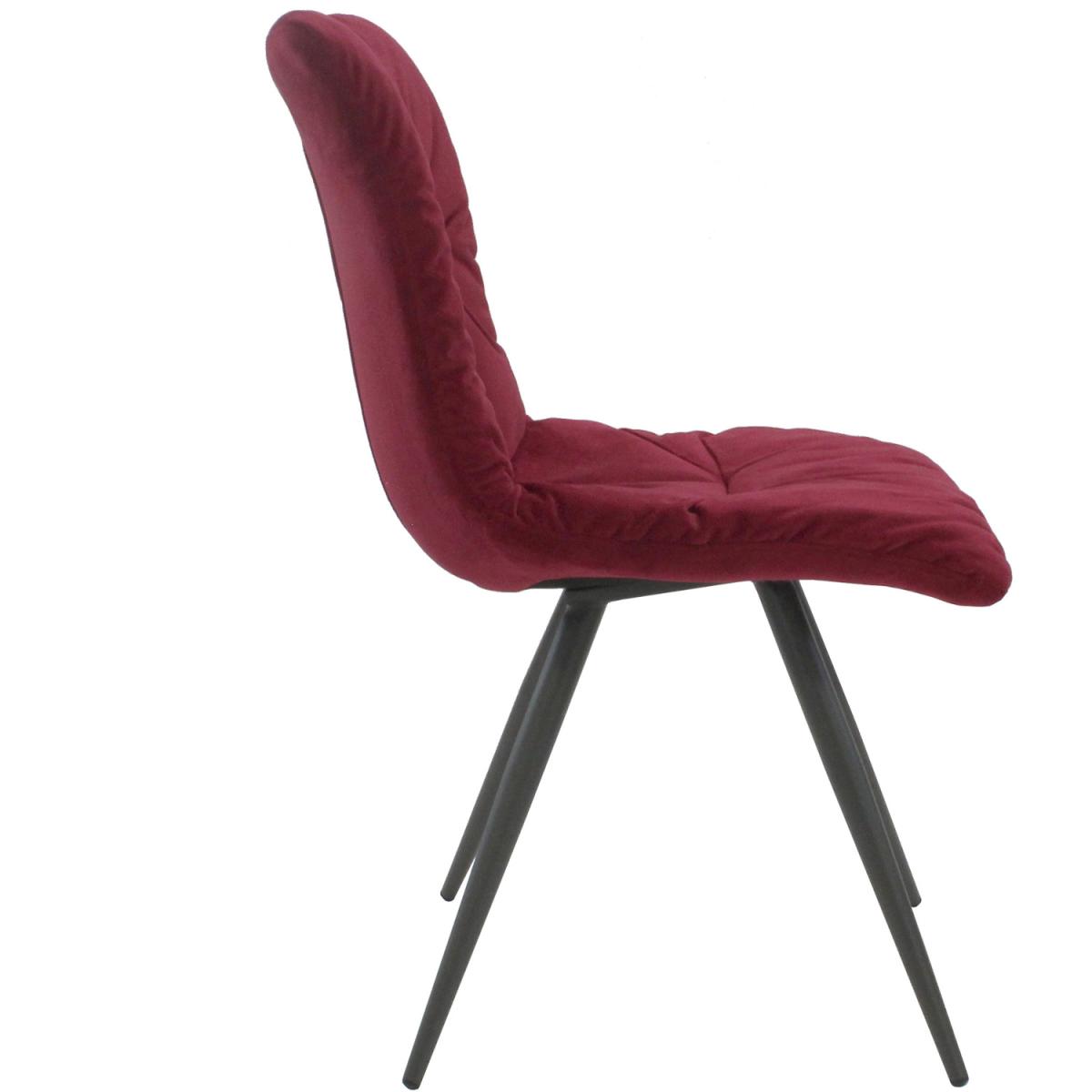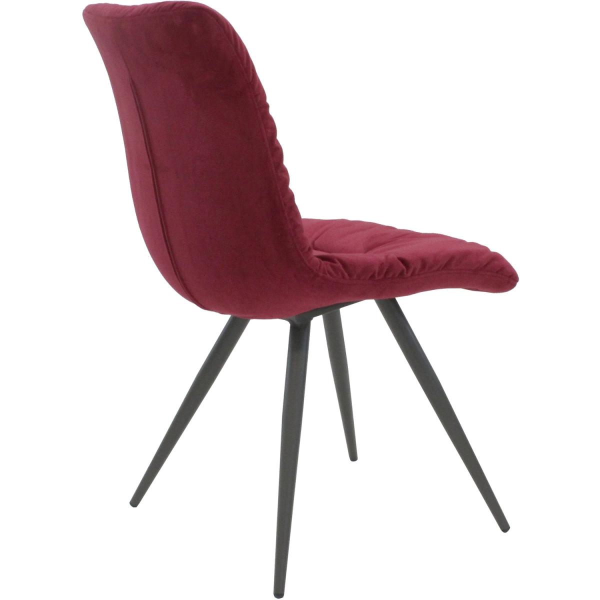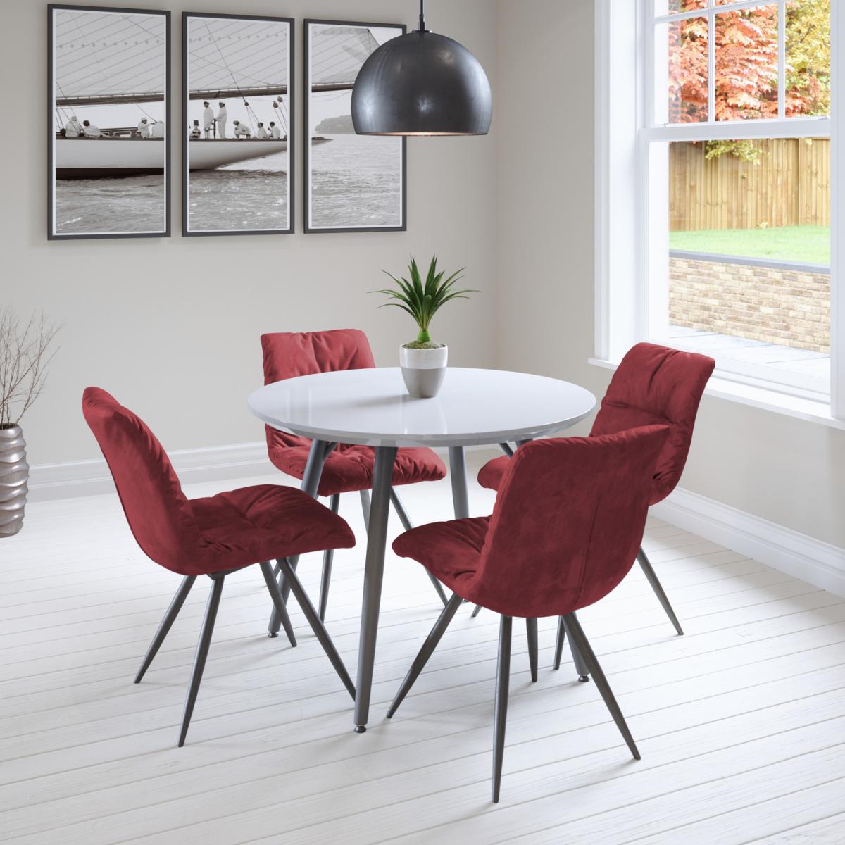 A light gloss modern round table with tubular legs that taper at the halfway point. The modern chairs have a sleek and flowing design with a plush velvet fabric effect creating an elegant impression. The steel legs taper at the halfway point to complement the design features.