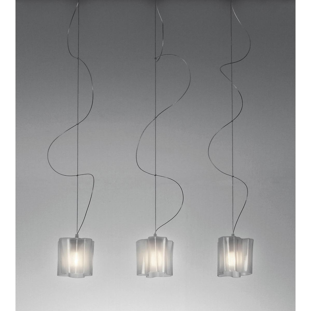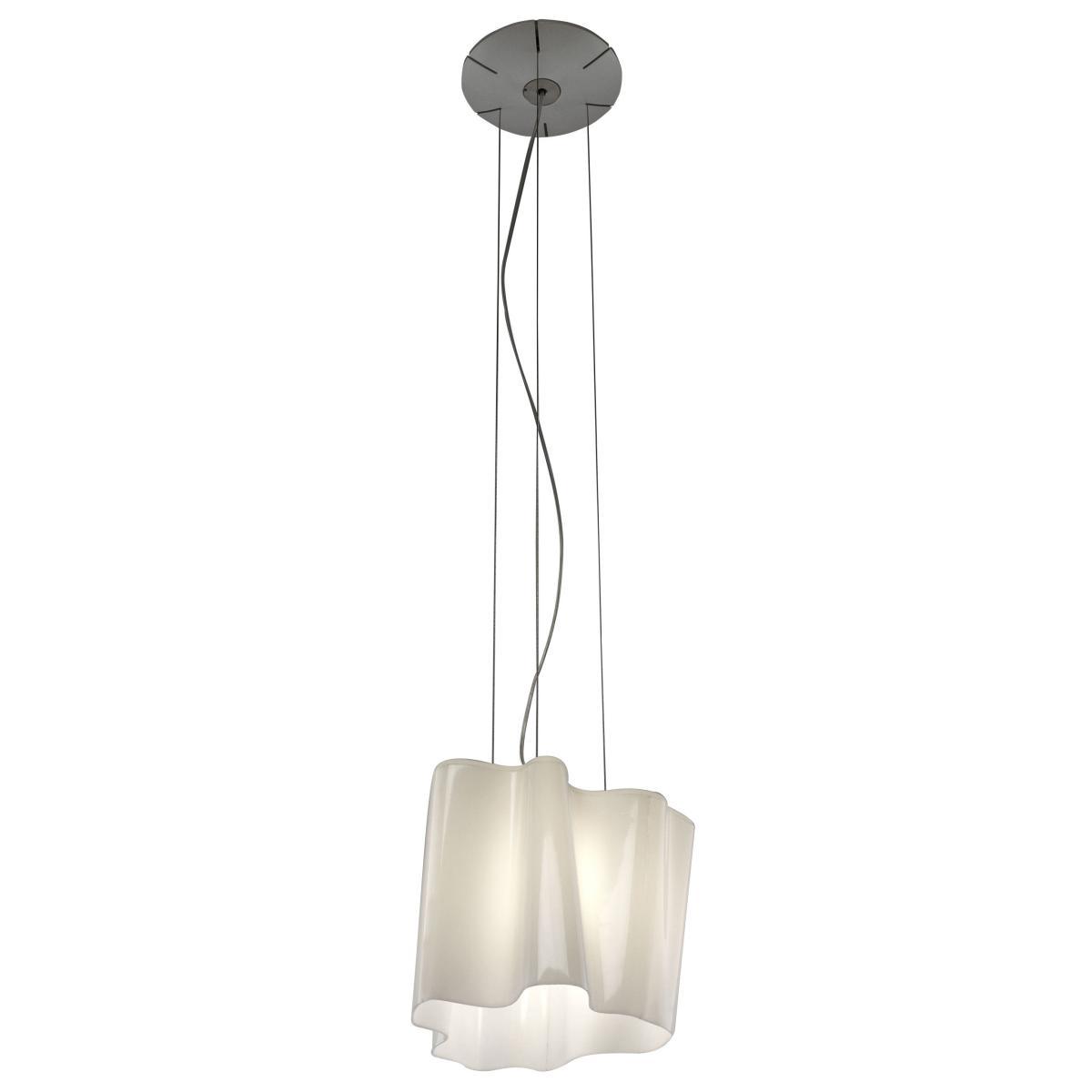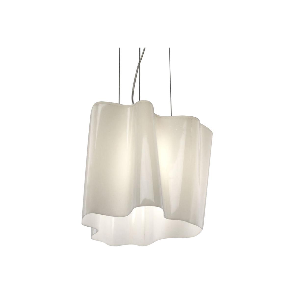 Logico is a magic suspension. This a true glass sculpture suspended in the space. Graceful and elegant, she is realized in blown glass with a finishing silk. This finishing consists in a dough mixture of glass with opaline salt divide up non uniform manner. The inferior edge of the broadcaster is cut to the diamond. Logico dresses the space of his line sinueuse and harmonious. She suits all the private places (living room, cooks,. ) or public (hotels, restaurants, commercial local,. ). Logico is proposed in two dimensions: width 40 or 24 cm. It exists equally other versions with combinations in line or to 120 ° of this basic element.