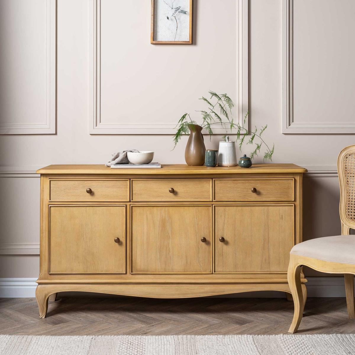 I love the Loire sideboard for its warm mindi finish and simple, sturdy lines - it sits equally well in classic country schemes or pared-back Scandi interiors. The three drawers and triple-door cabinet offer flexible storage for tableware, linens or home-office bits, so you can keep surfaces clear and clutter out of sight. Styling-wise, keep the top minimal: hang a round mirror or slim artwork above, then add a couple of ceramic vases or a small potted plant for texture. Inside the cupboards, pop in woven baskets or fabric boxes to organise smaller items and make the most of the generous depth without hiding the elegant curved apron and legs.