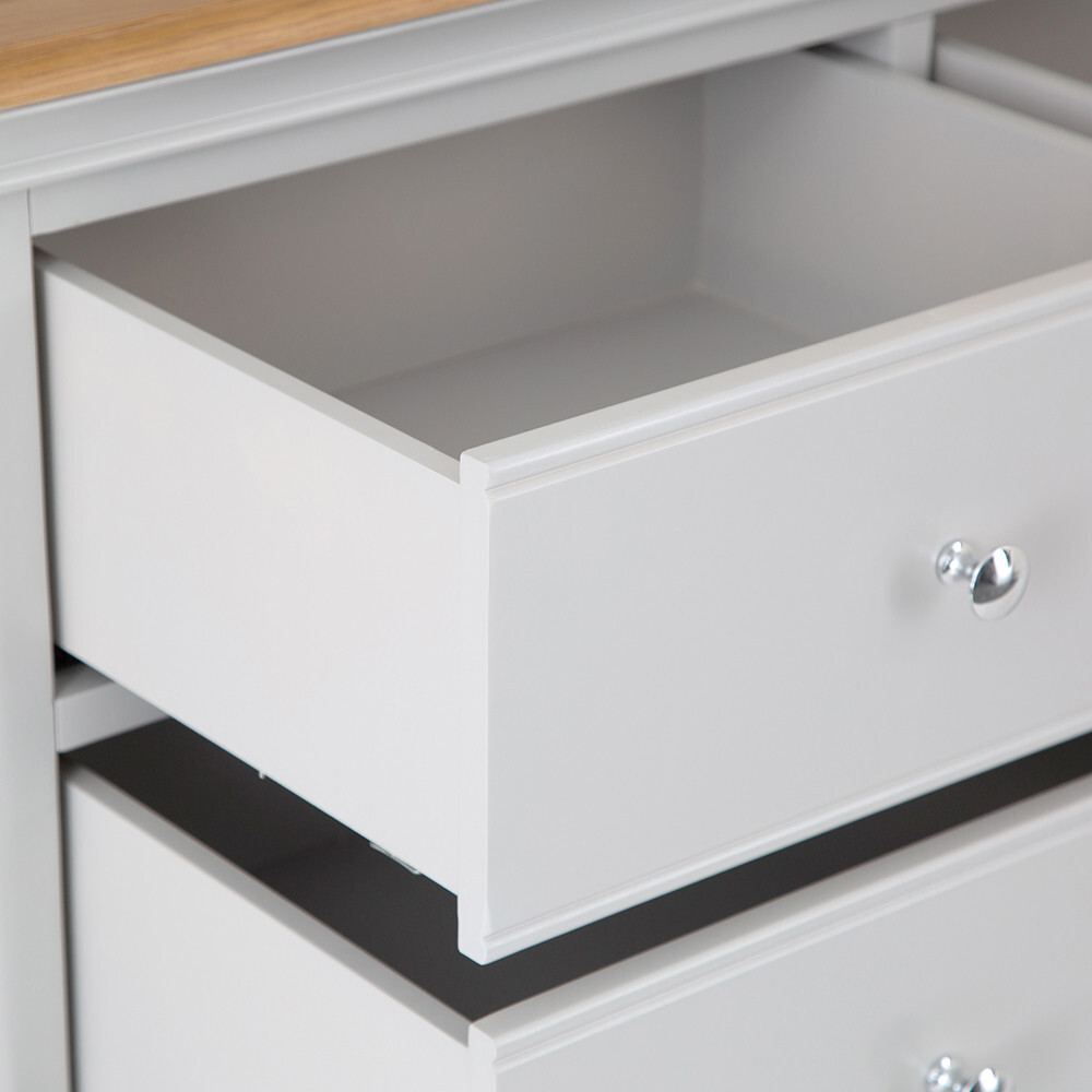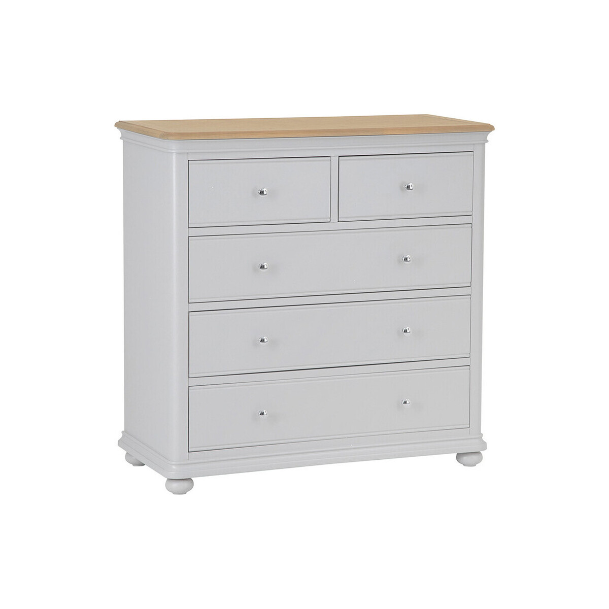 The Lola 2 Over 3 Drawer Chest is an elegant yet sturdy addition to your bedroom. Stylish and practical, the chest of drawers features a durable frame with a soft grey painted finish contrasting with a natural wood top and offers plenty of storage in its 5 drawers with chrome effect knobs. Elegant and sturdy 5 drawer chest. Durable frame with soft grey painted finish. Natural wood top for a stunning two-toned look. Soft-close drawers with hidden runners. Rounded corners with bevel detailing. Brushed chrome effect knobs complete the look. Fully assembled. Matches with other pieces from the Lola collection.