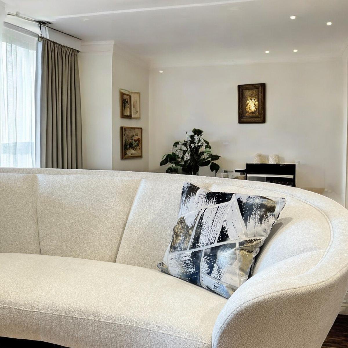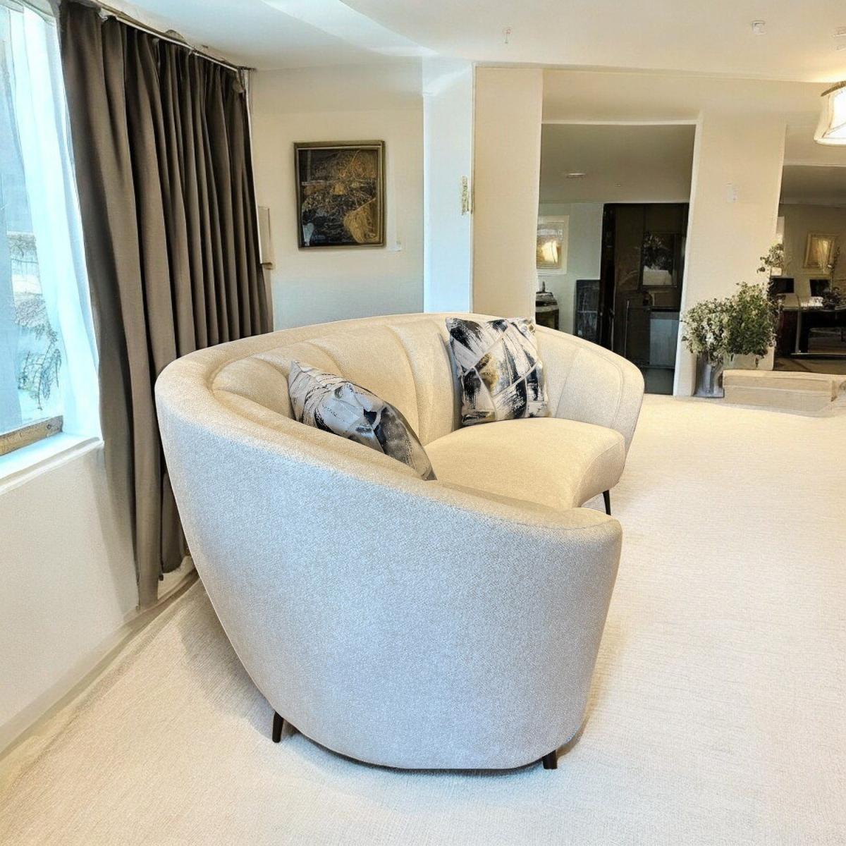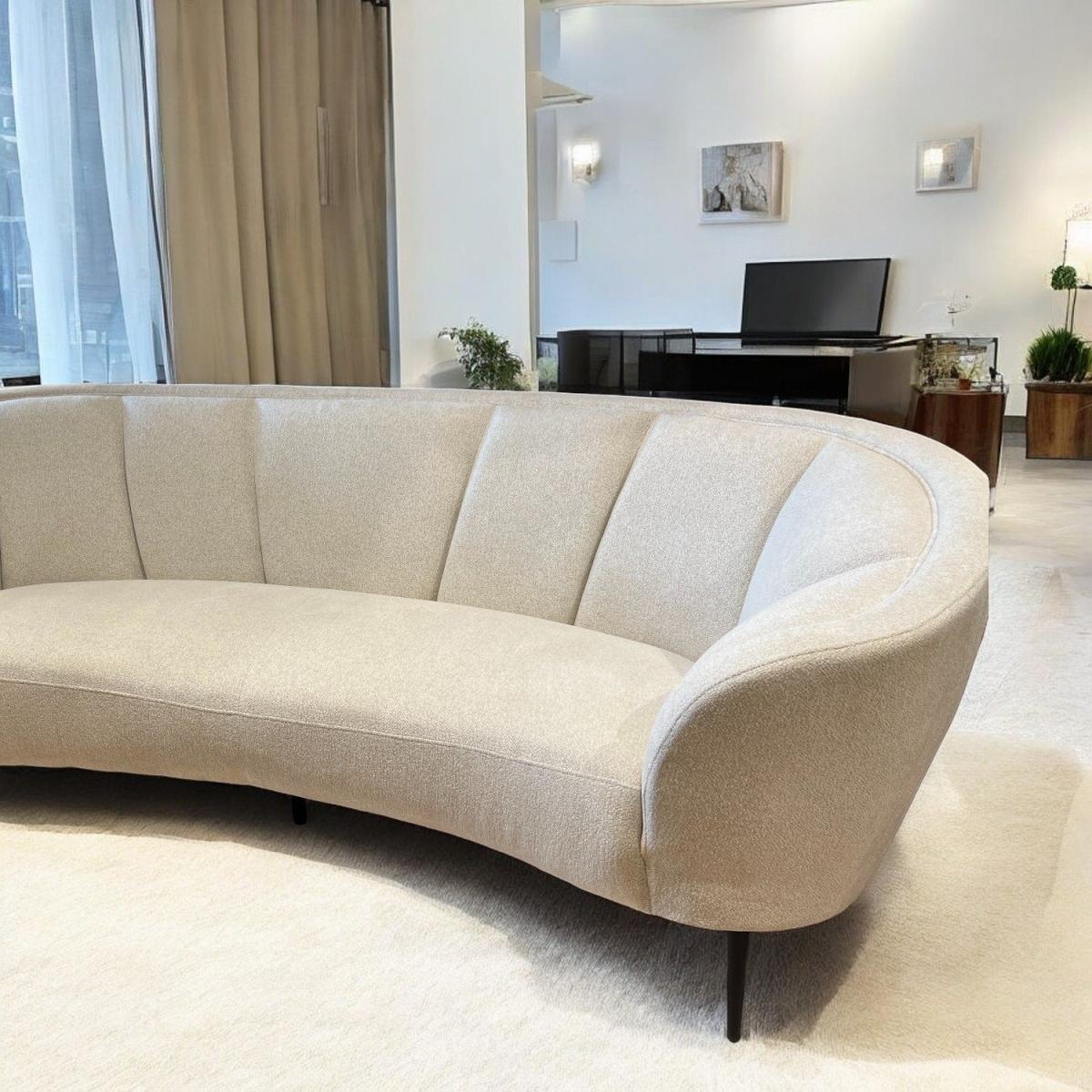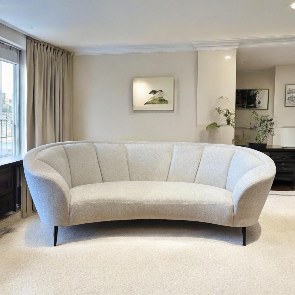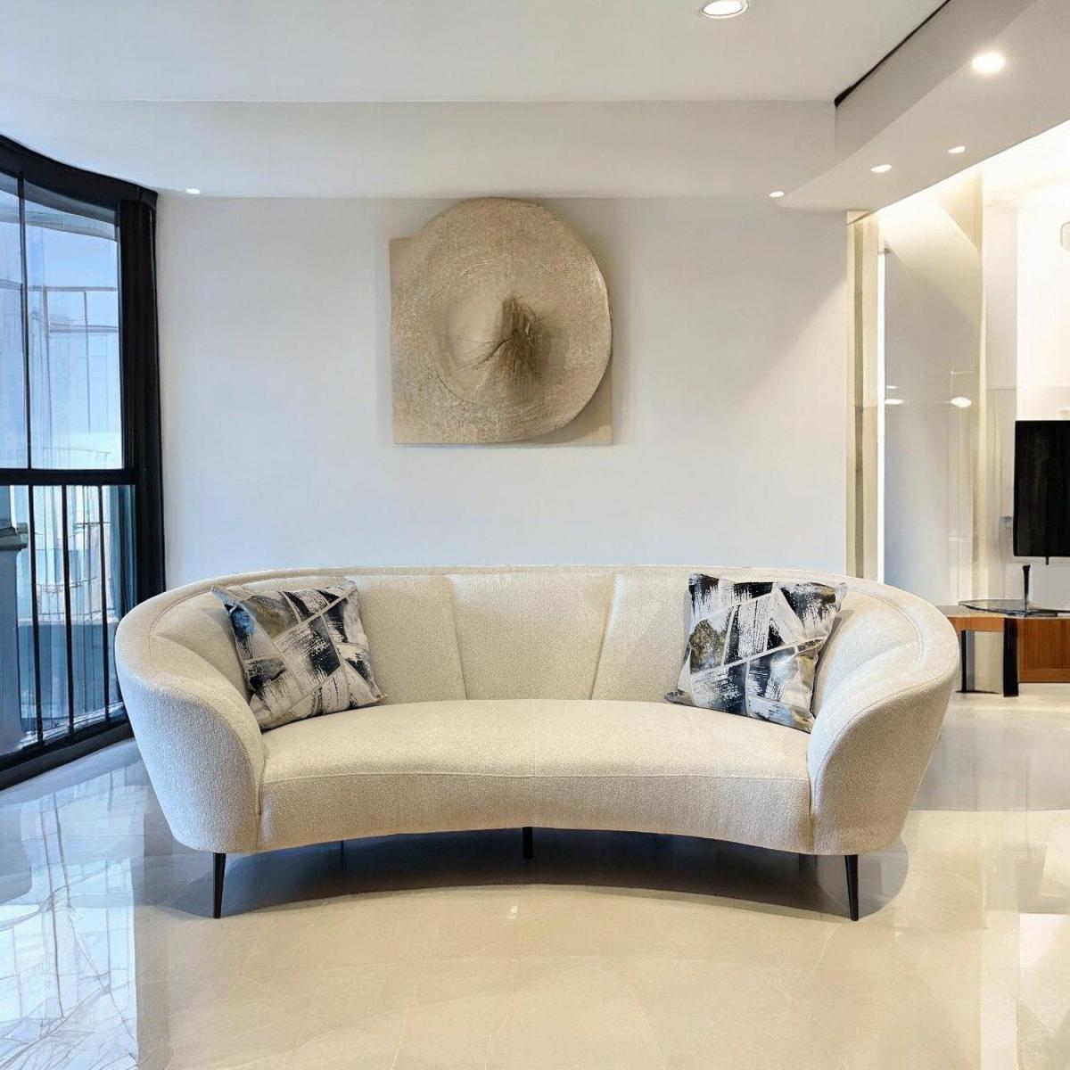 The Lola Sofa is the modern answer to ultimate relaxation. This comfortable three seater sofa combines curved edges with plush cushioning to create a couch that feels like it's giving you a hug. With thin black metal legs and white fabric, this sofa really brings contemporary design at its best to your living room.