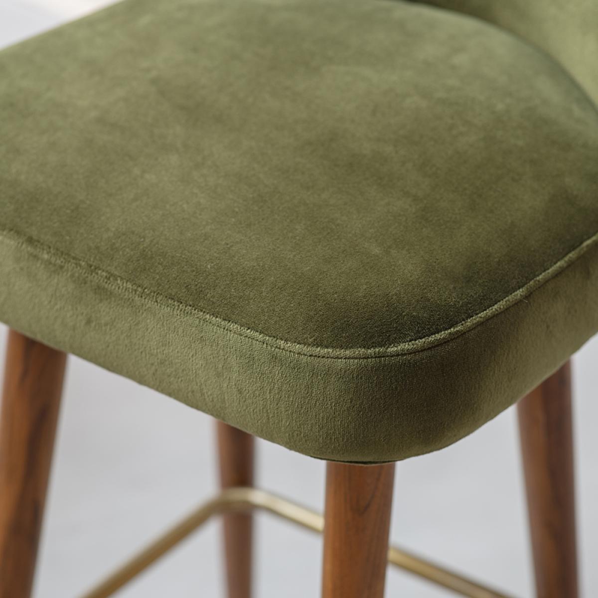 Perfect for casual dining and entertaining, our Lola Barstool in Deep Green is a mid-century inspired velvet green barstool with supportive backrest. The solid wooden frame is strong and sturdy while the upholstered luxurious cotton velvet seat and back offer premium comfort and support. Great for kitchen islands and breakfast bars, the stool features a brass metal detail on the base while its elegant silhouette is finished beautifully with refined and tapered legs with a contemporary mid wood finish that effortlessly matches both traditional and more modern room schemes. We love this deep green – it works as an alternative to grey as a colour that goes with most colours and interior schemes – it feels rich and luxurious yet fresh and new. Place at the end of your kitchen island for guests to sit back, relax, and chat – because everyone knows all the best conversations happen in the kitchen!