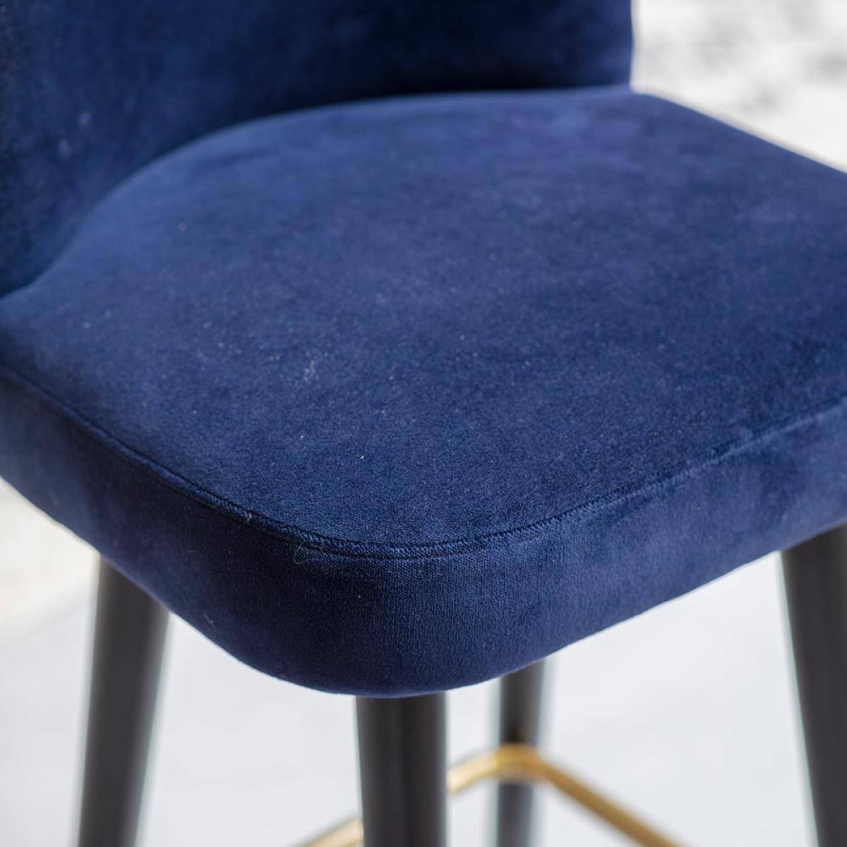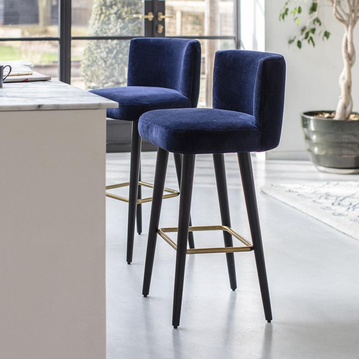Perfect for casual dining and entertaining, our Lola Barstool in Midnight Blue is a mid-century inspired velvet deep blue barstool with supportive backrest. The solid wooden frame is strong and sturdy while the upholstered luxurious cotton velvet seat and back offer premium comfort and support. Great for kitchen islands and breakfast bars, the stool features a brass metal detail on the base while its elegant silhouette is finished beautifully with refined and tapered legs with a contemporary black stained wood finish that effortlessly matches both traditional and more modern room schemes. Place at the end of your kitchen island for guests to sit back, relax, and chat – because everyone knows all the best conversations happen in the kitchen! Place at the end of your kitchen island for guests to sit back, relax, and chat – because everyone knows all the best conversations happen in the kitchen!