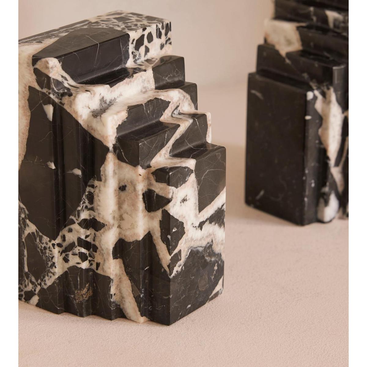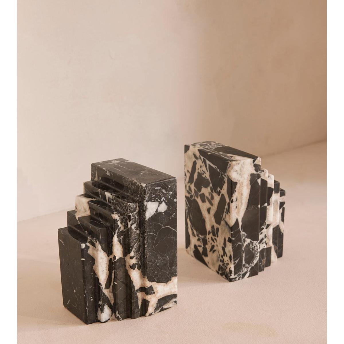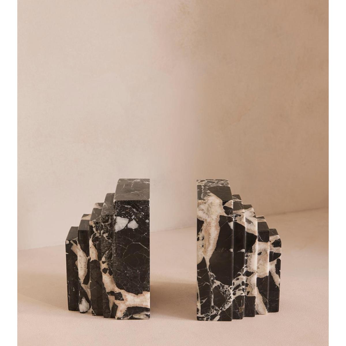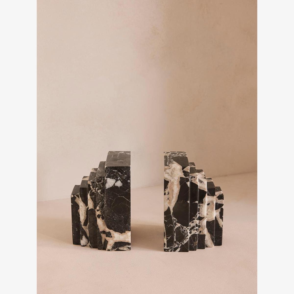 A unique, stepped silhouette crafted from Black Bulgari marble is enhanced by its starkly contrasting natural veining. The stepped design of our Lola bookends takes inspiration from the architecture of Soho House Rome, as well as the many marble finishes found inside. Crafted from Black Bulgari marble, each piece is unique with starkly contrasting black-and-white veining veining that adds beautiful depth to your bookshelf display.