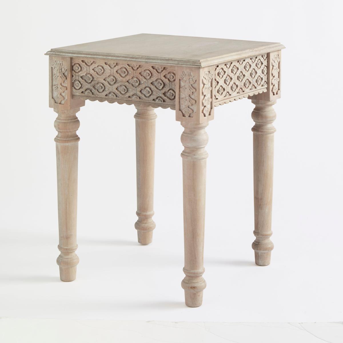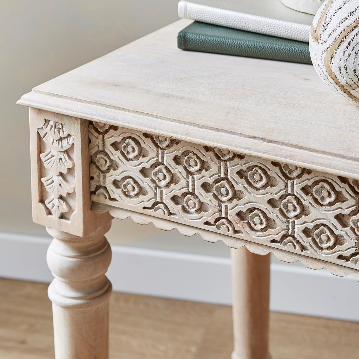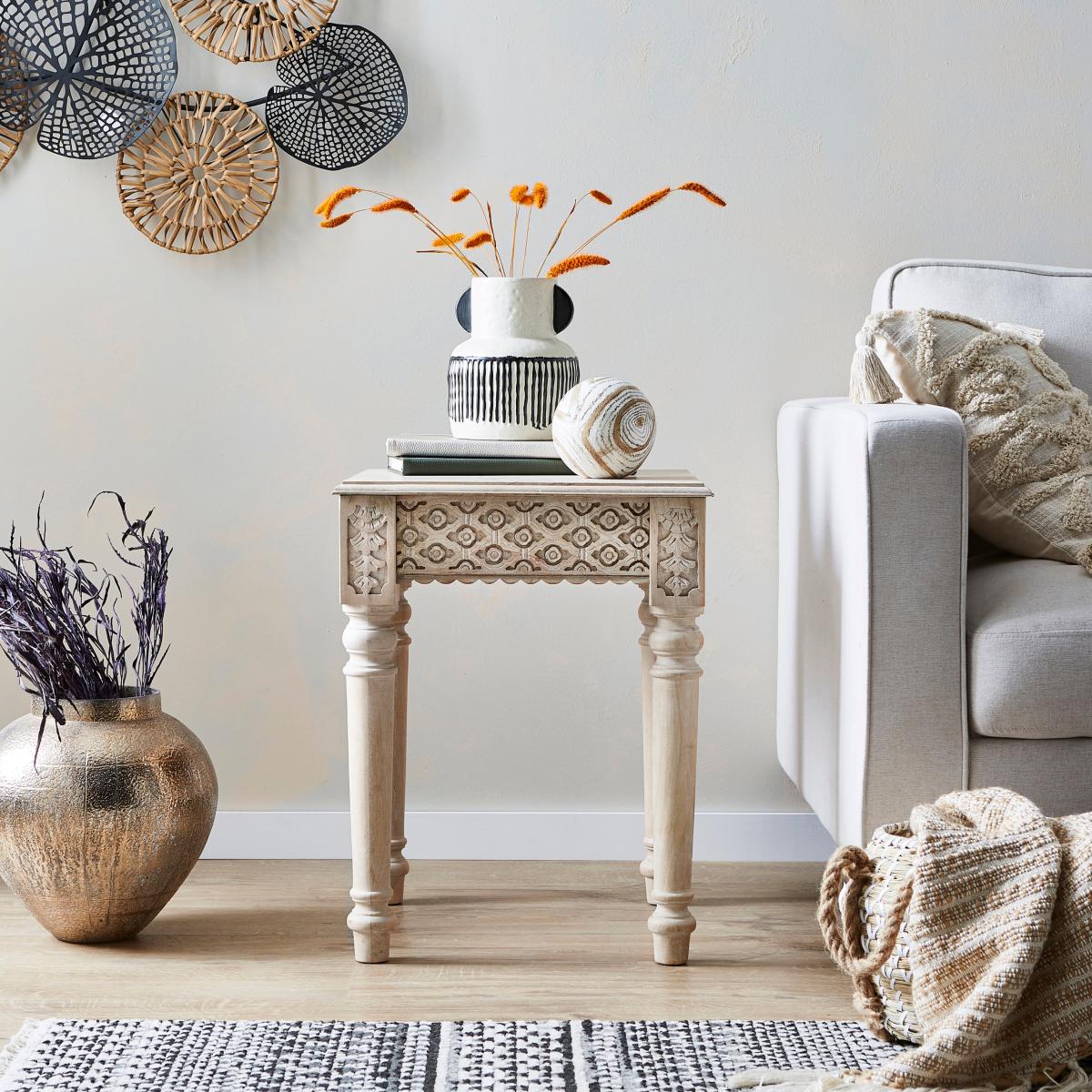 I love the Lolita Carved Side Table for its blend of natural mango wood warmth and subtle craftsmanship, making it a versatile piece that can complement both modern and traditional interiors. Its neutral white finish allows it to sit seamlessly in a neutral palette, while the carved detailing adds visual interest without overwhelming the space. This side table works particularly well in boho, coastal, or Scandinavian styles, where it can be styled with contemporary lamps, small decorative objects, or plants. Practical styling tips include pairing it with a table lamp and a favourite book or adding a small tray for daytime essentials, making it both aesthetically pleasing and functional in living rooms or bedrooms.